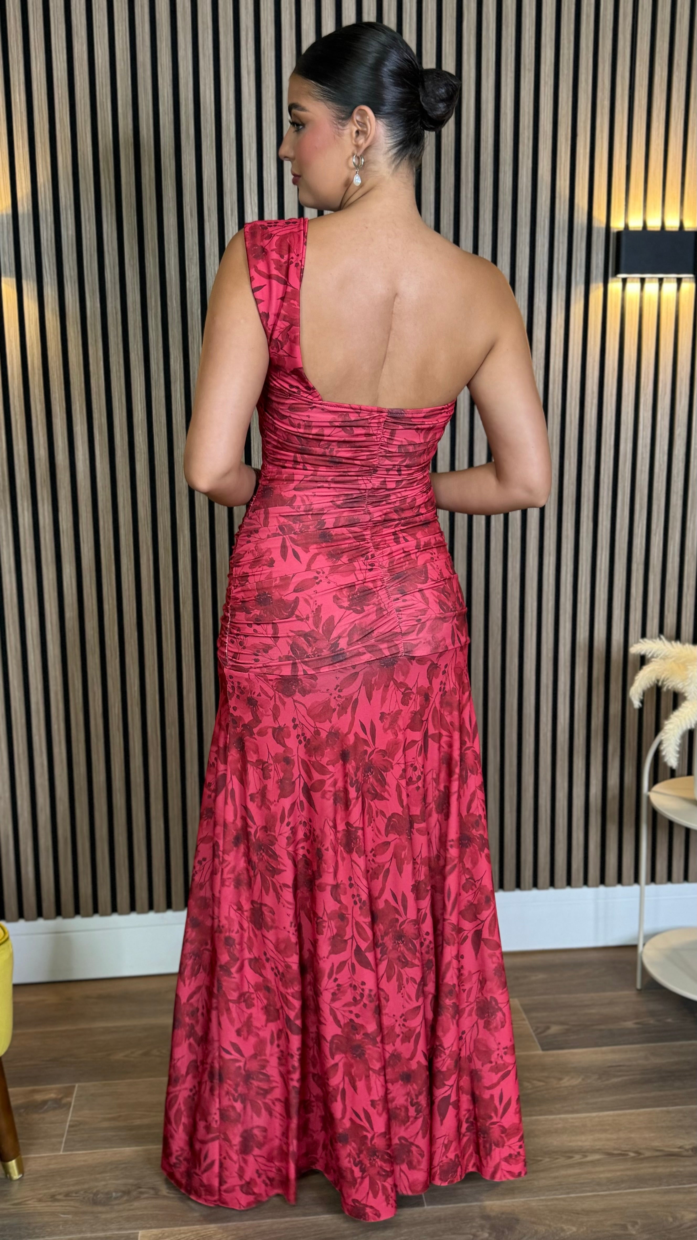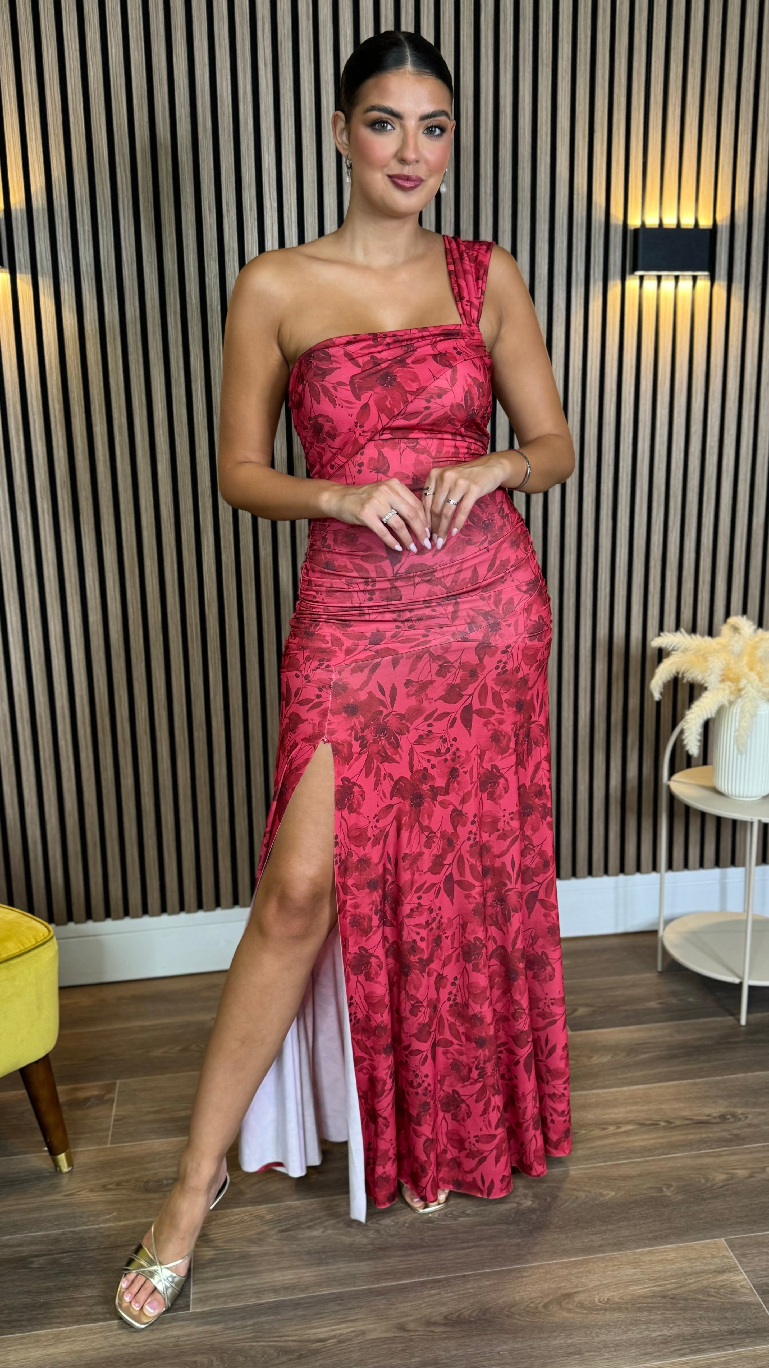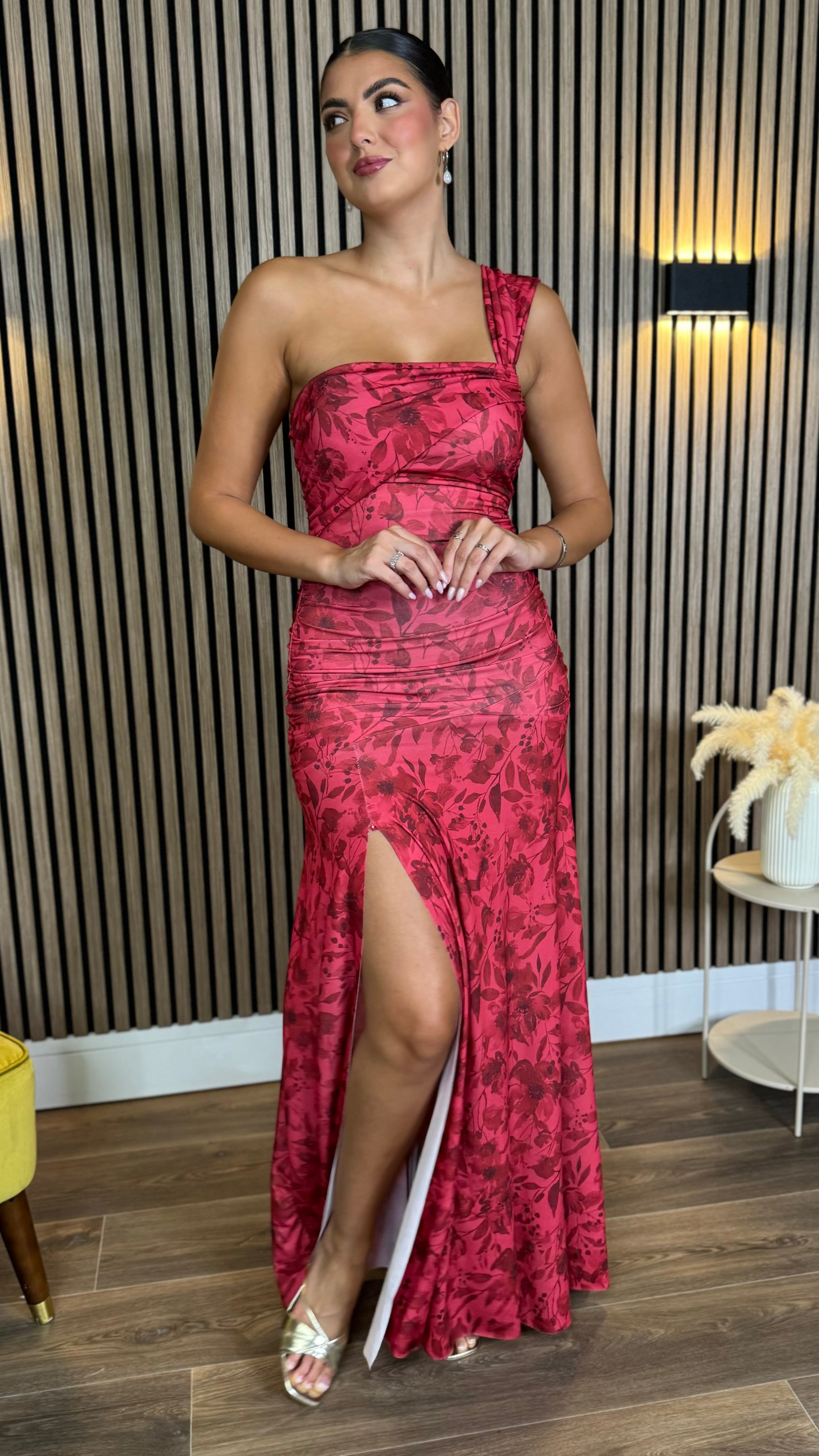 Janice Red Floral One Shoulder Cupped Ruched Slit Detail Maxi Dress