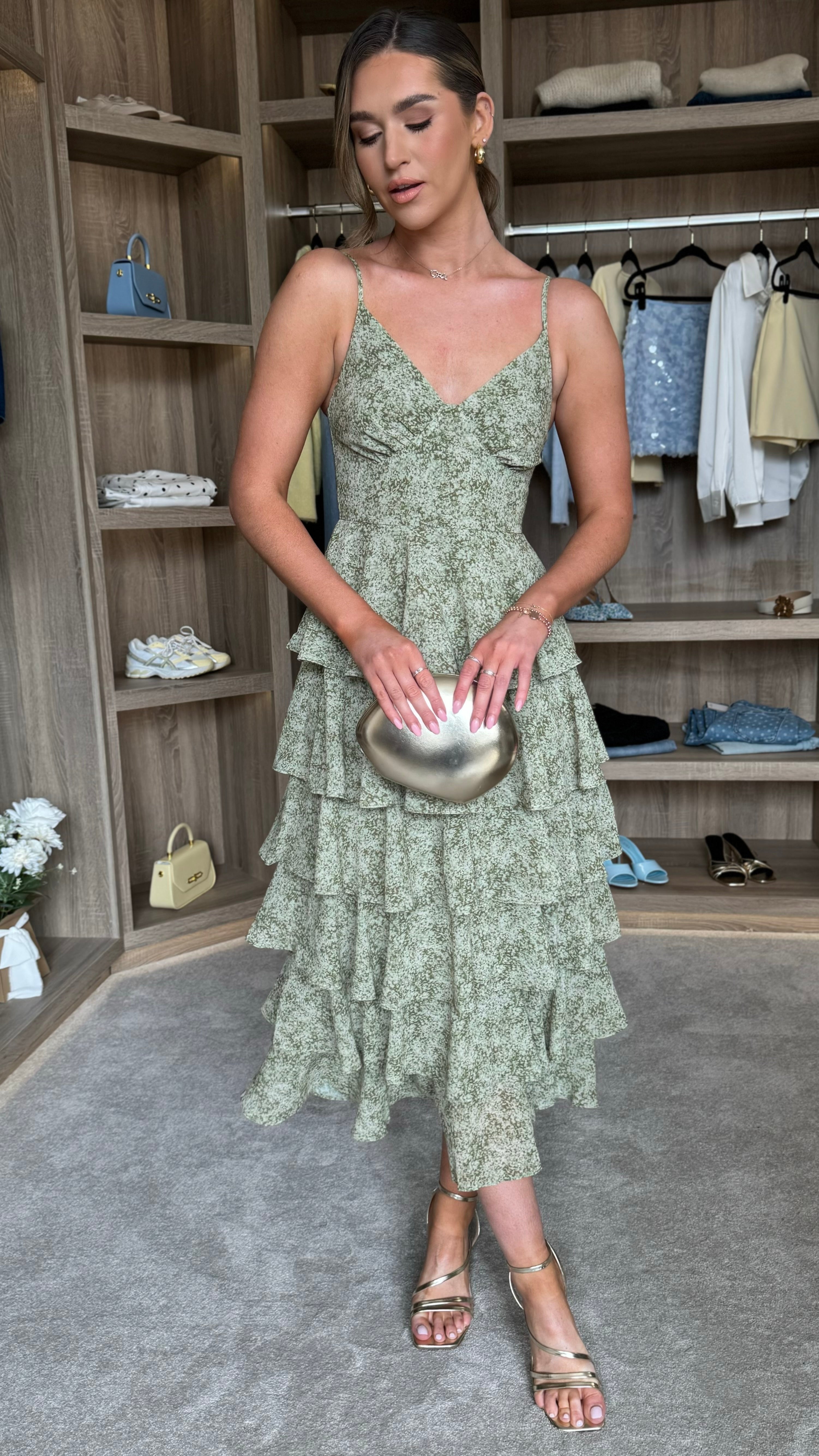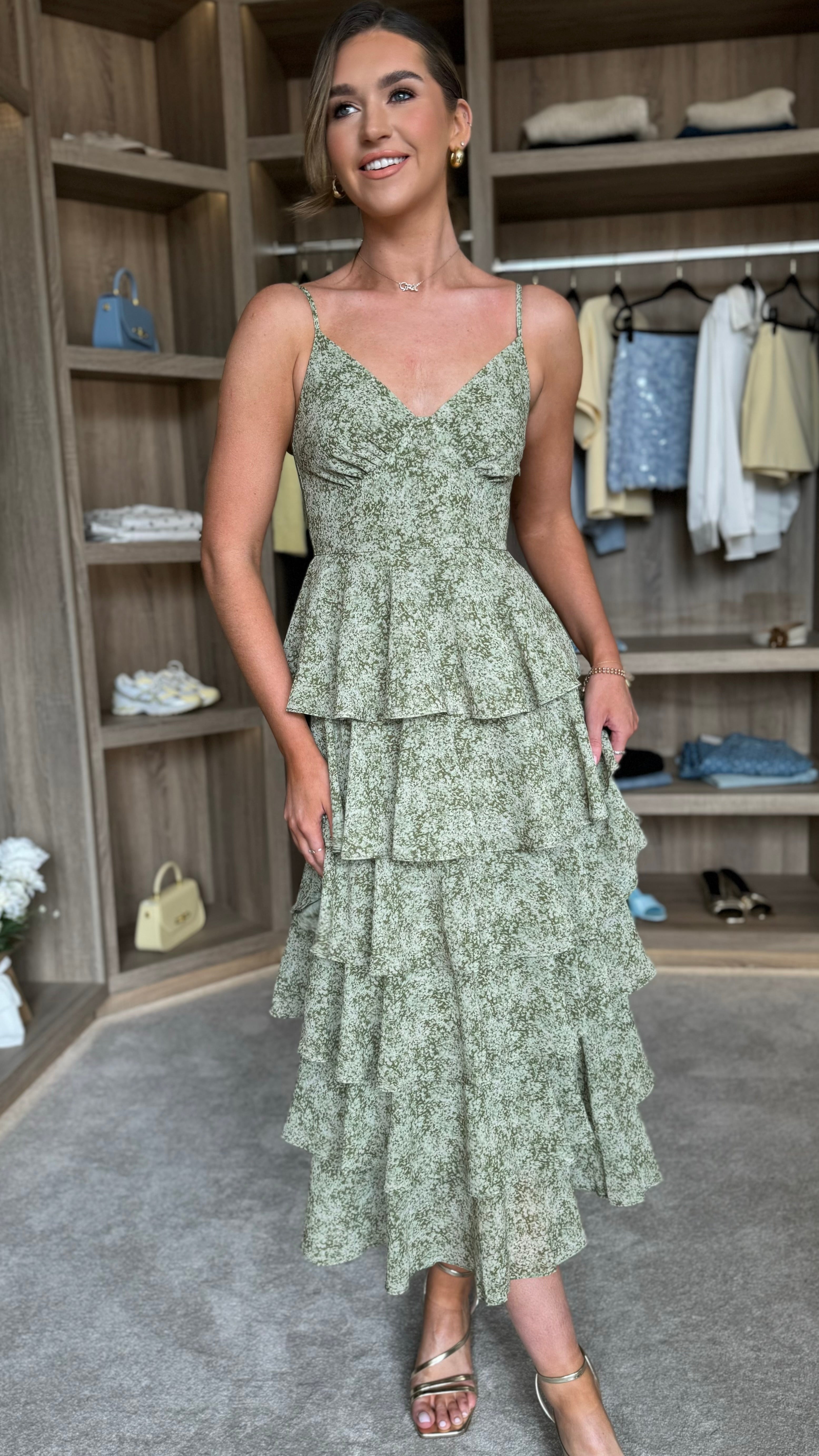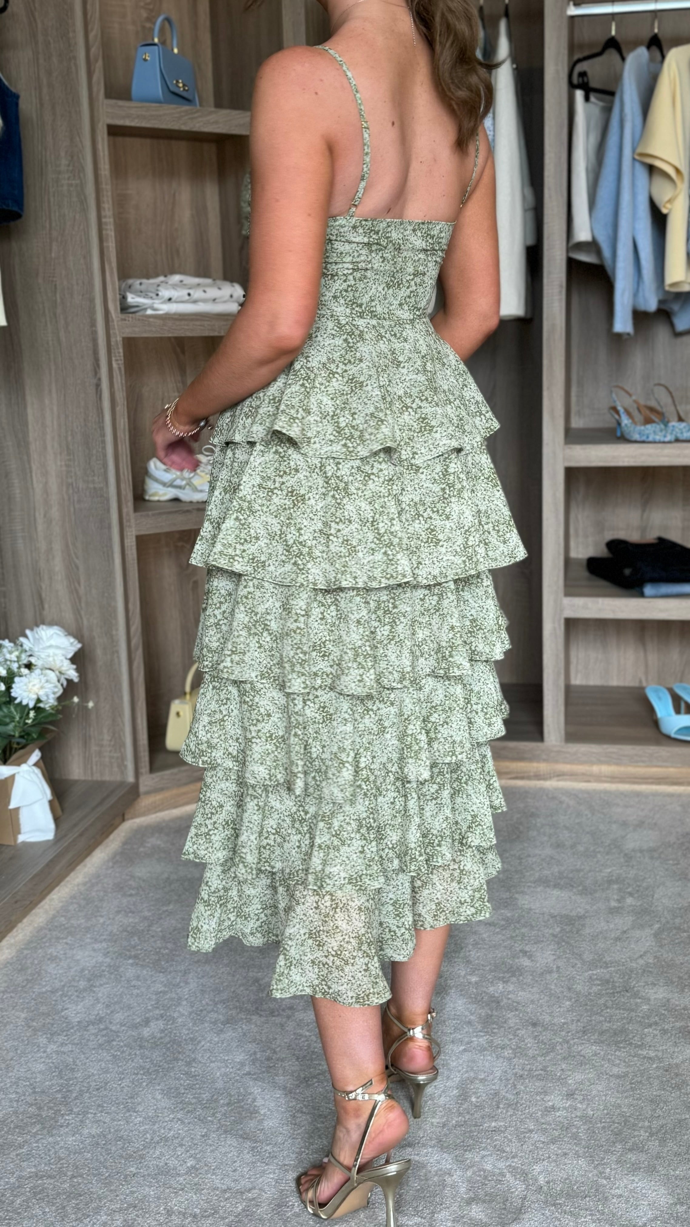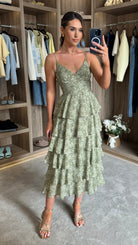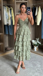 Elevate your everyday elegance with the Annika Green Ruffle Midaxi Dress. Designed with delicate cami straps and a flattering V neckline, this piece combines refined femininity with practical style. Subtle under-bust detailing creates a sculpted silhouette, while playful ruffle accents add movement and visual interest. The concealed zip fastening ensures a seamless, polished finish from front to back. Perfect for occasions that call for understated sophistication.