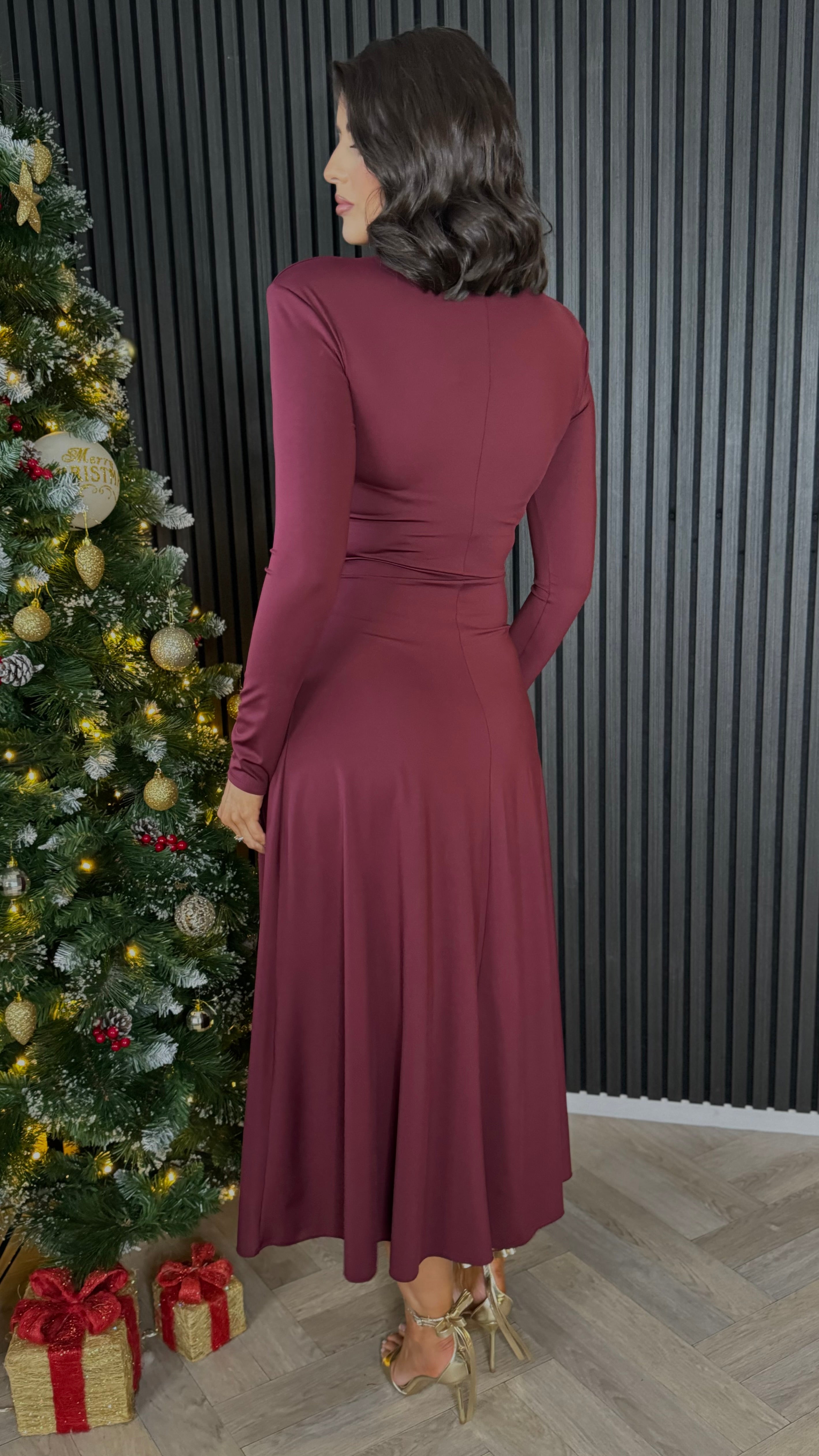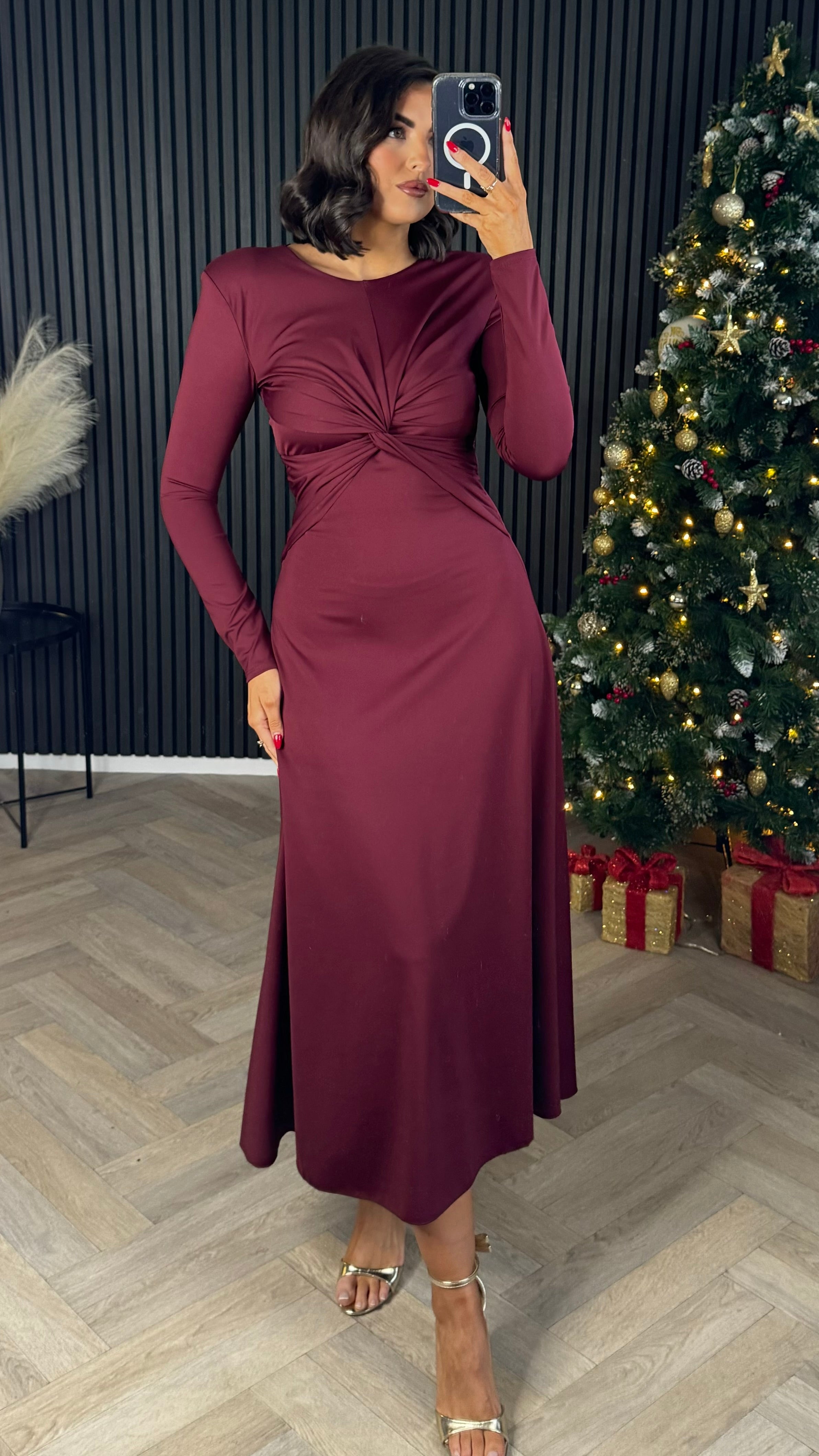 April Burgundy Long Sleeve Twist Detail Midi Dress
