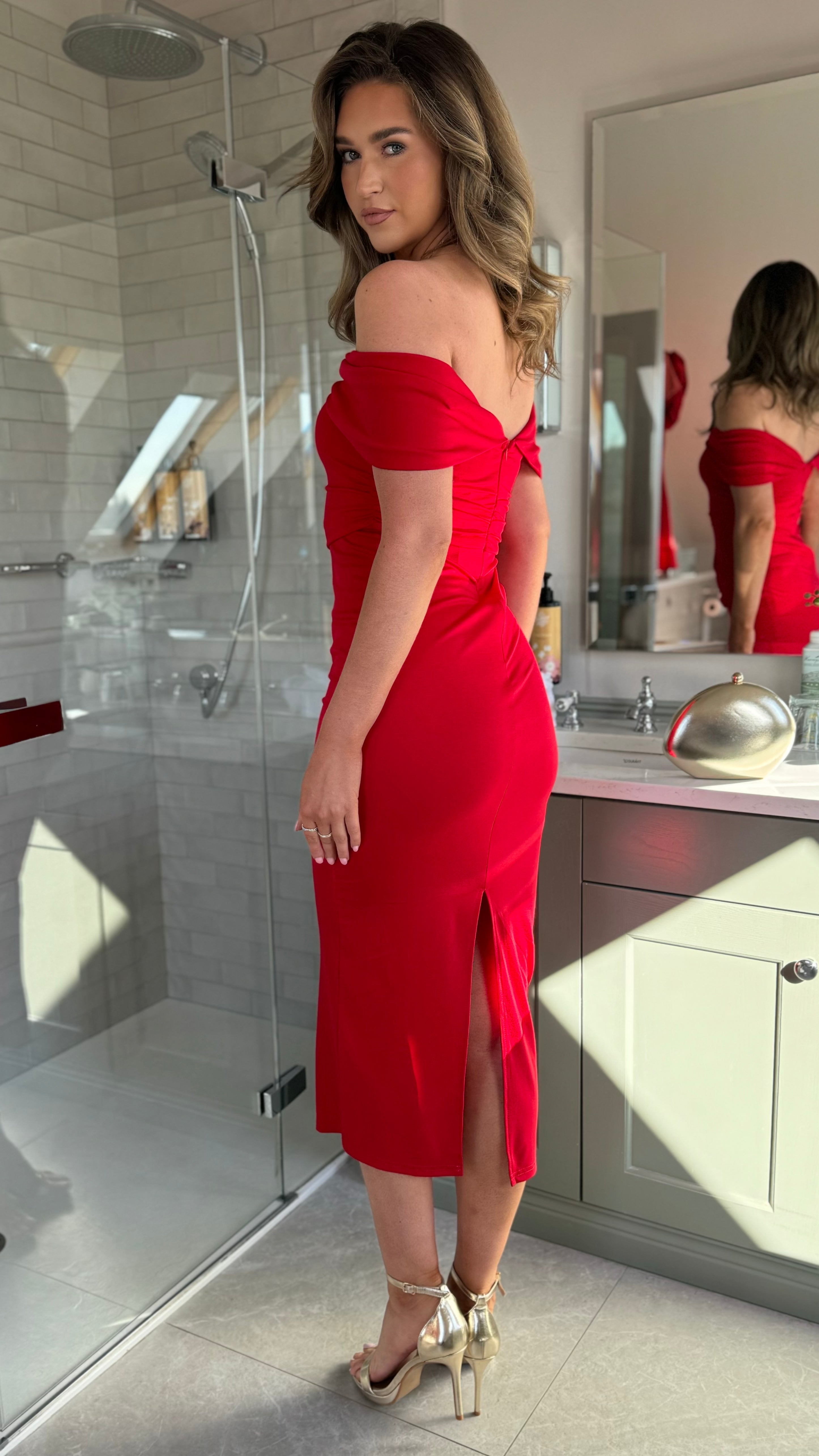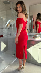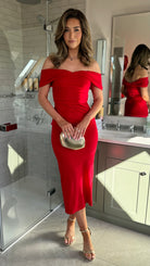Gina Red Off Shoulder Fitted Midi Dress