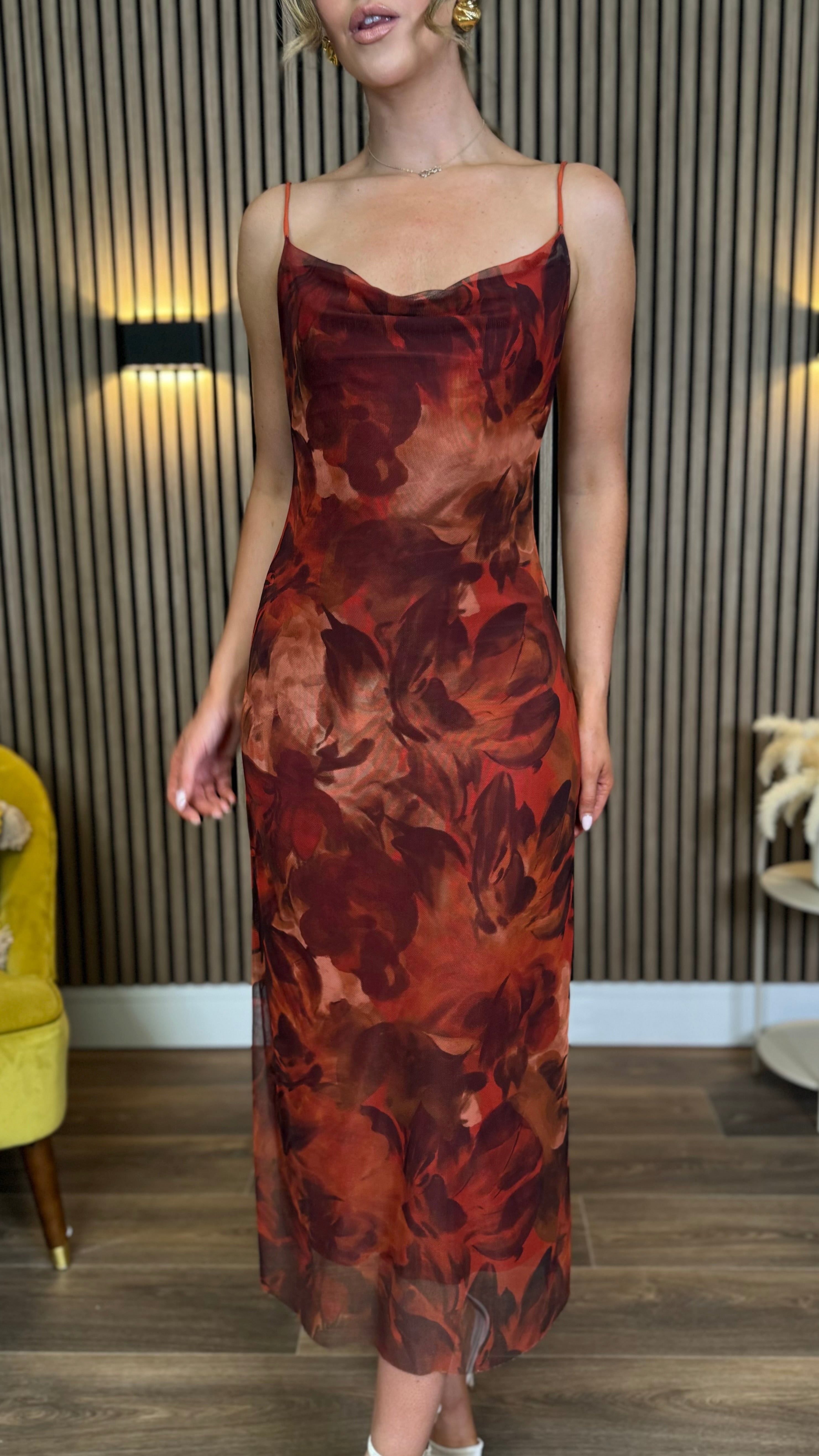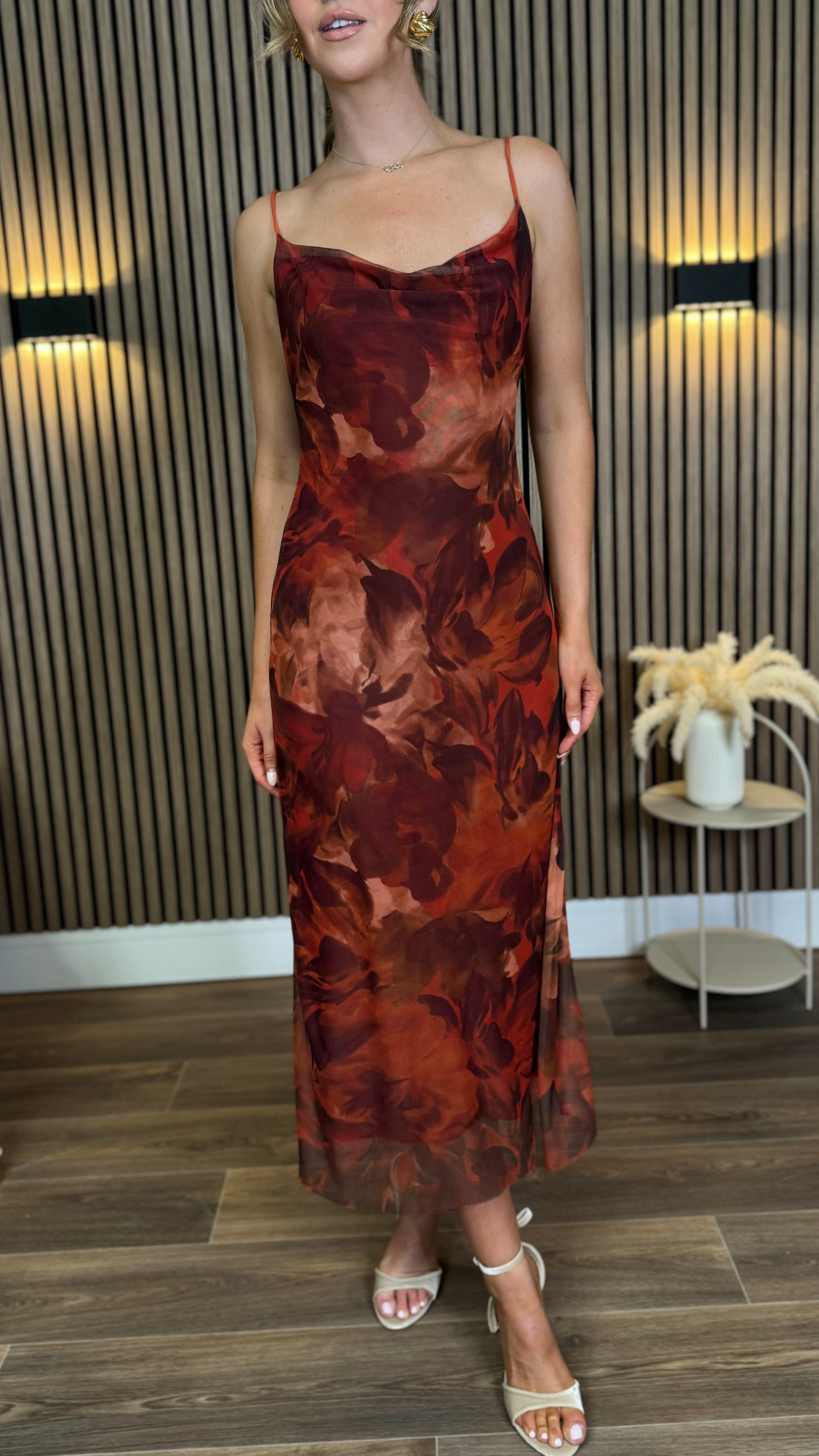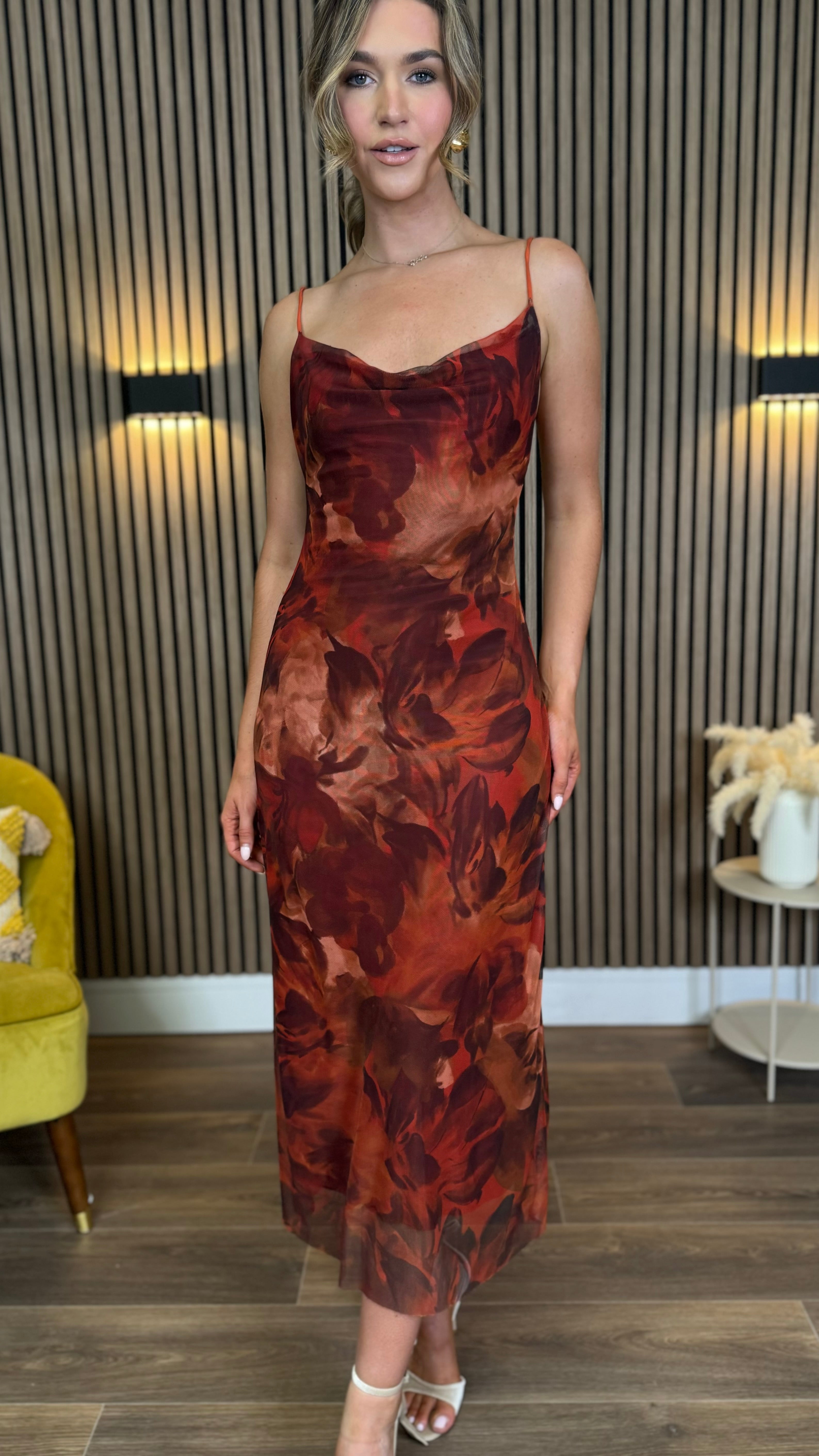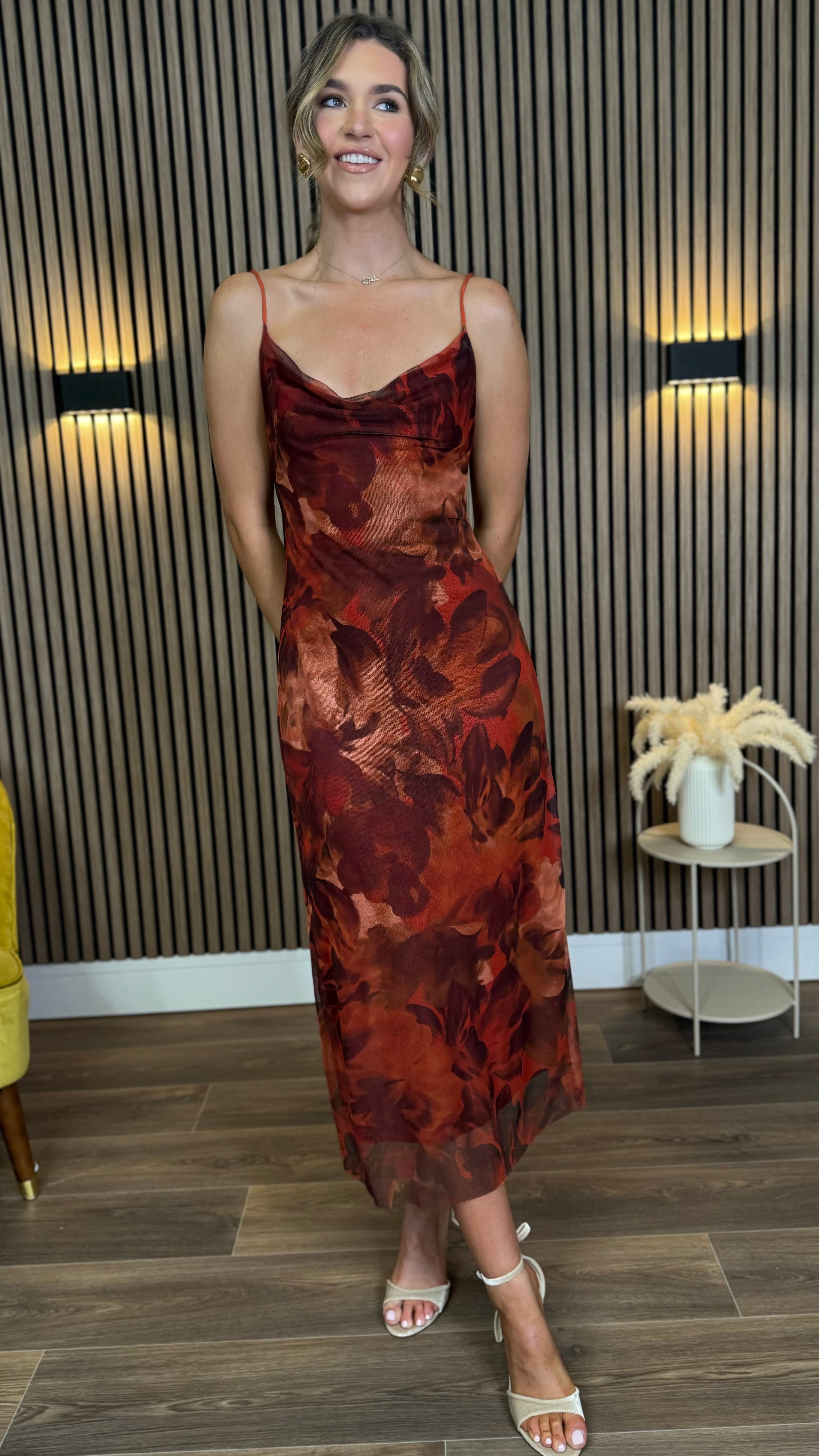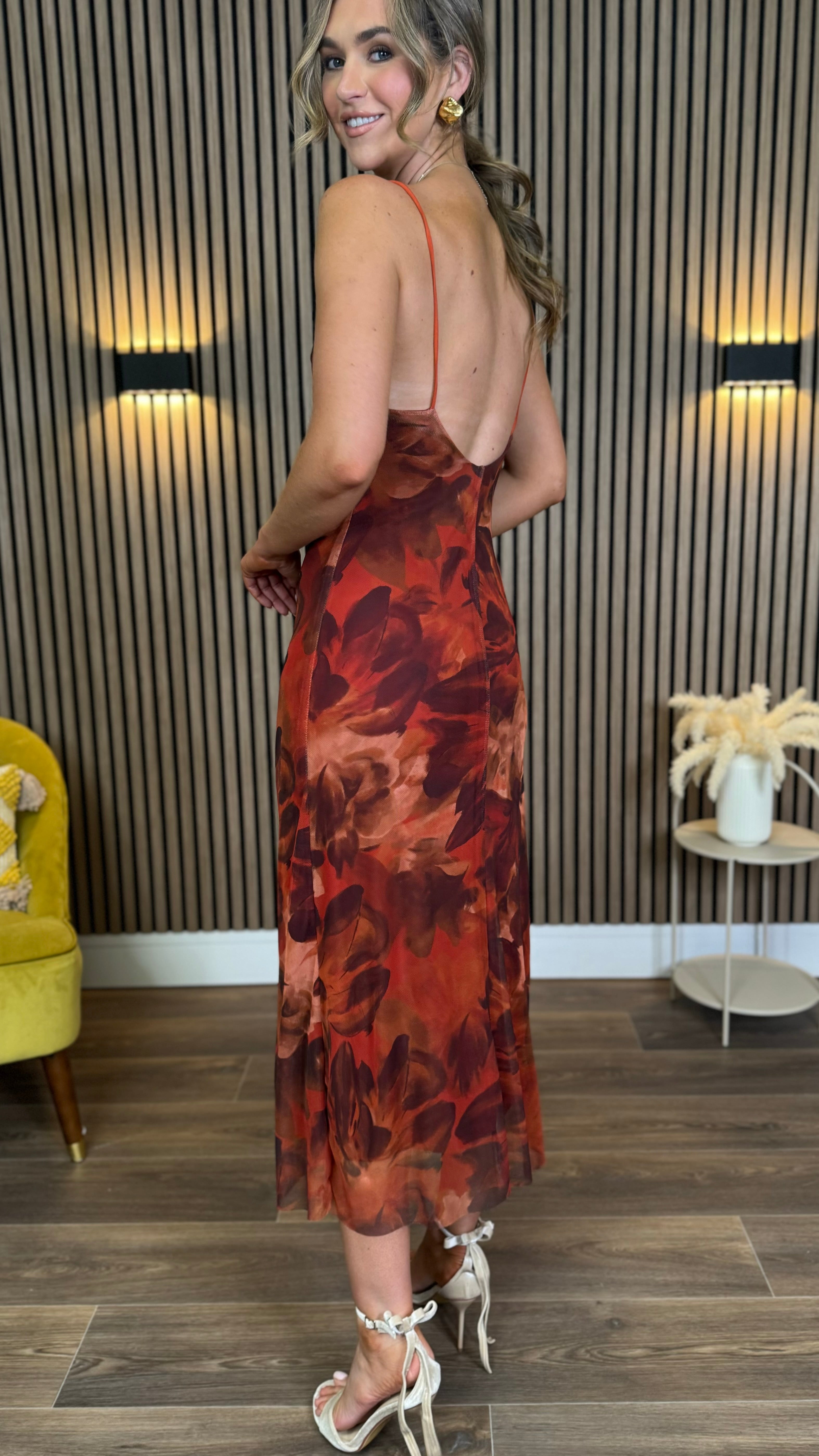 Julia Orange & Rust Abstract Floral Print Cami Strap Midi Dress