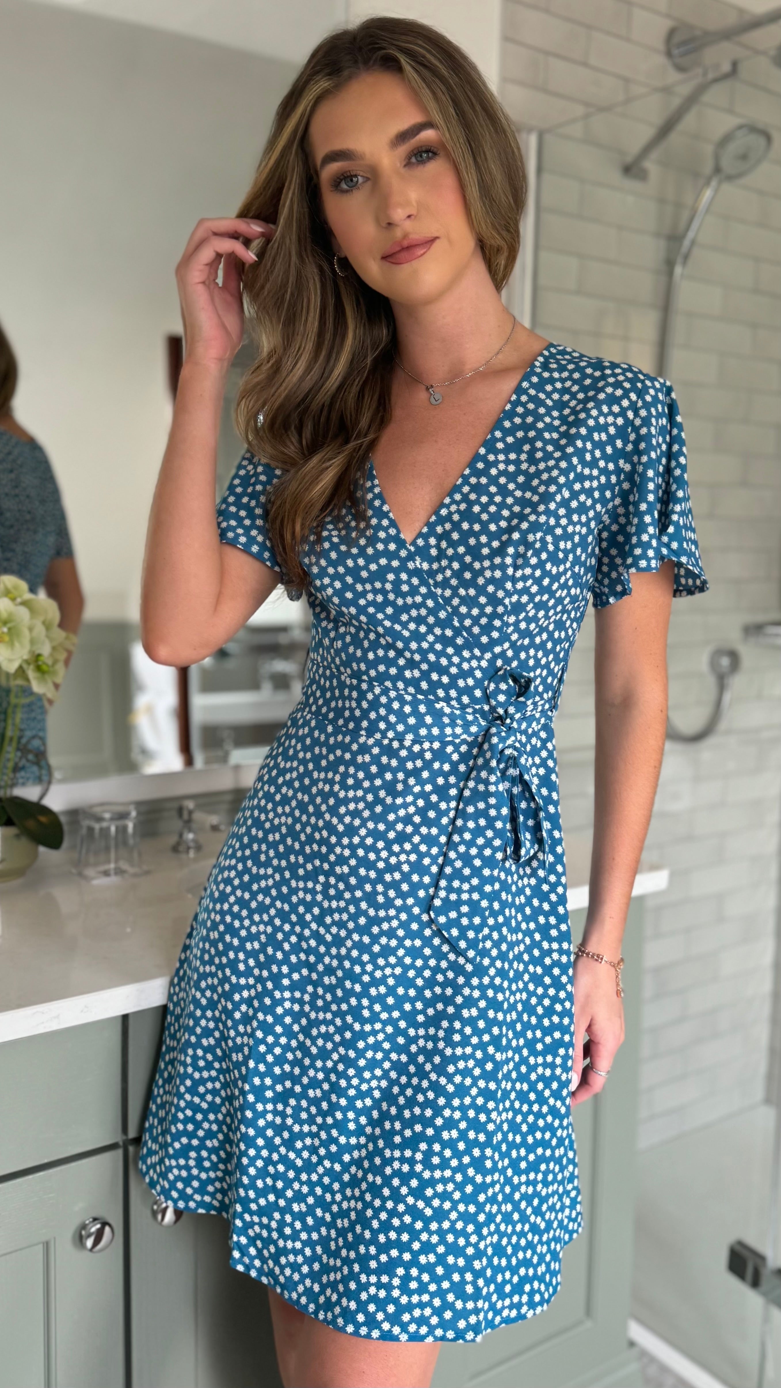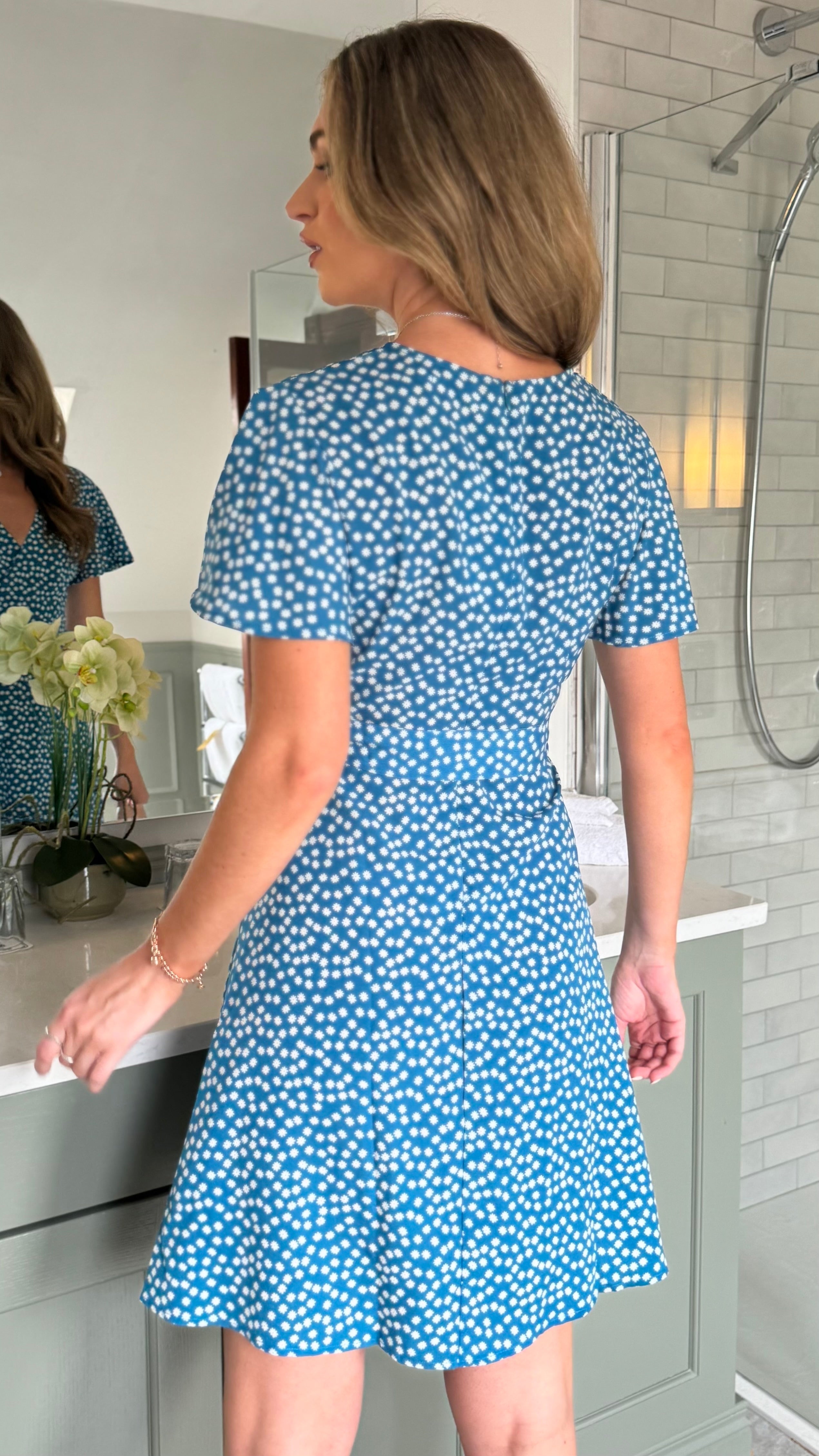 Rowyn Petrol Blue Ditsy Floral Tie Detail Skater Dress