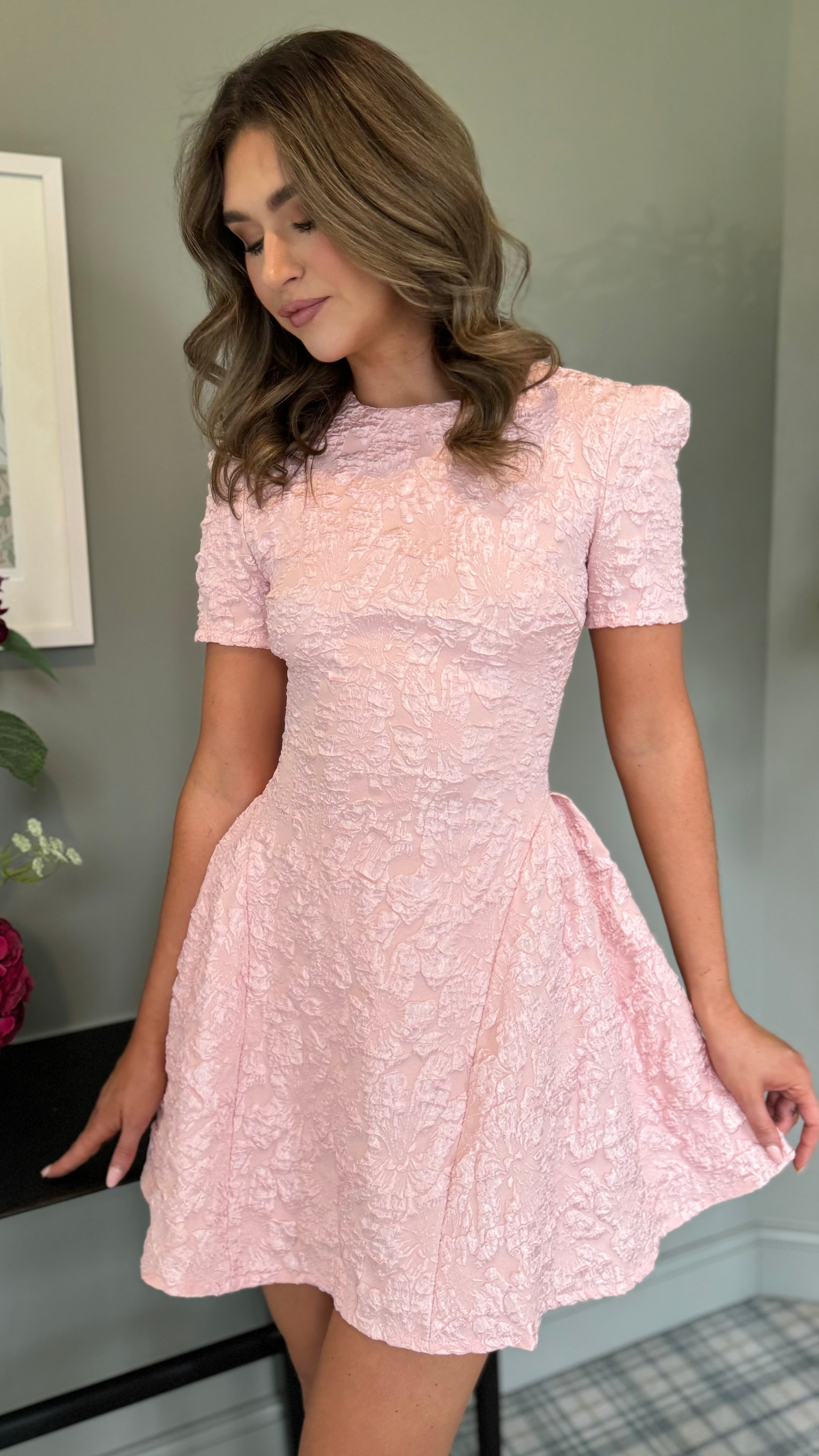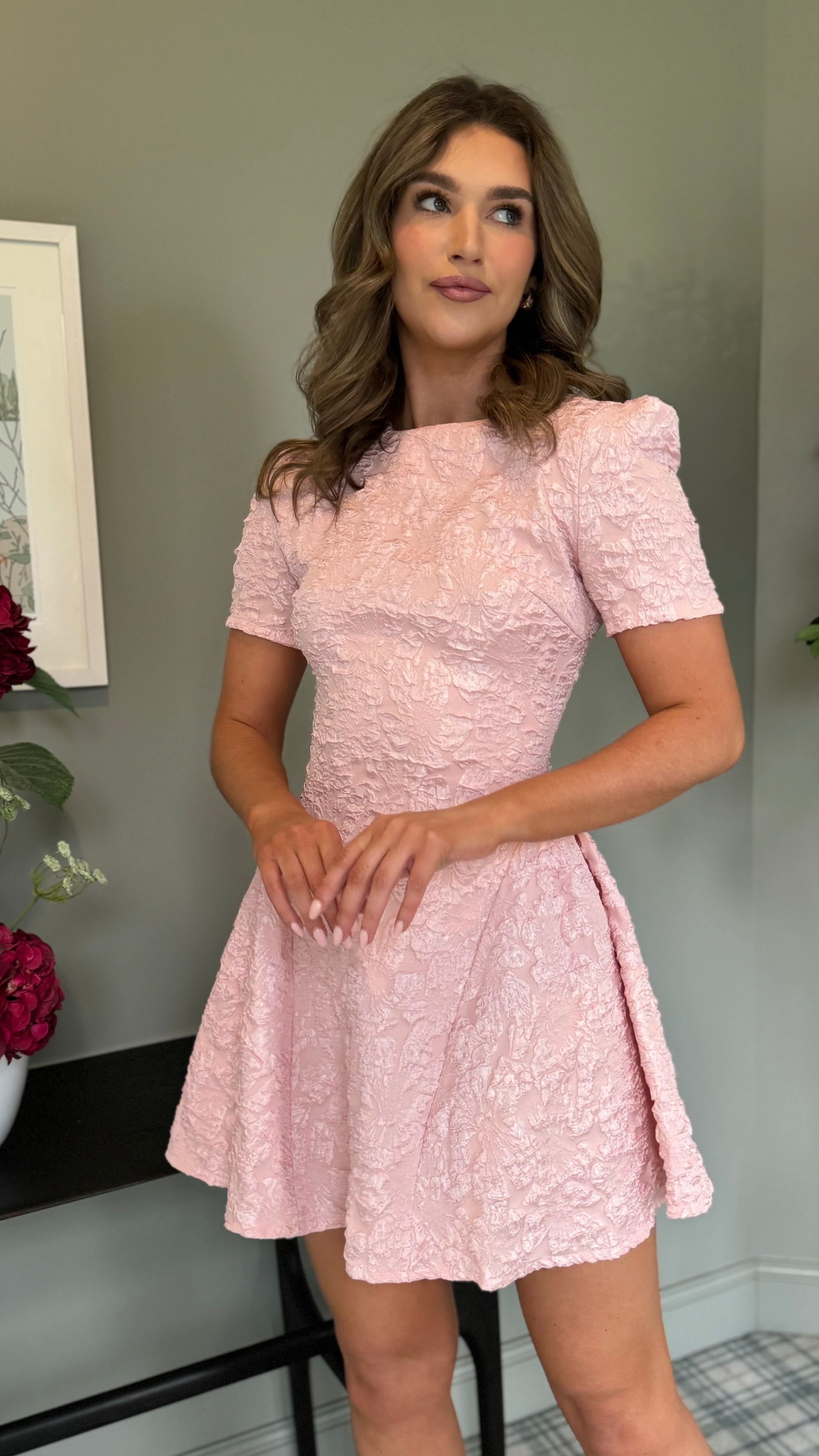 Twirl into the moment with this charming mini dress that's equal parts fun and fabulous. Crafted in luxe brocade with subtle texture, it features a flattering round neckline and playful puff sleeves that add instant personality. The flippy skirt silhouette moves beautifully with you, while the concealed zip fastening keeps the look seamlessly polished. Perfect for occasions that call for a touch of whimsy and effortless style.