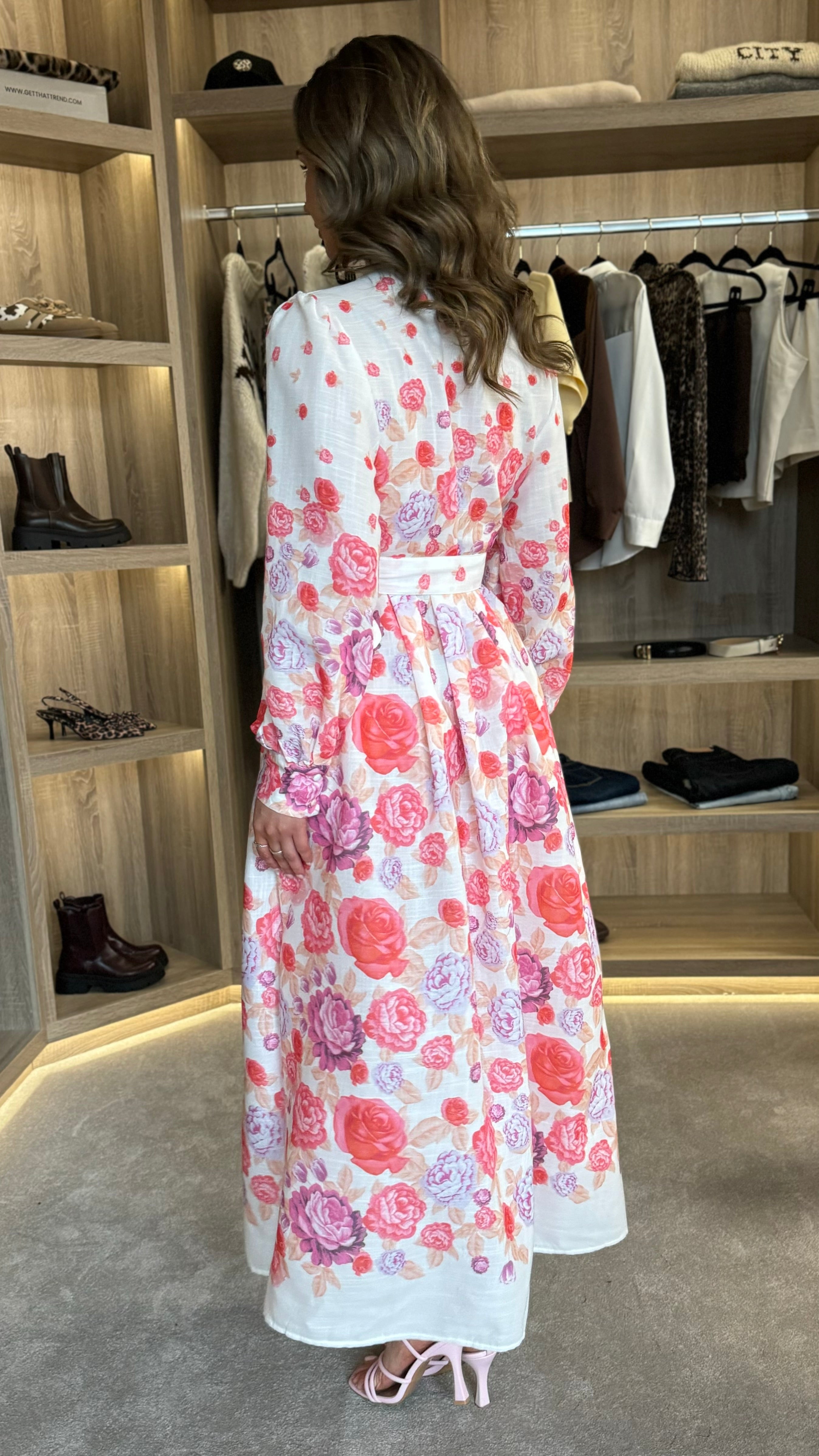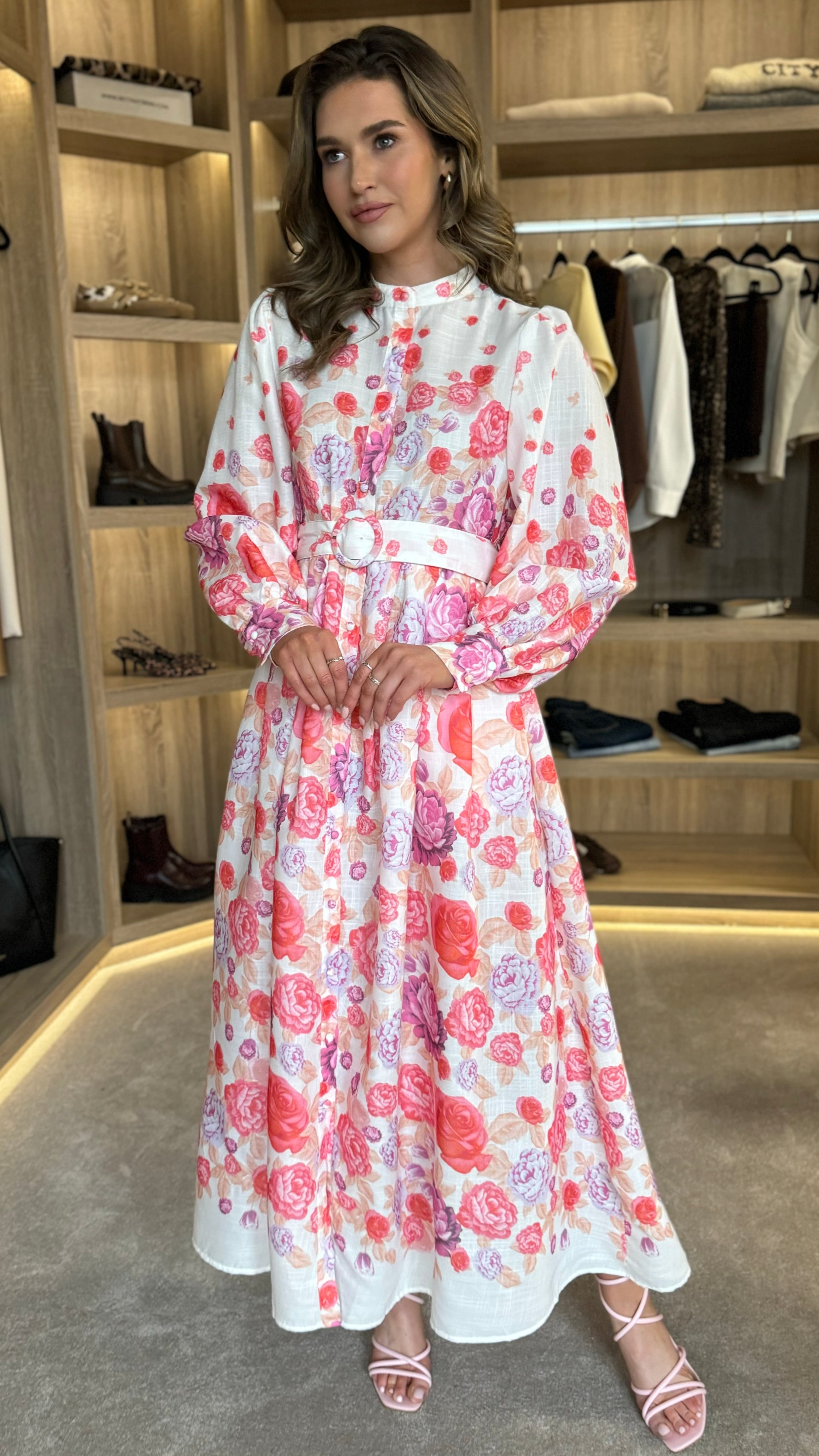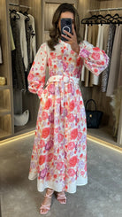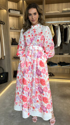 Slip into playful elegance with the Coraline Red & Purple Floral Printed Belted Midi Dress. This dress features a dazzling floral print, a covered button down design, and a high neck for a touch of sophistication. The belted waist cinches for a flattering silhouette, while the button detail cuffs add a charming finishing touch. Perfect for any occasion, this dress will have you feeling confident and stylish!