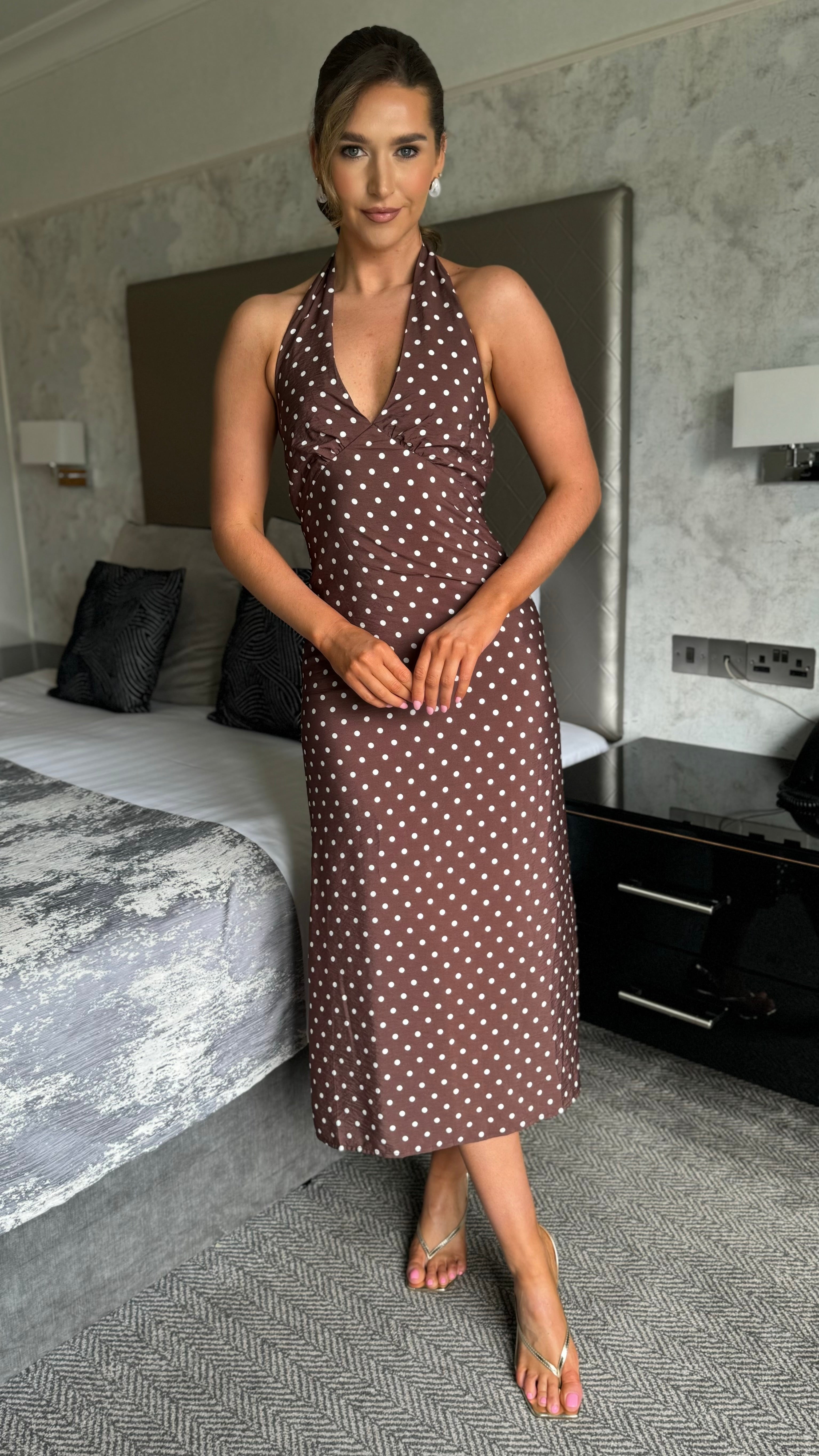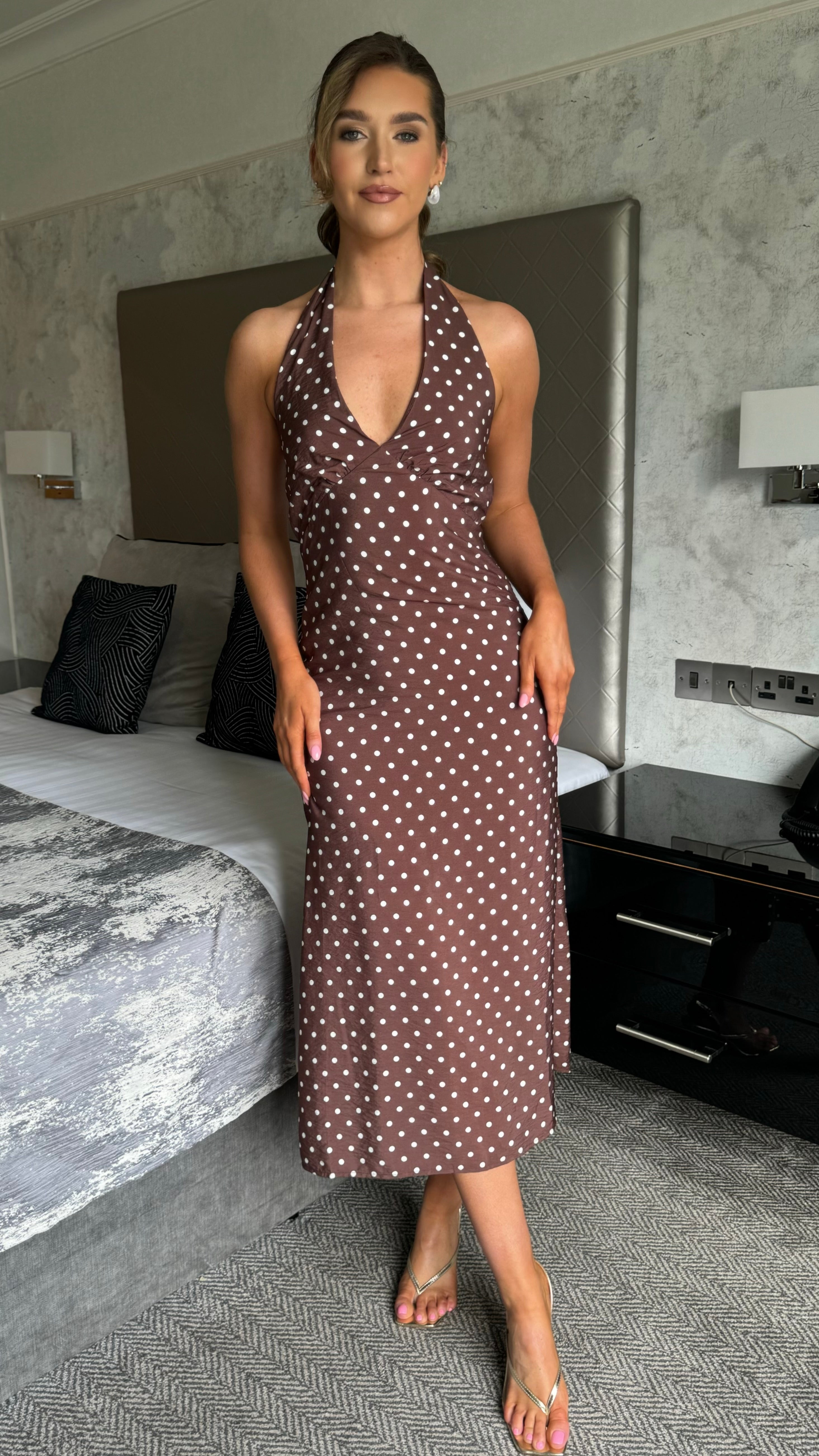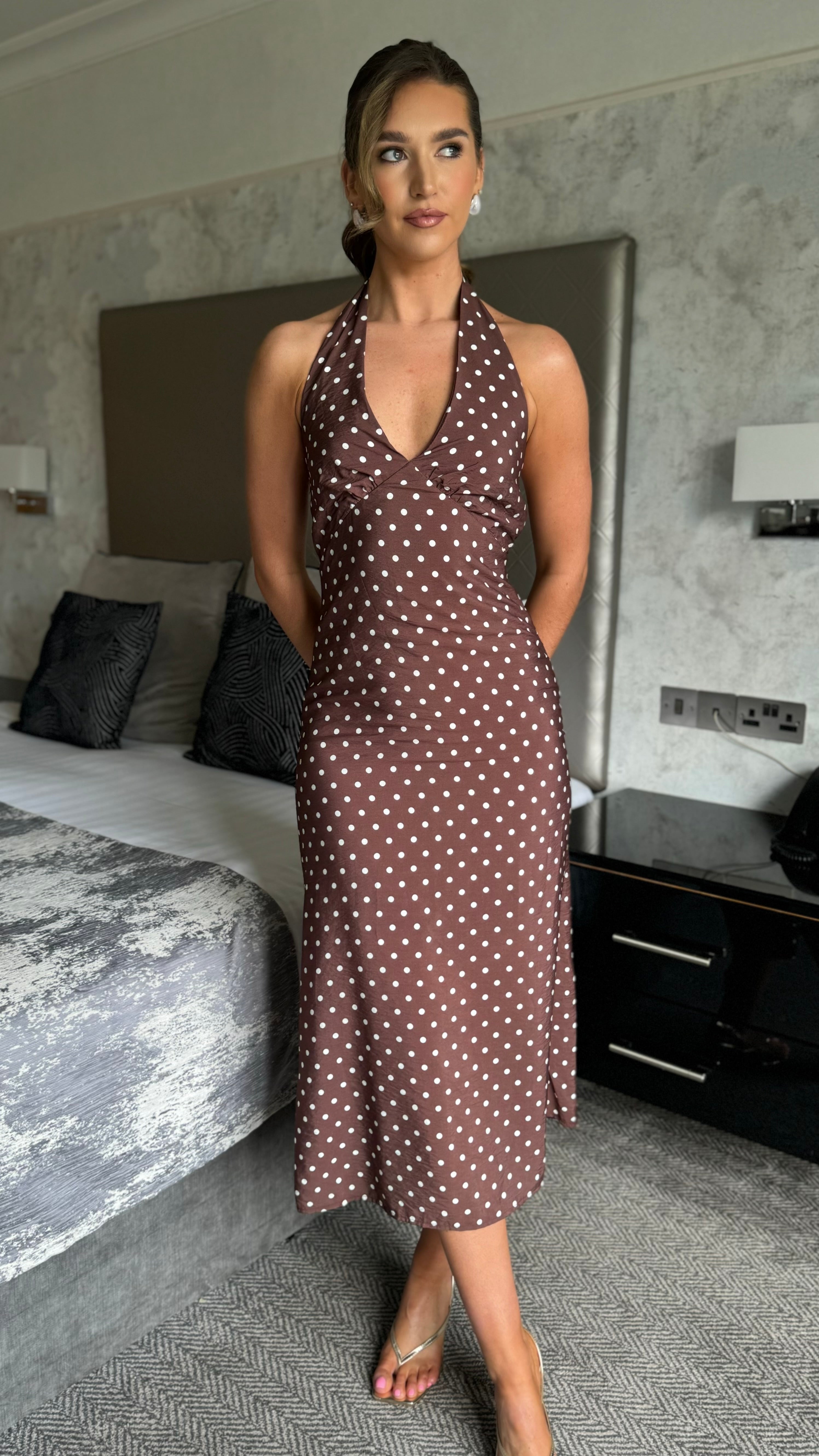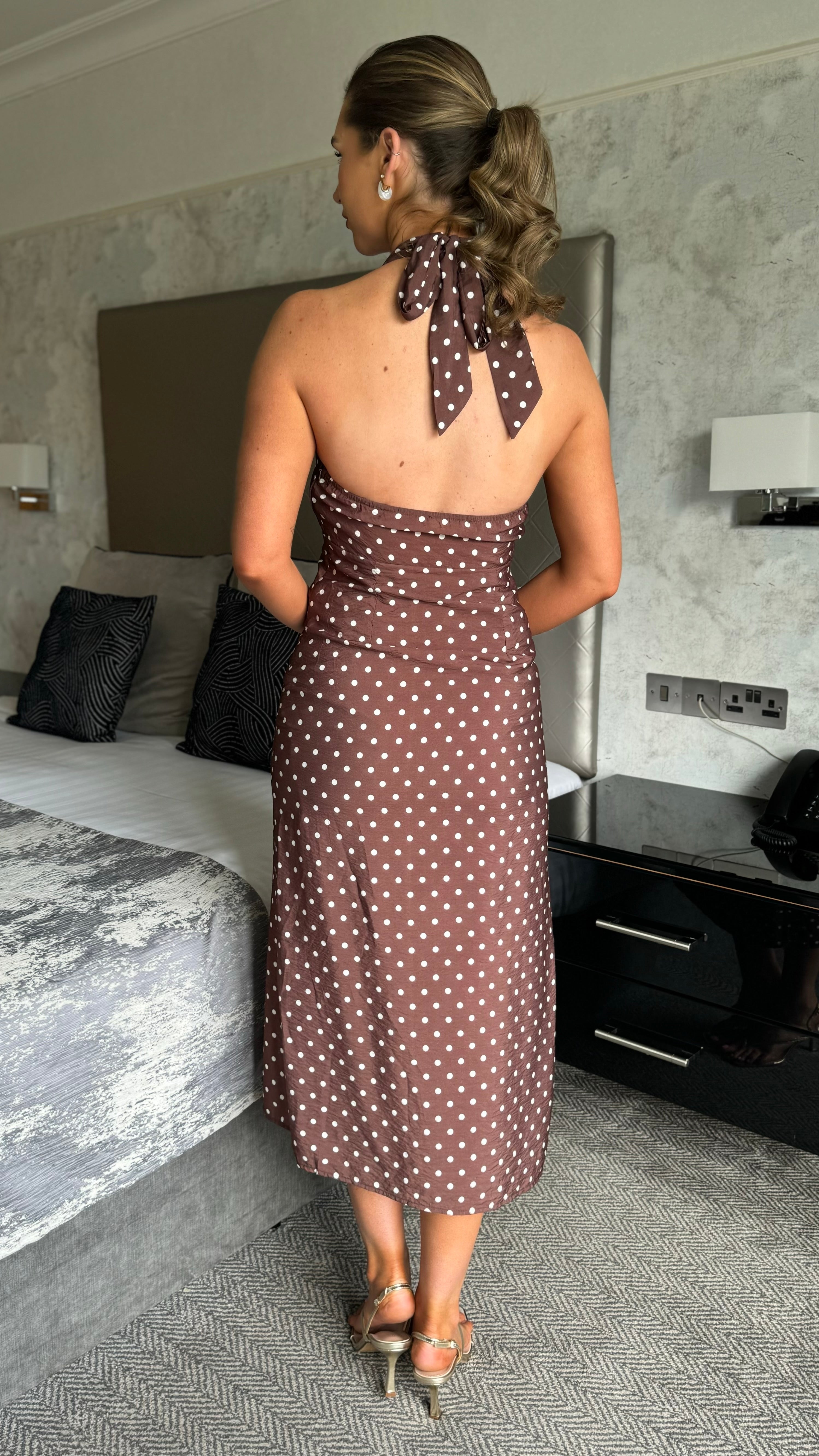 JJ Brown Polka Dot Halterneck Midi Dress