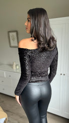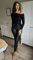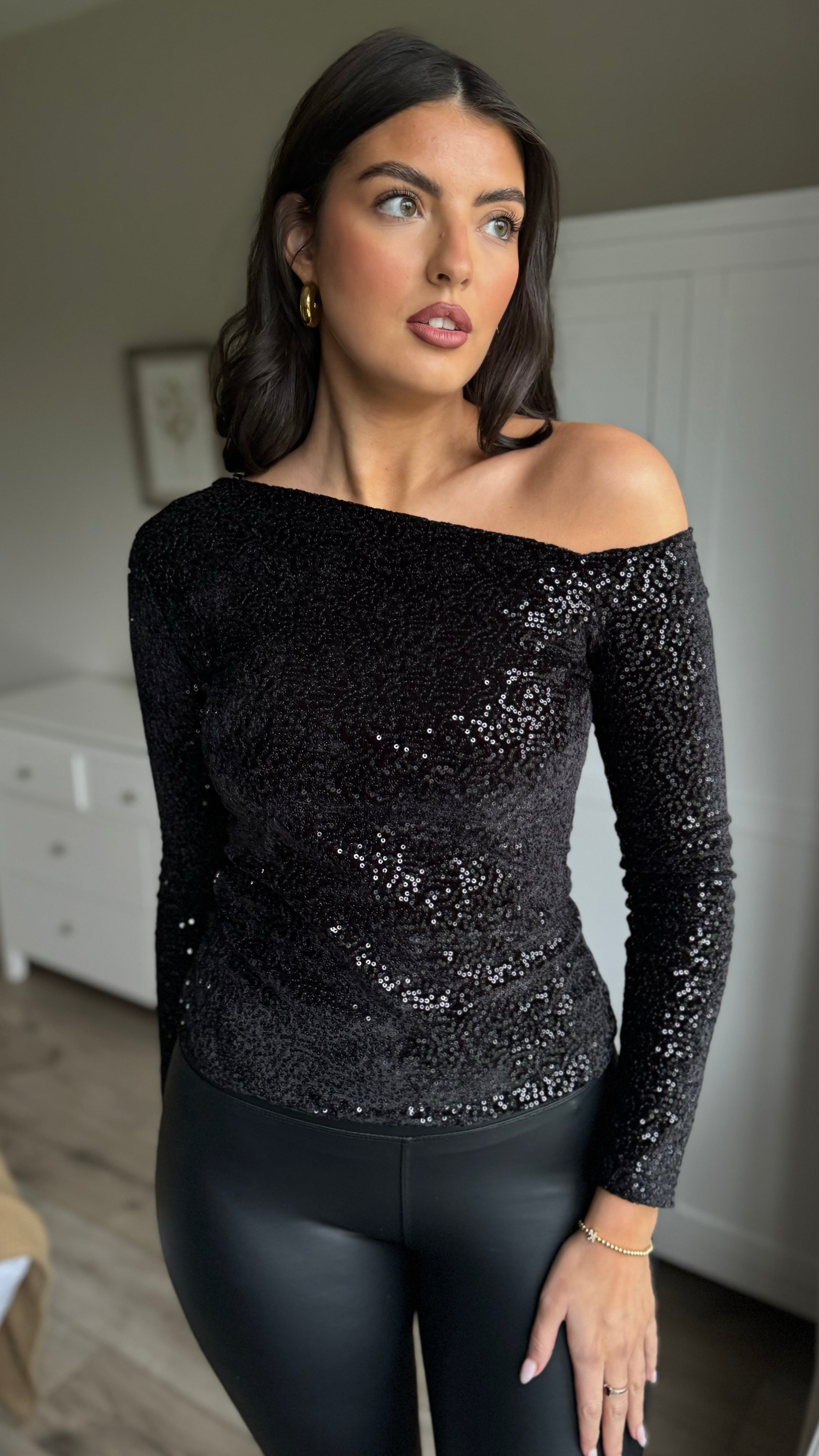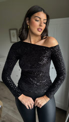 Introducing the Odie Black Sequin Asymmetric Top – where edgy meets elegant! This showstopper features eye-catching all-over sequins that catch the light from every angle, paired with an on-trend asymmetric silhouette and a chic slash neckline. The long sleeves add sophistication while the lined interior ensures comfort and confidence. Perfect for nights out, parties, or whenever you want to sparkle and turn heads. Dress it up or down – this versatile piece is your new go-to for making a statement.