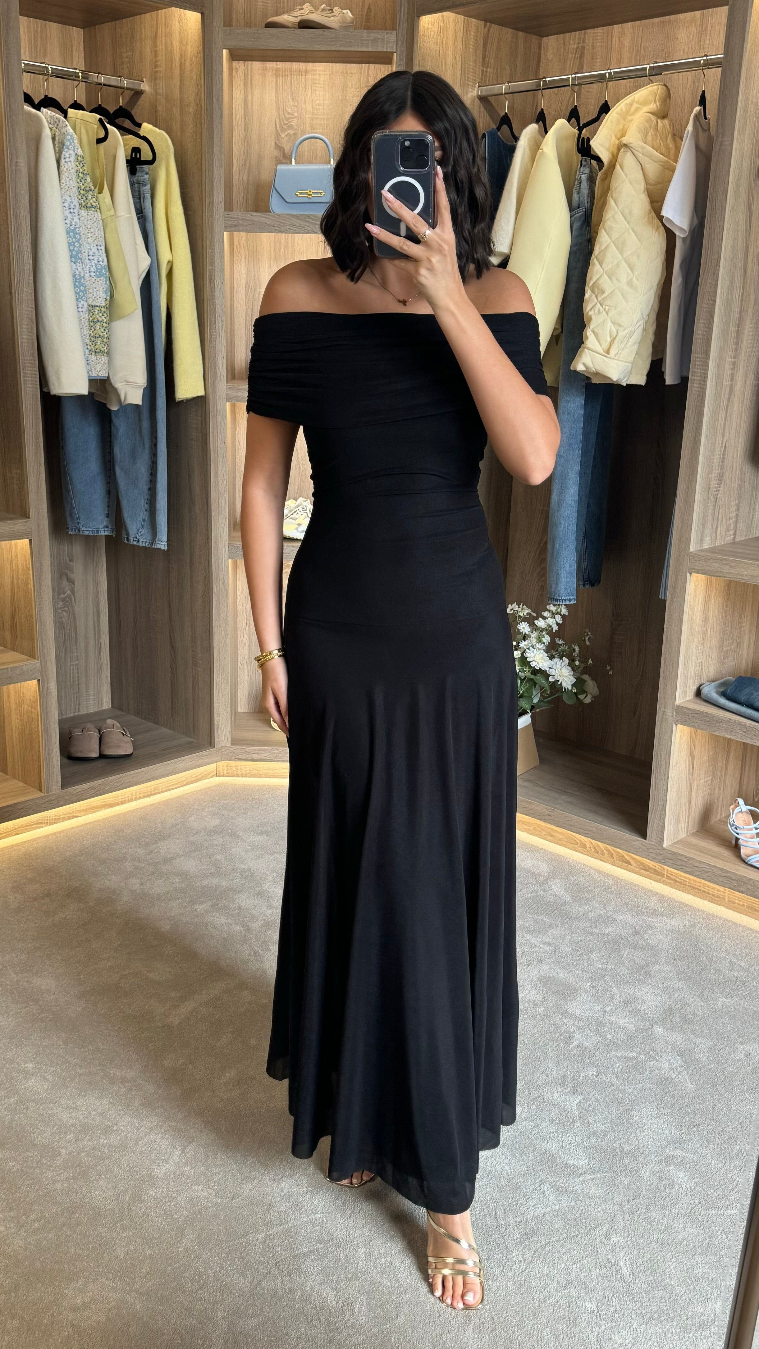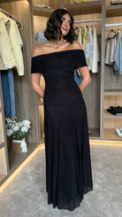Emma Black Off Shoulder Flared Maxi Dress