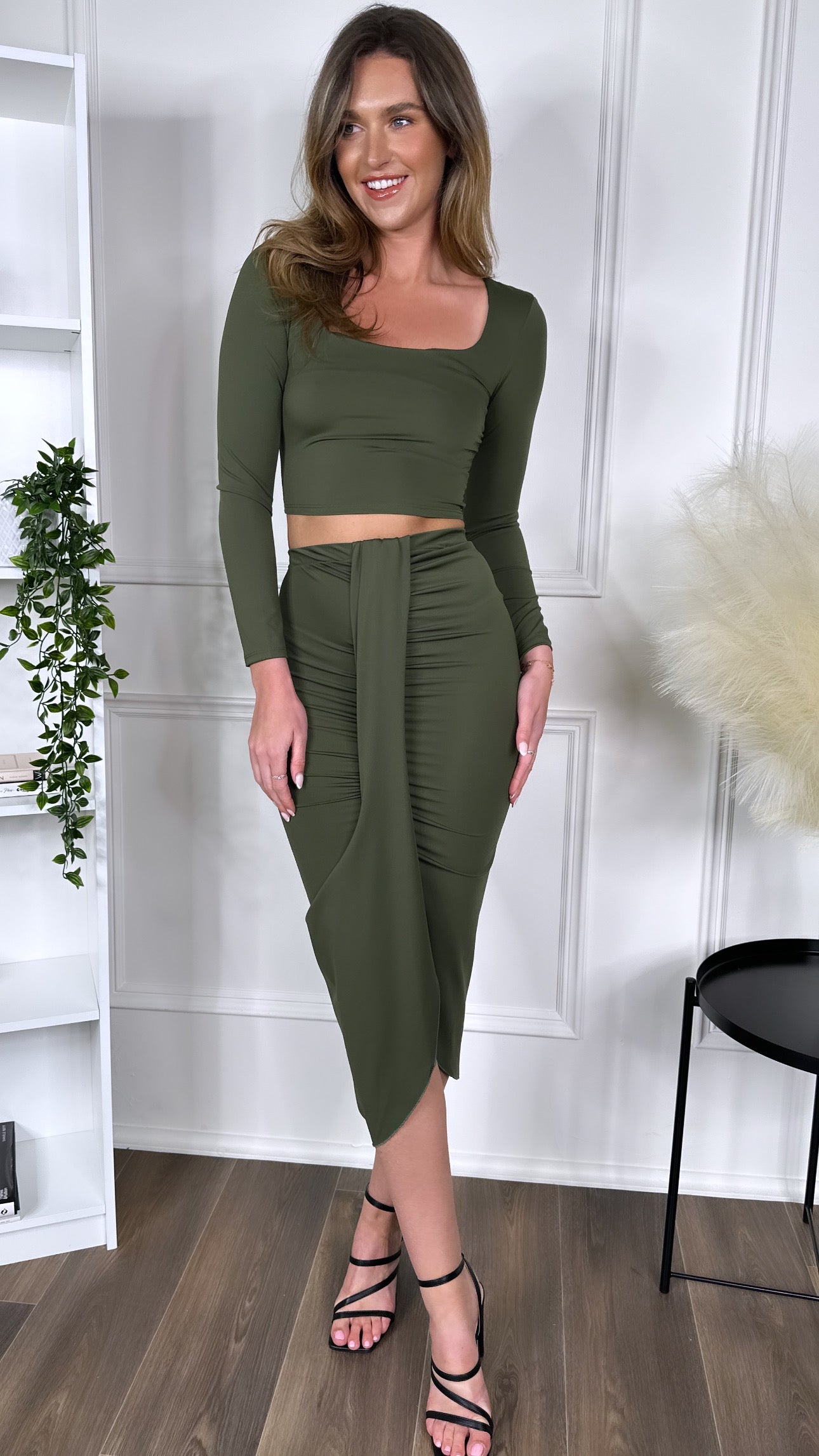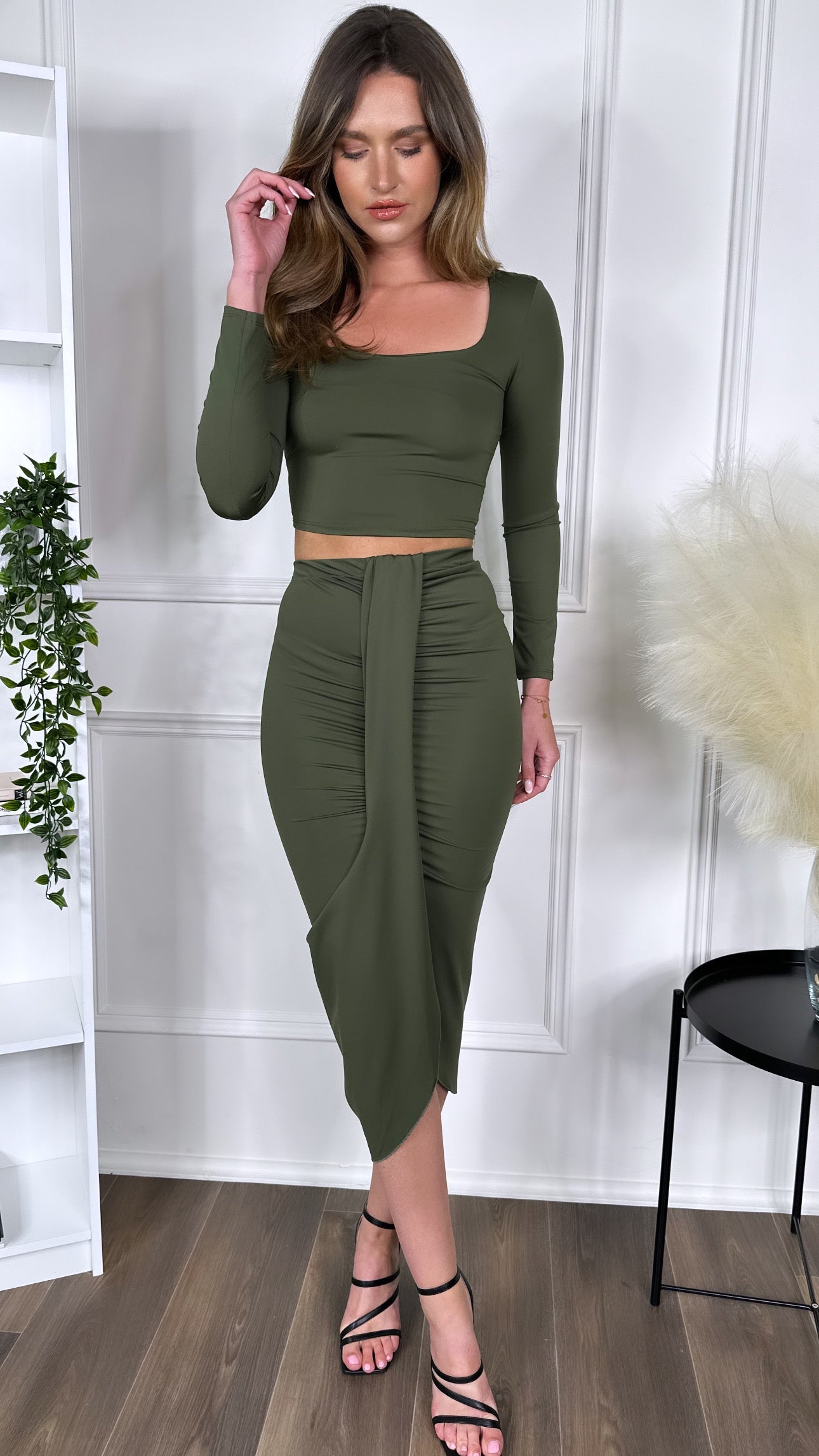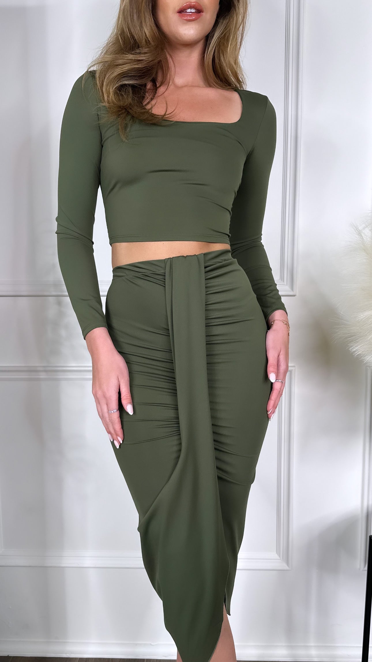 Get ready to drop some jaws with the Leona Khaki Crop Top & Midi Skirt Co Ord! This bold and sassy set includes a square neckline, long sleeve crop top and a ruched and draped midi skirt that'll have all eyes on you. It's the perfect look for a night out on the town. 😍 #twopiece #coord