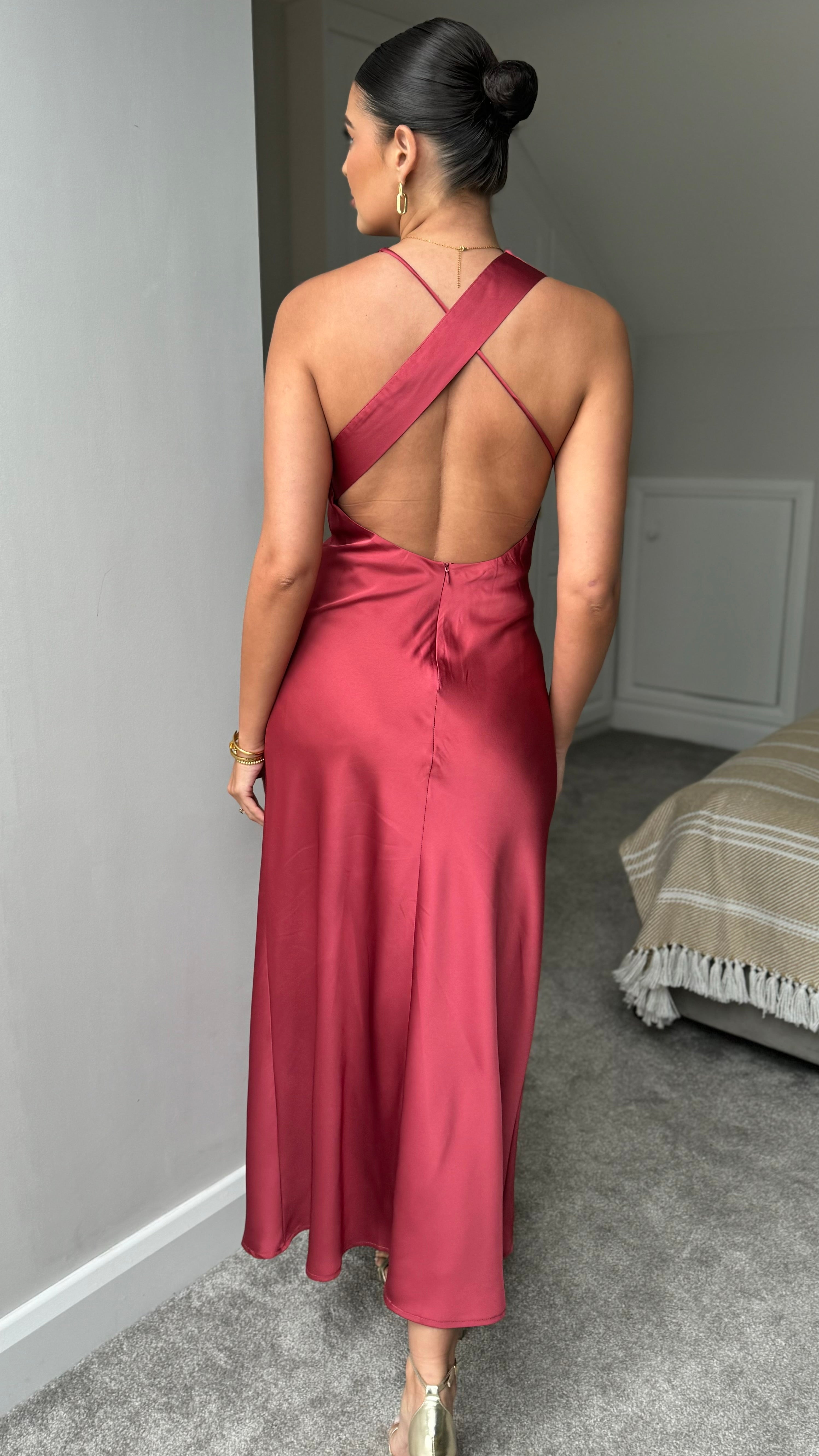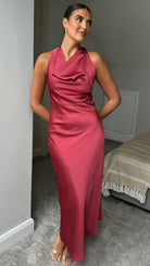 Effortlessly elegant, this raspberry pink midi dress combines contemporary design with timeless appeal. The asymmetric straps and cowl neckline create a flattering silhouette, while criss-cross back straps add visual interest and movement. The a-line cut skirt ensures comfortable wear throughout the day, and the back zip fastening provides easy dressing. Crafted in luxurious satin, this piece transitions seamlessly from occasion wear to elevated everyday styling.