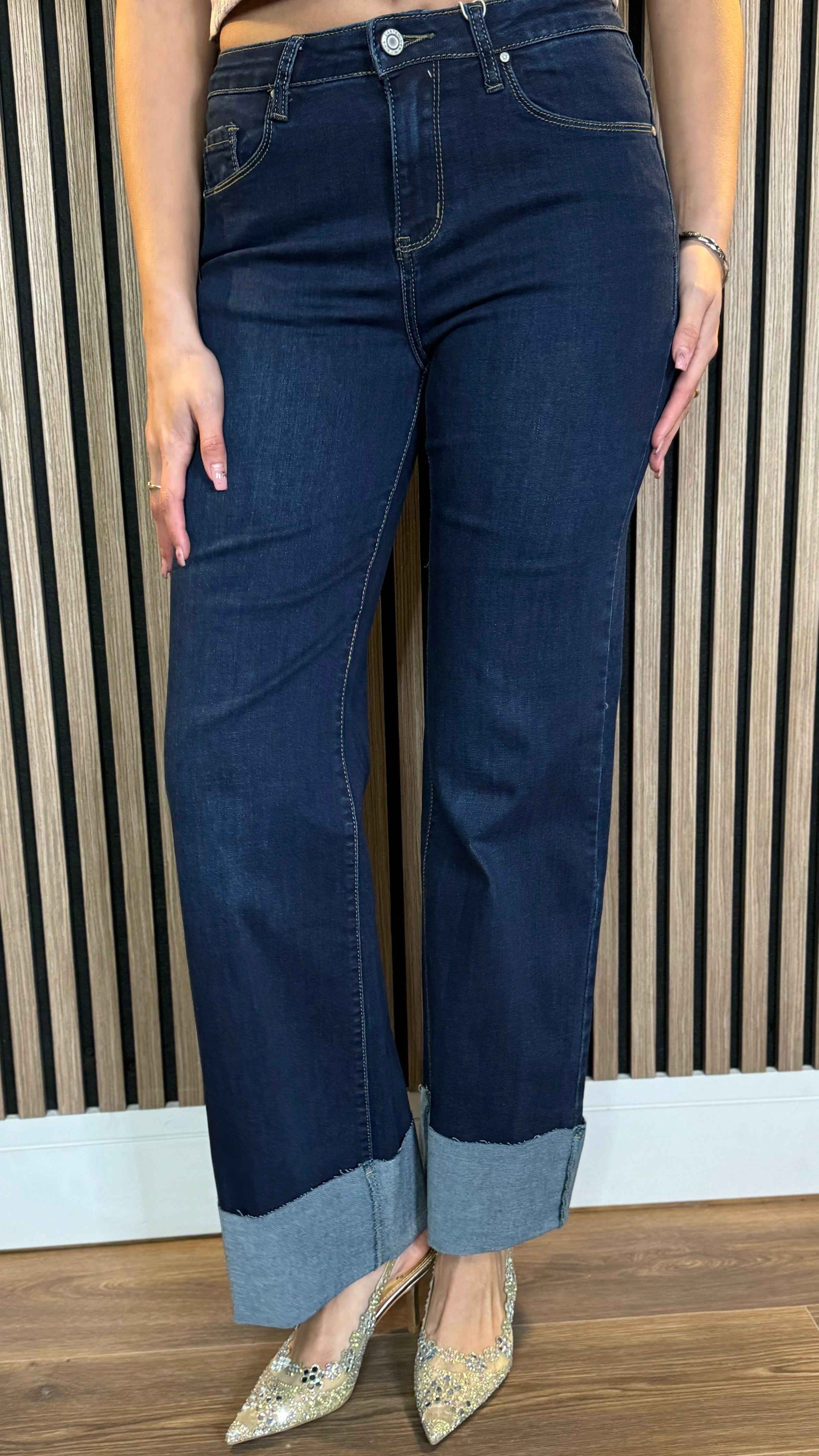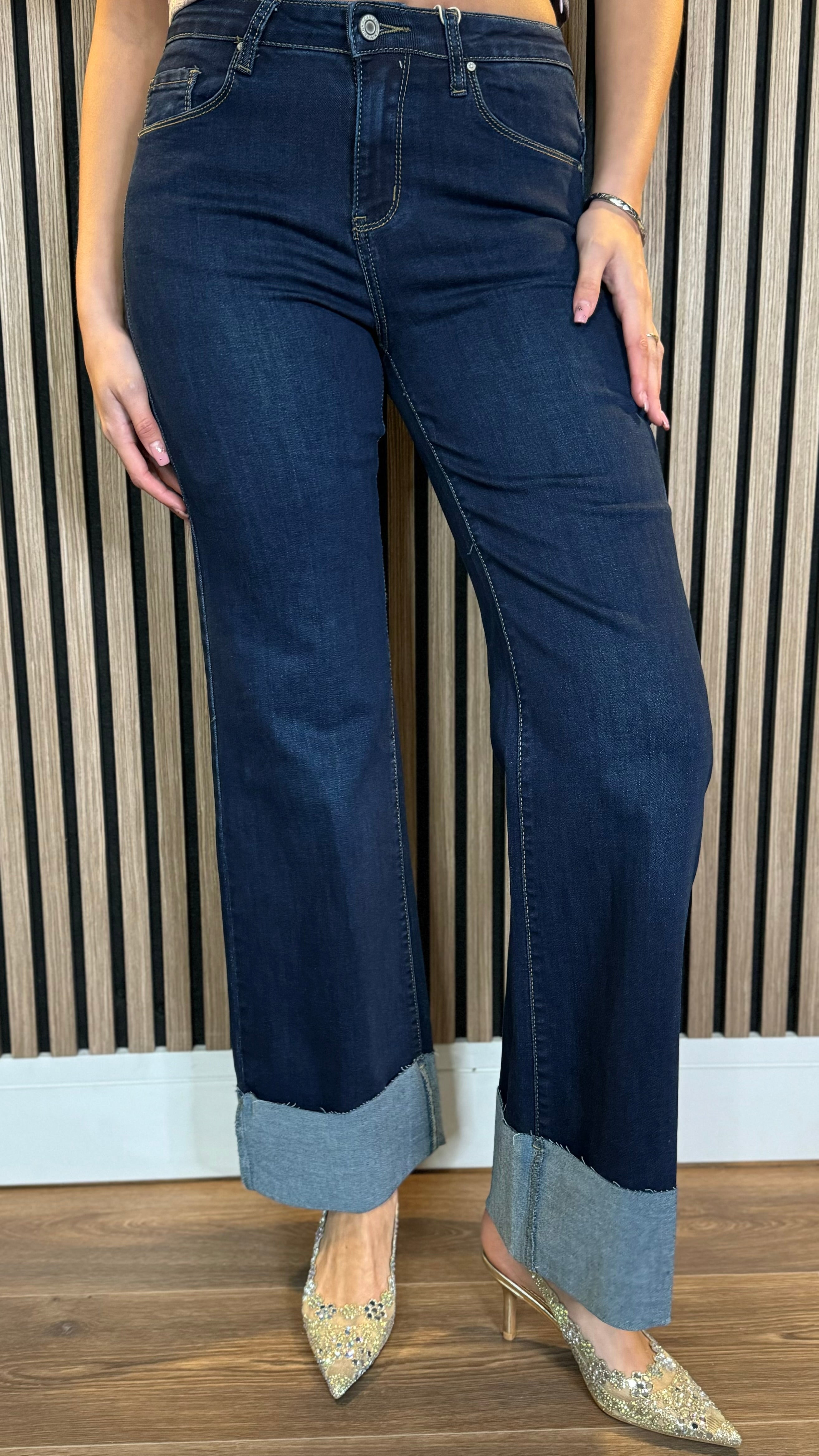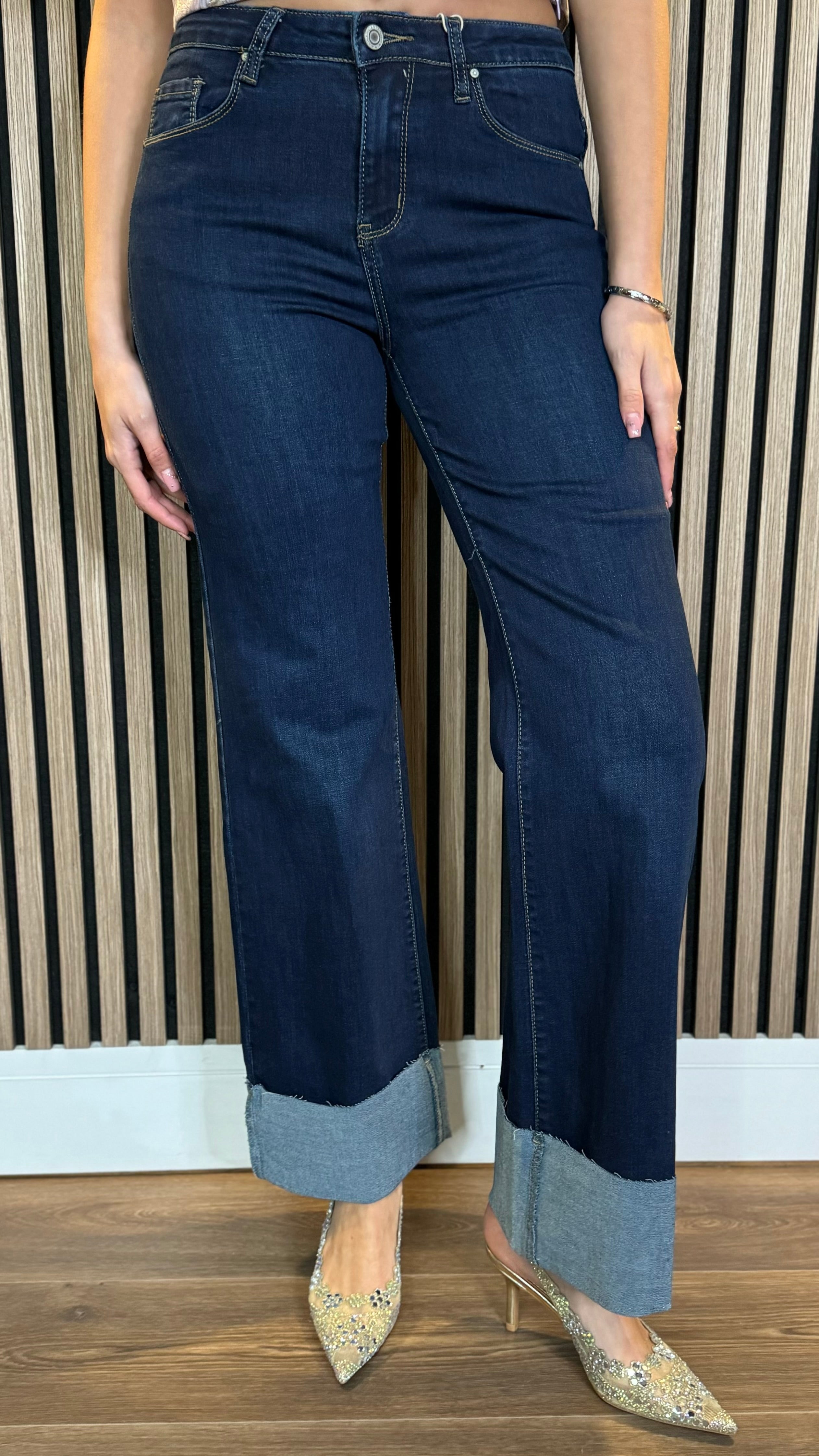Deren Dark Blue Wide Leg Turn Up Detail Jeans