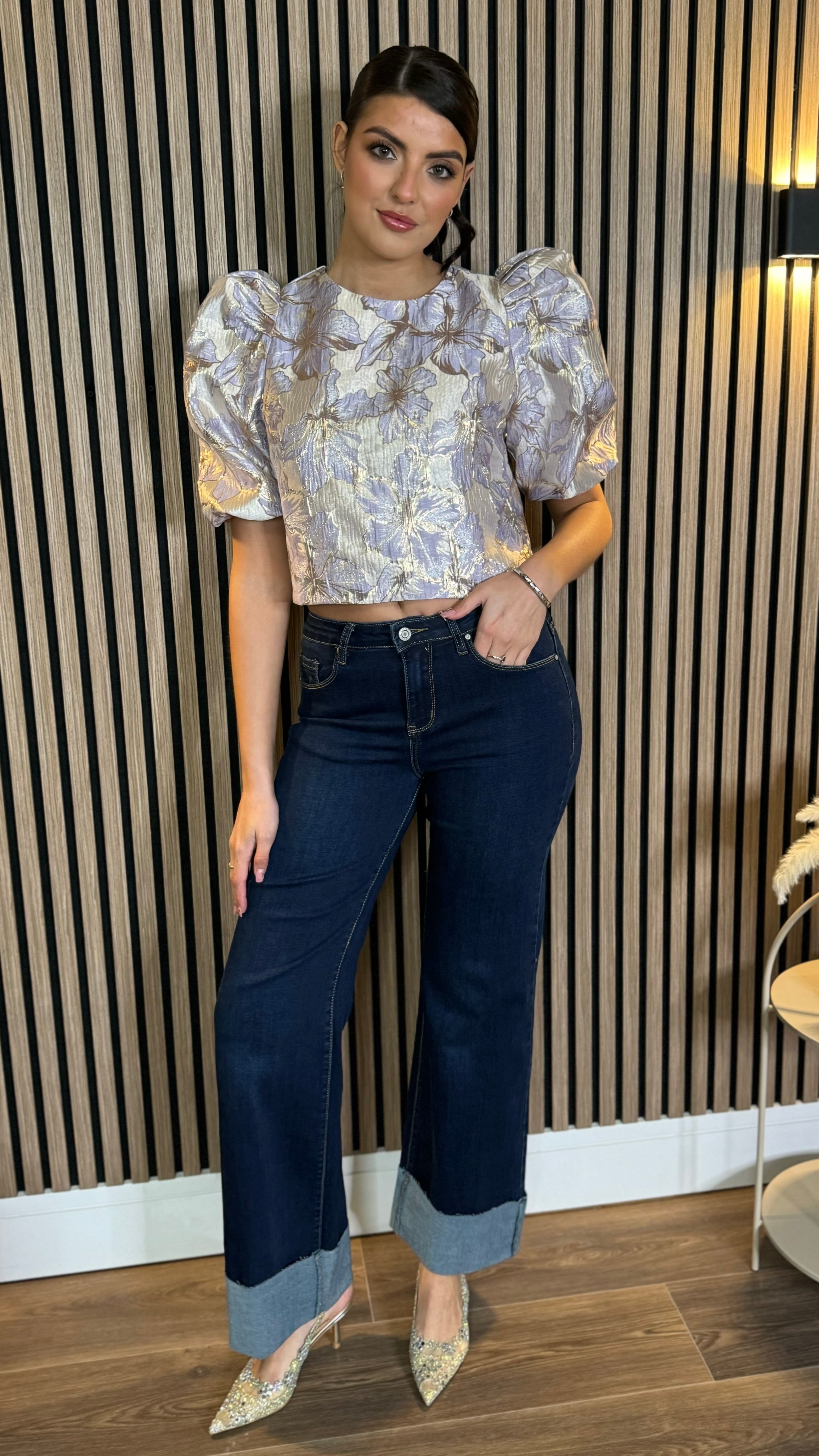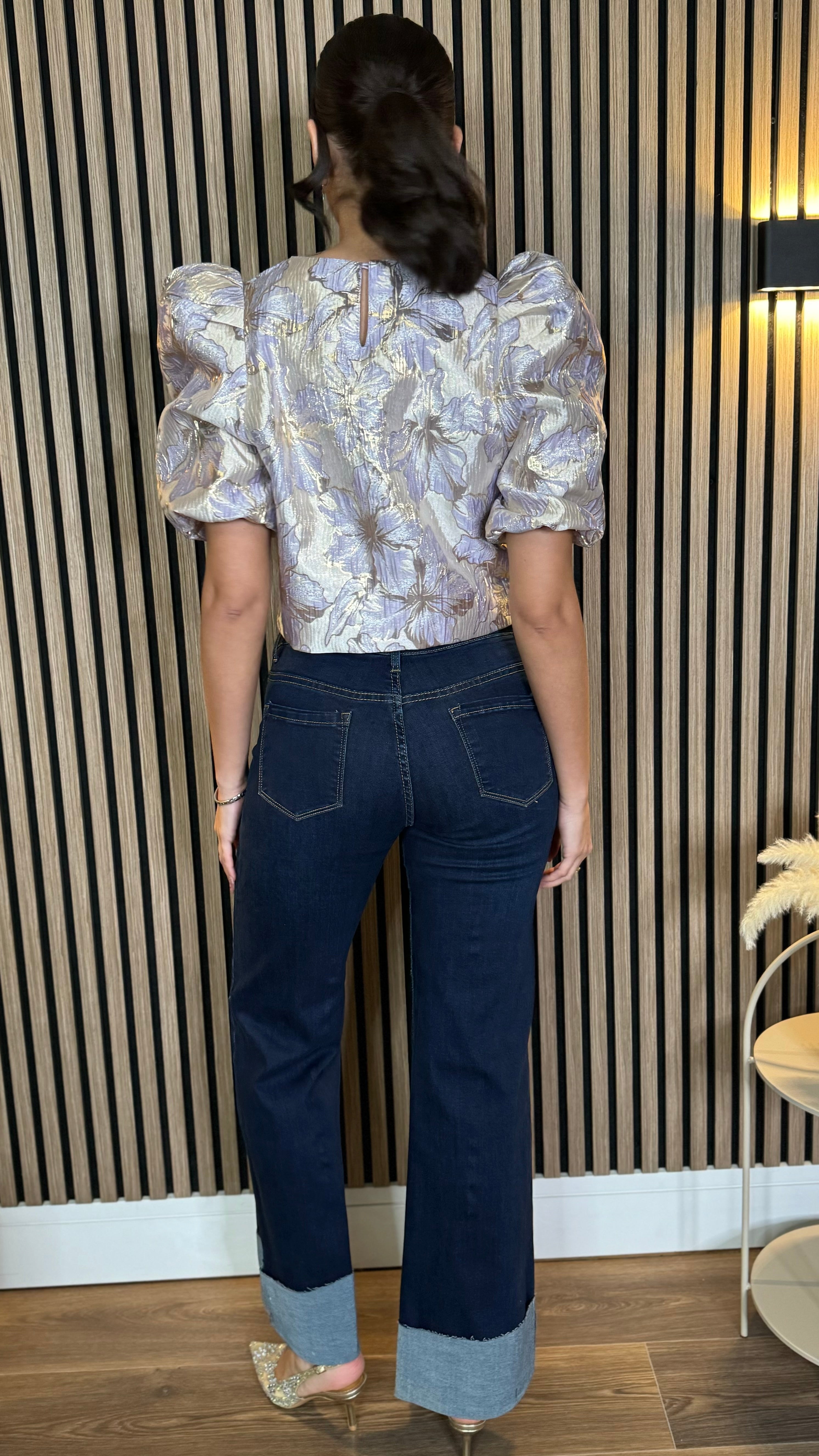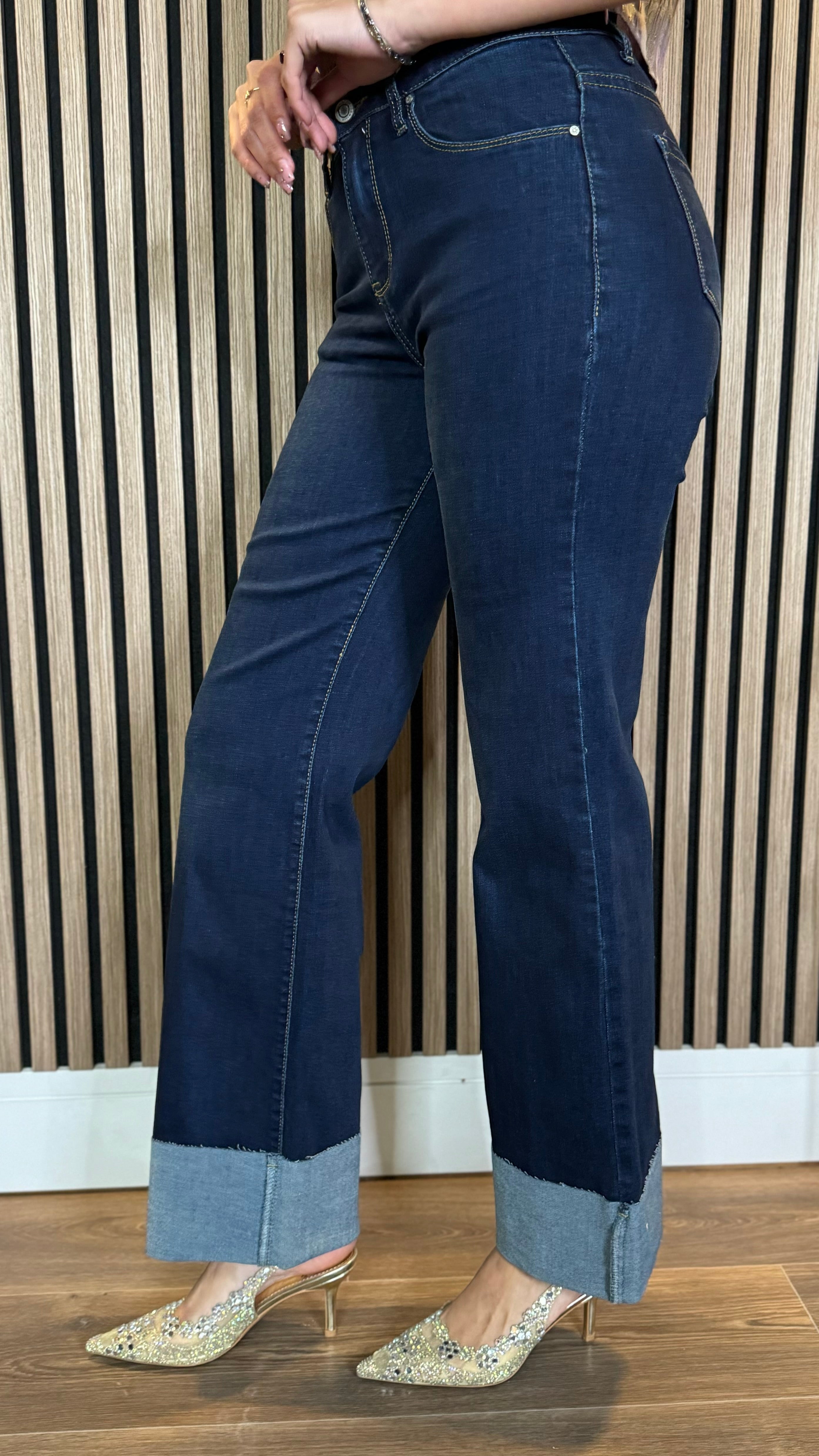 Deren Dark Blue Wide Leg Turn Up Detail Jeans