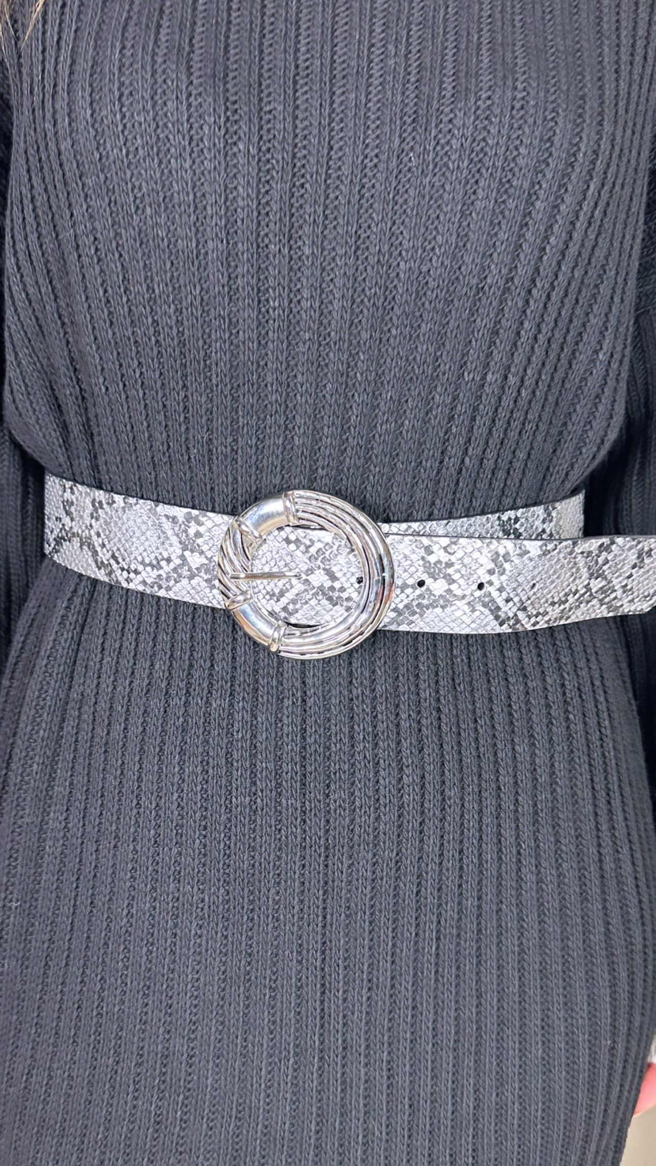 Look sharp and stylish with this Essie Grey & Black Python belt. The belt features a luxe large silver buckle, perfect for adding a bit of flare to any outfit! So why not buckle up in style? 🐍🐍