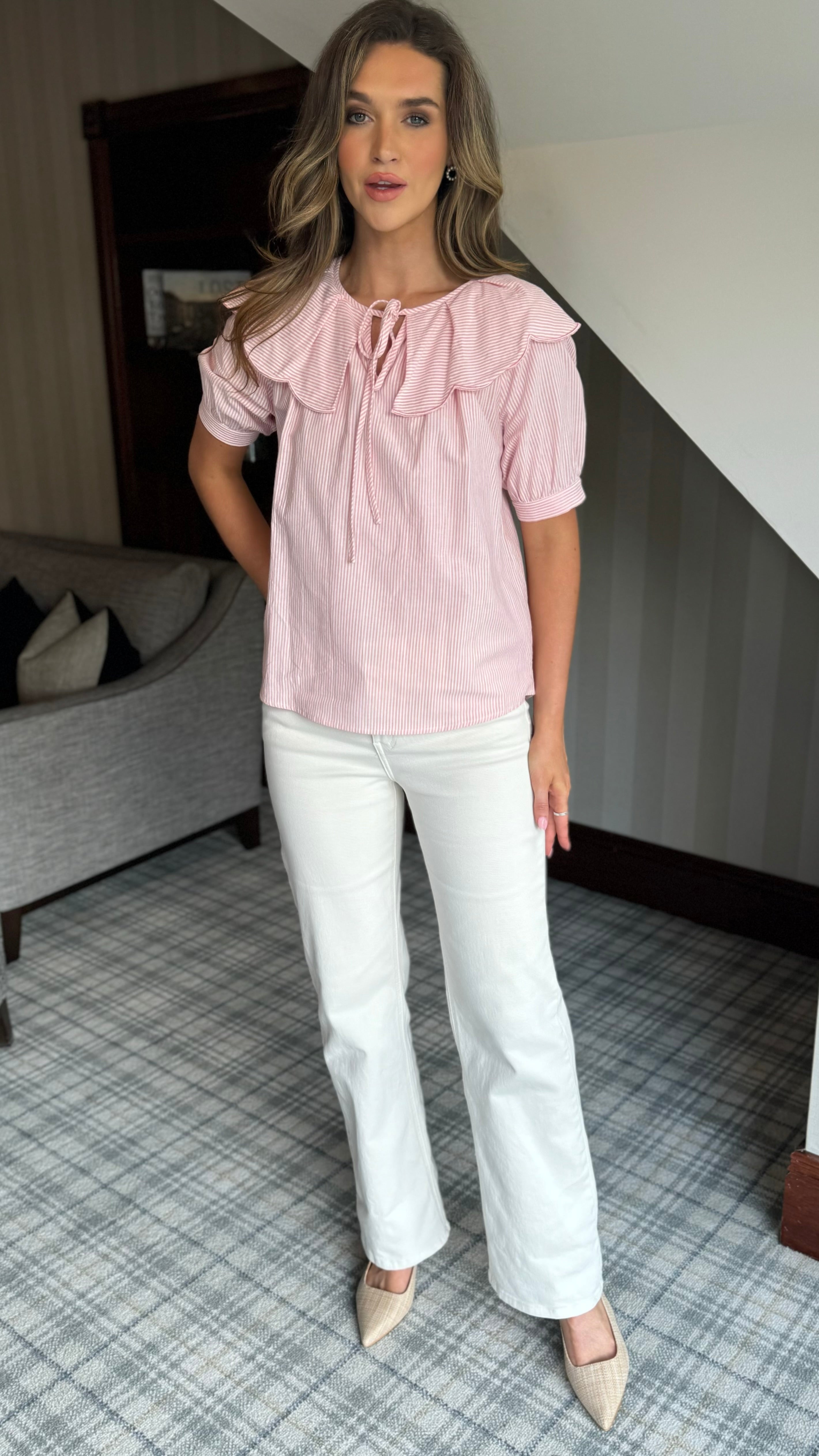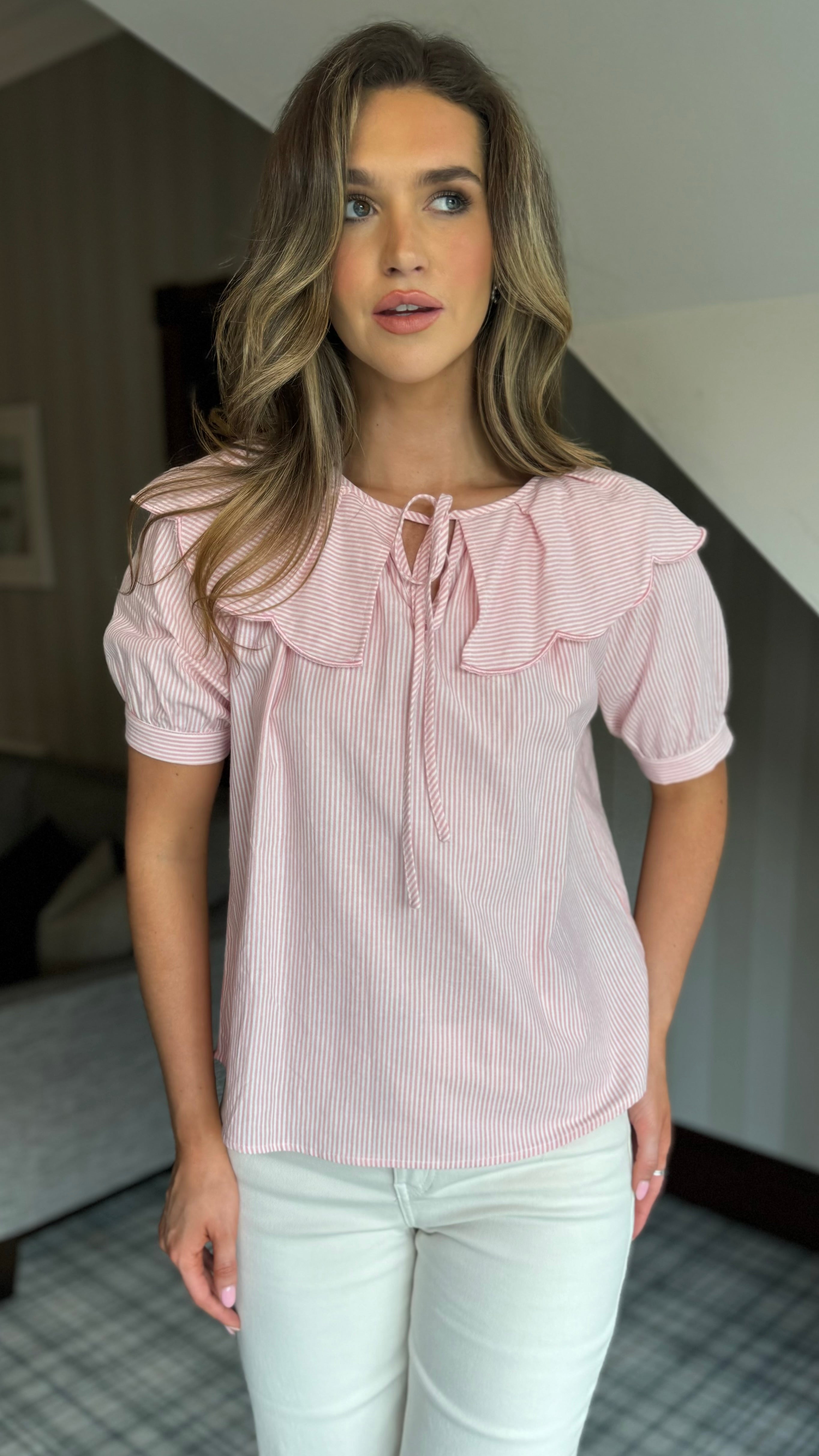 Get ready to turn heads with our Frankie Rose Pink Striped Collared Short Sleeve Top! With a playful tie detail and stylish pink stripes, this top is perfect for any casual or dressy occasion. Stand out in style and comfort! 😍