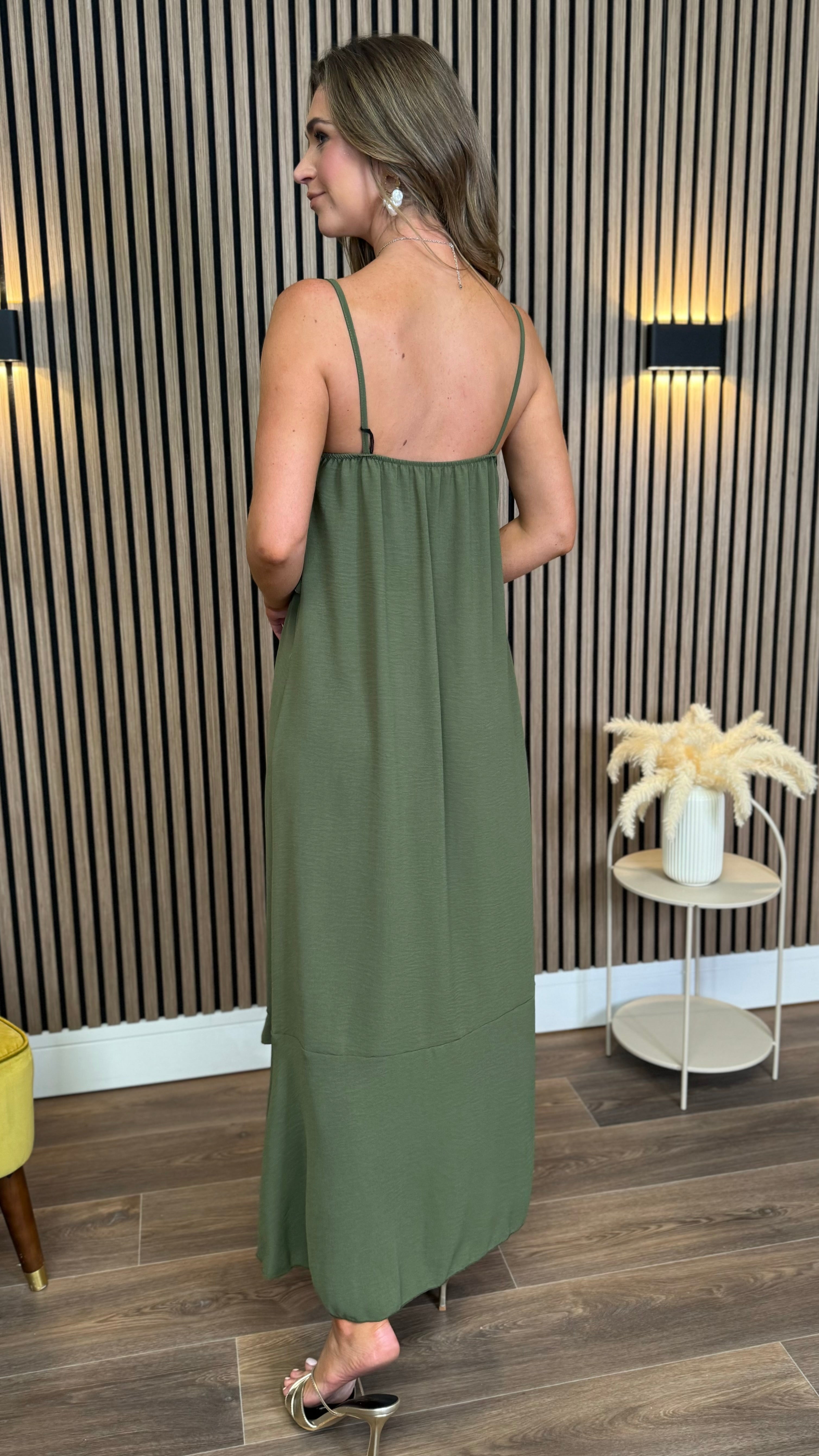 Harlow Khaki Cami Strap Ruffle Asymmetrical Detail Midaxi Dress