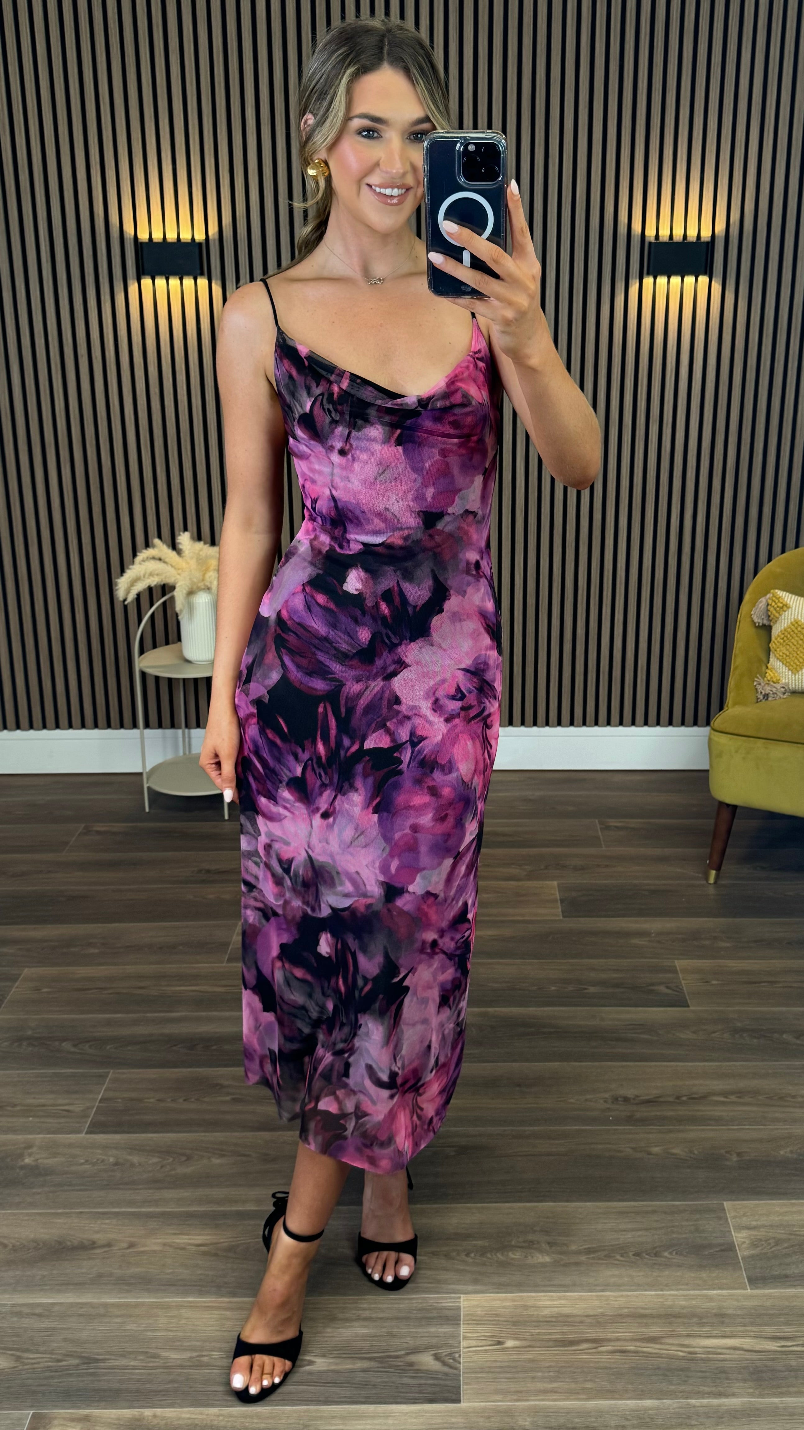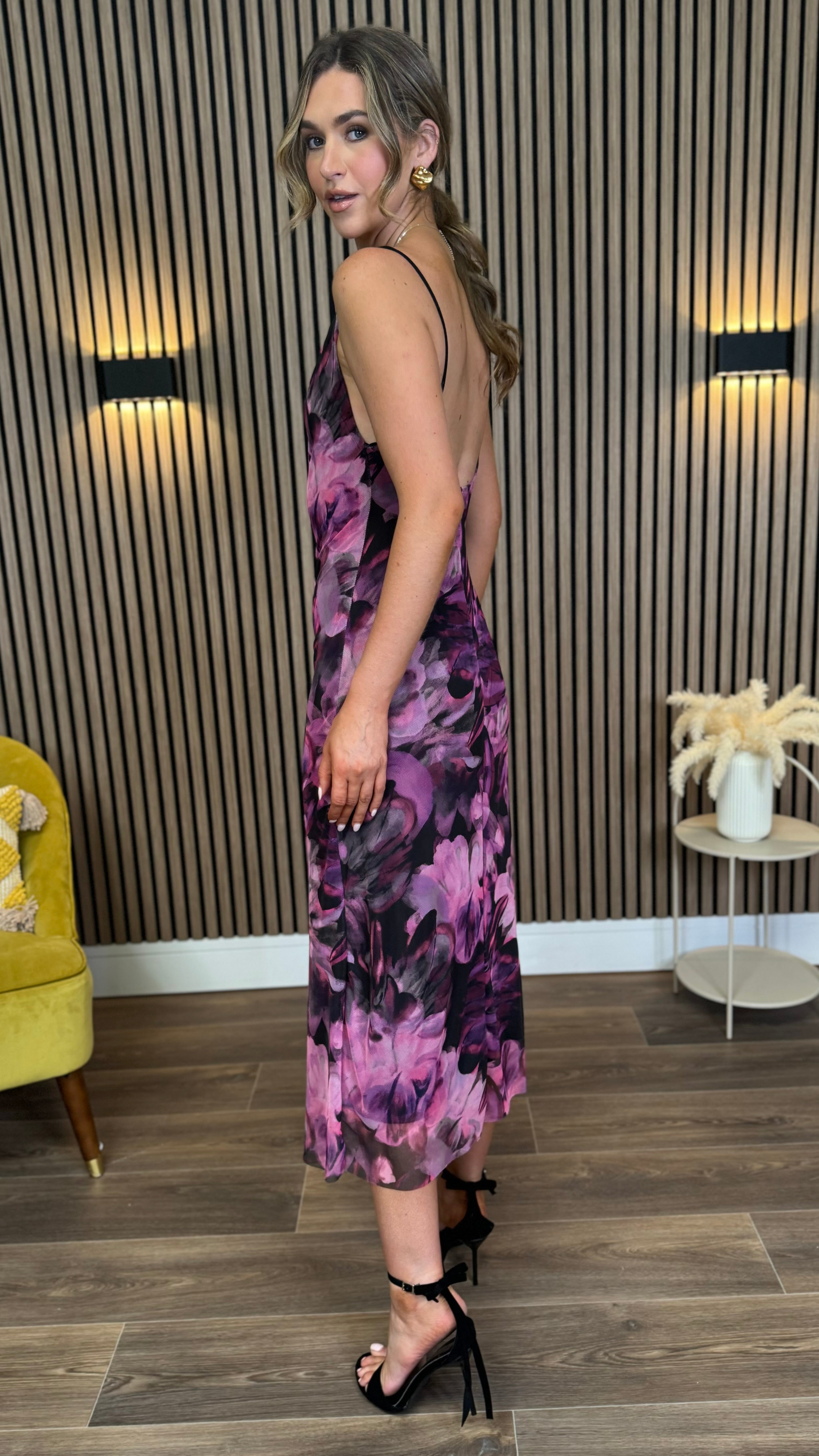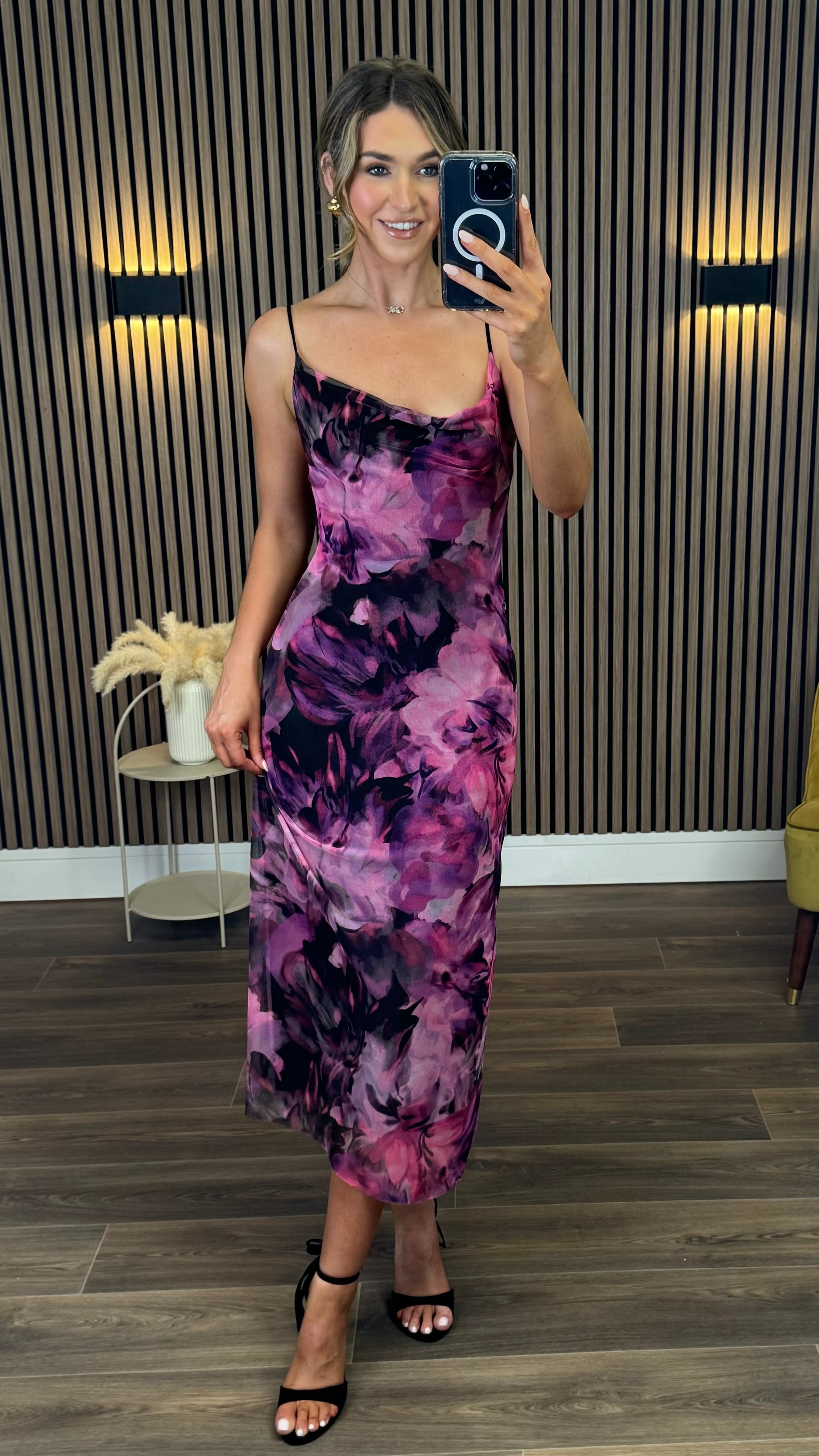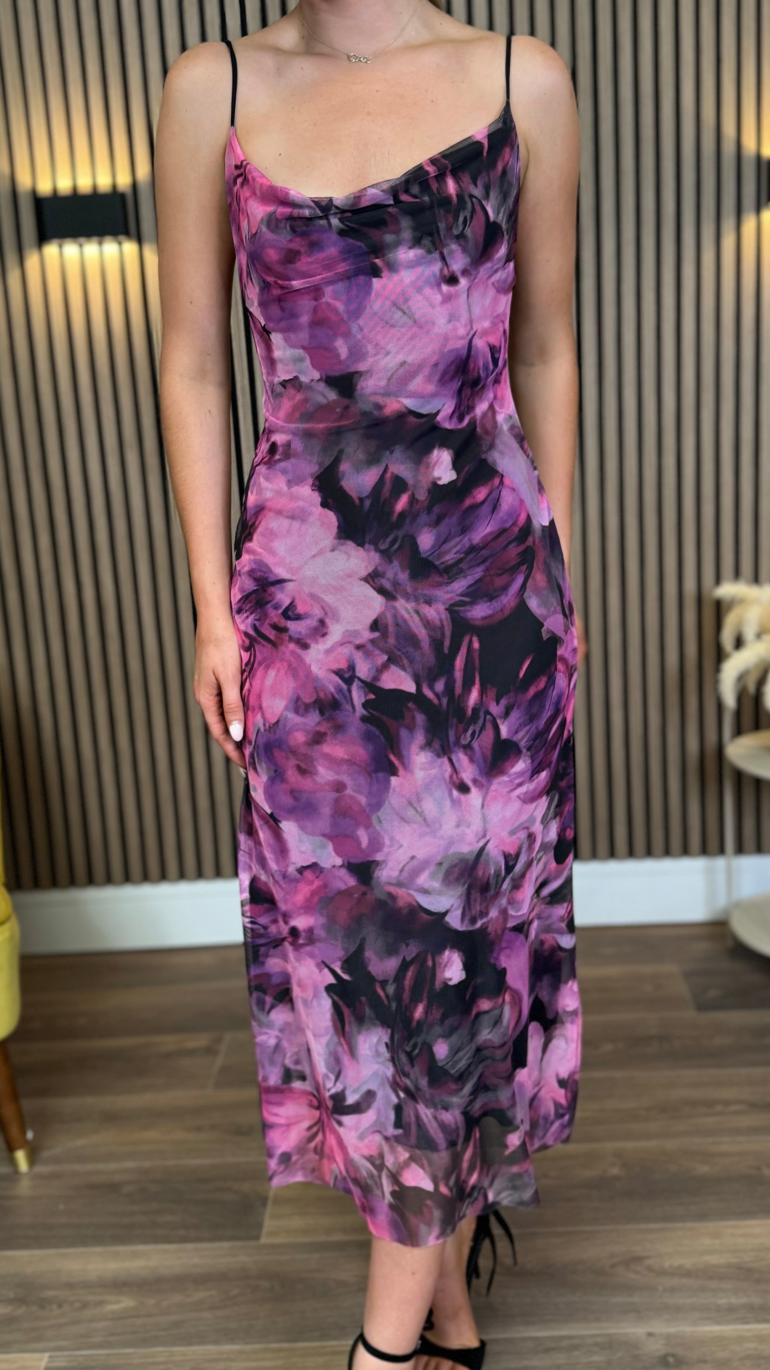 This Julia Black & Purple Abstract Floral Print Cami Strap Midi Dress combines delicate floral patterns with a graceful silhouette. The soft cami straps and flowing midi length create a charming look perfect for sunny days or special occasions. Feel confident and radiant in this lovely dress that brings a touch of artful elegance to your wardrobe. 🌸✨