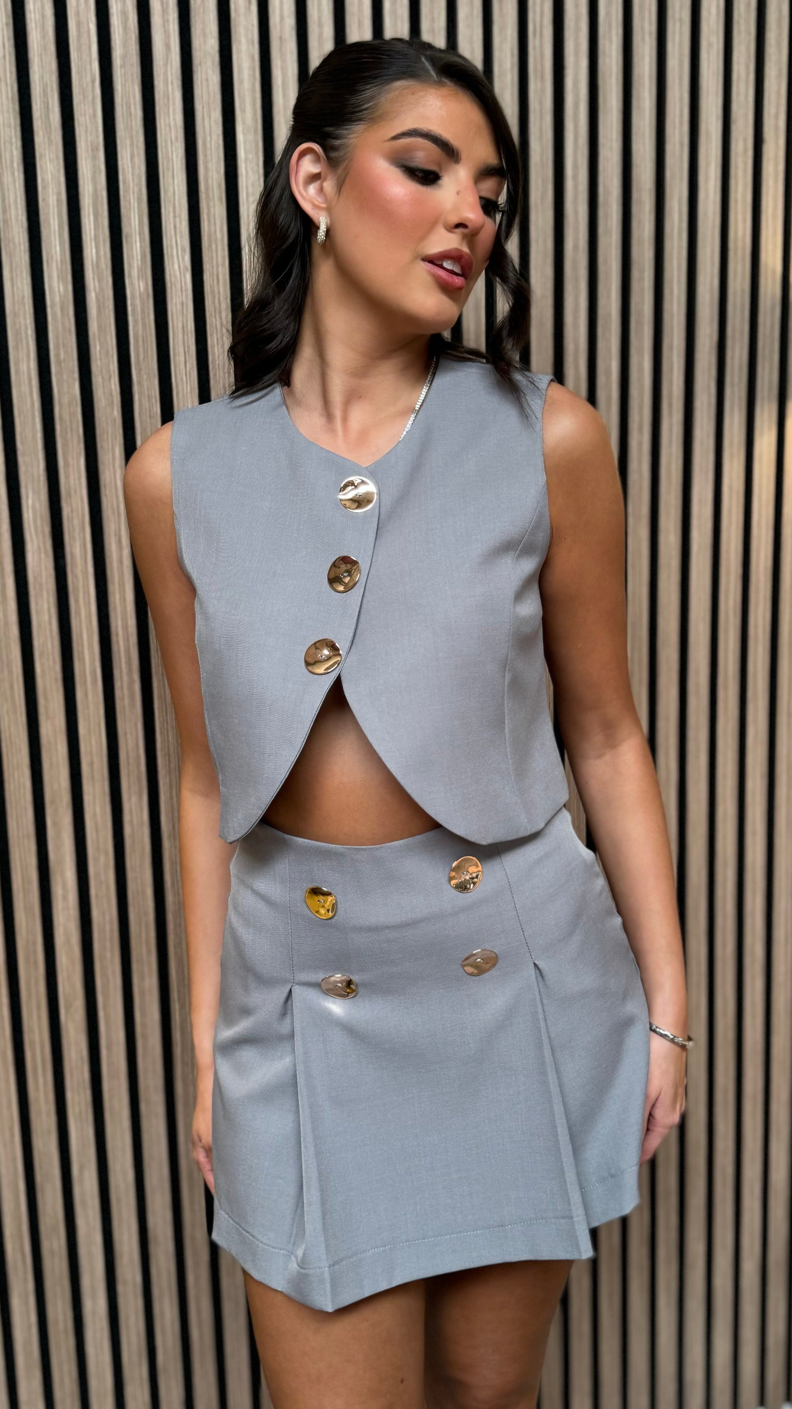 Get coordinated with the Louisa Grey Skort & Waistcoat Co Ord set! This stylish ensemble features gold button detailing on both the skort and crop waistcoat for a touch of elegance. Perfect for adding a playful and polished twist to your wardrobe. 🌟