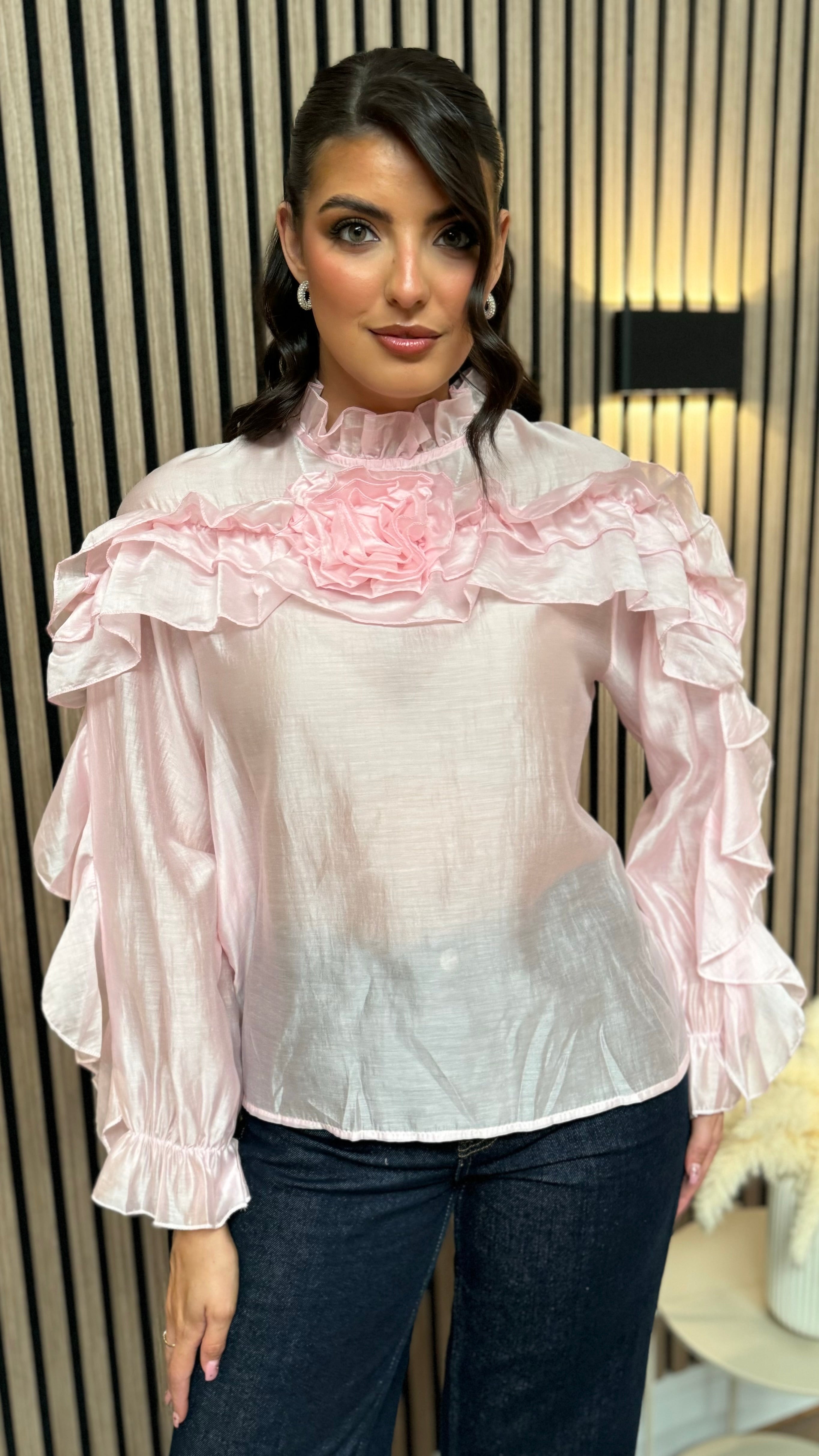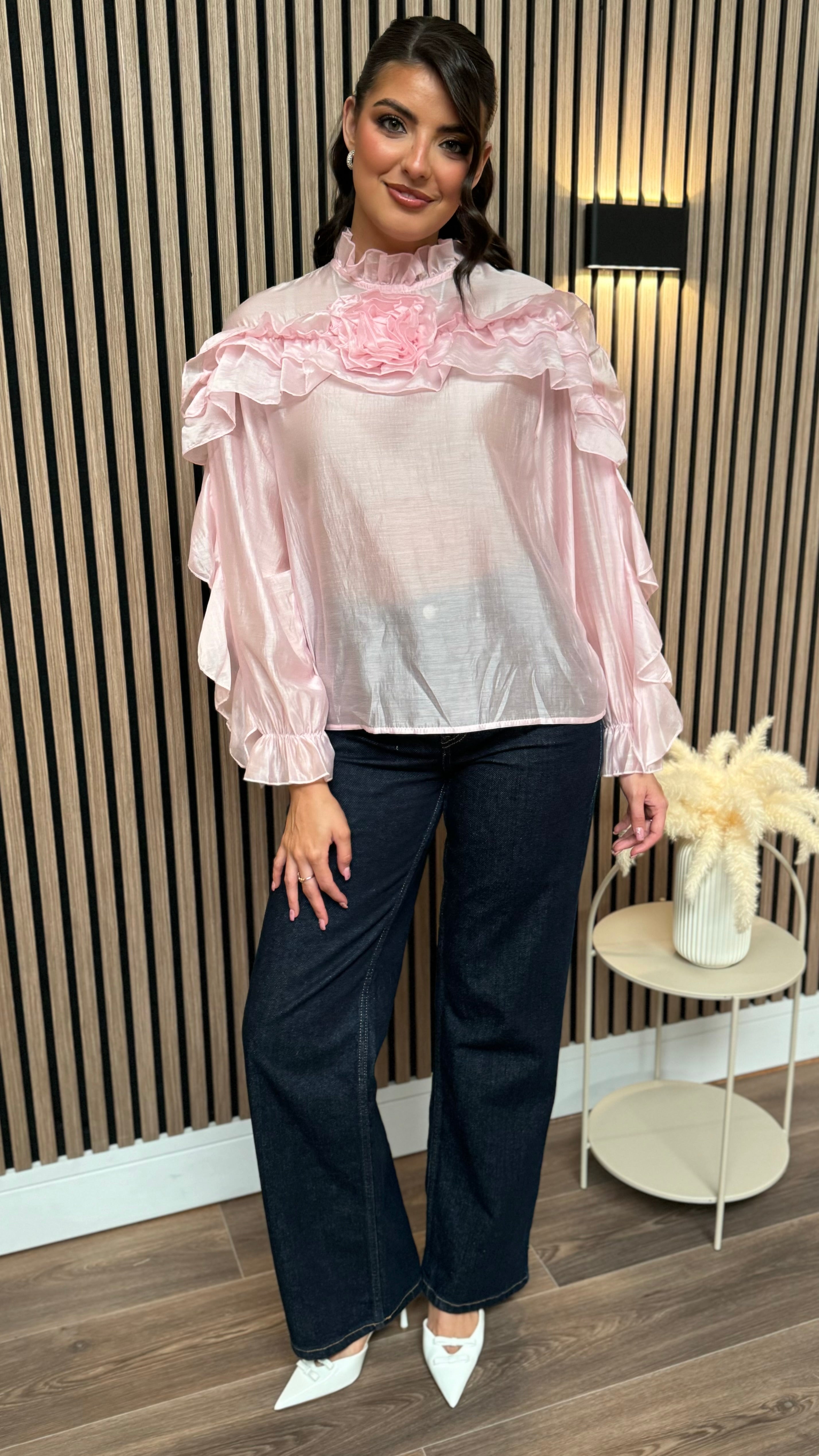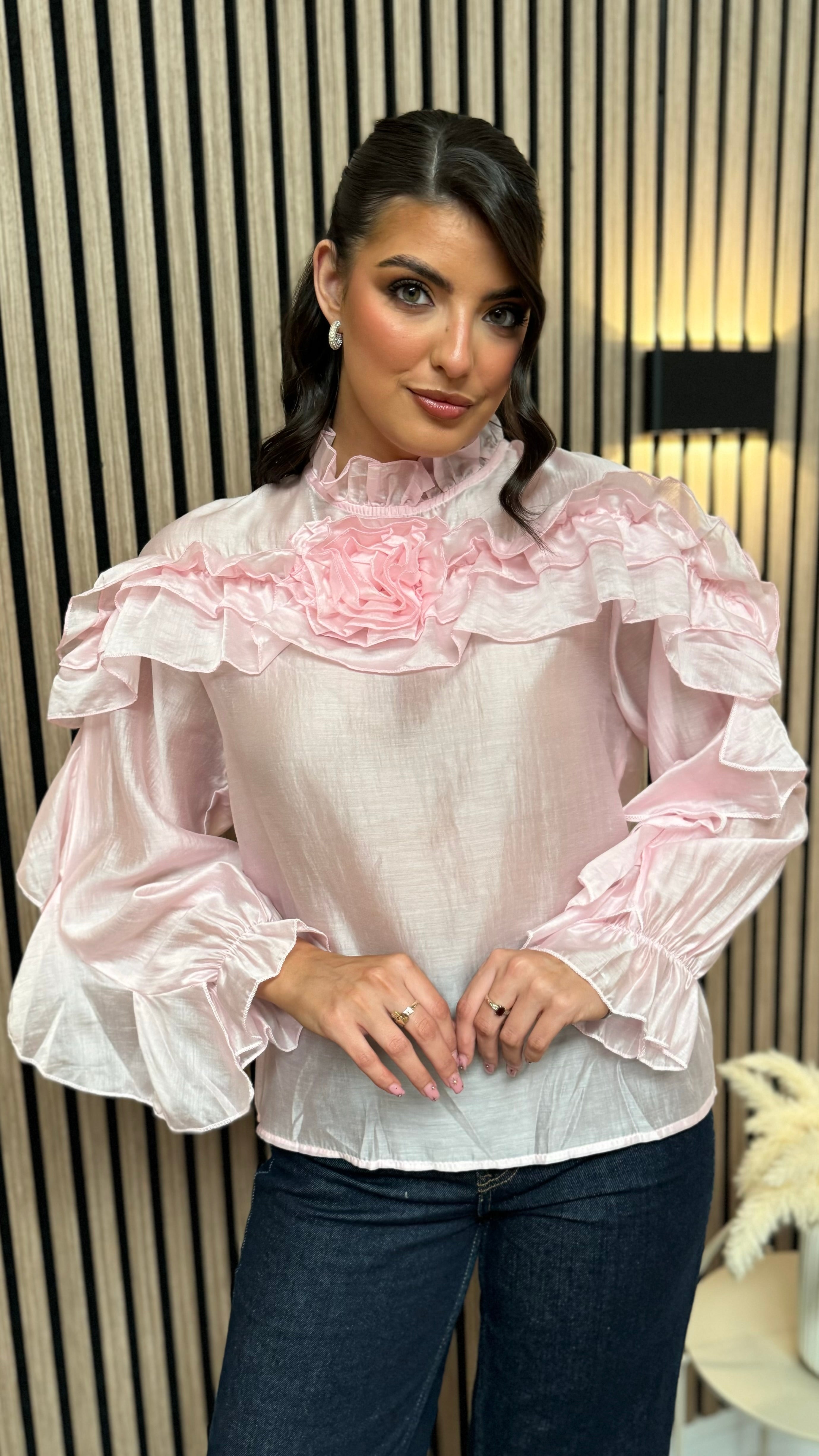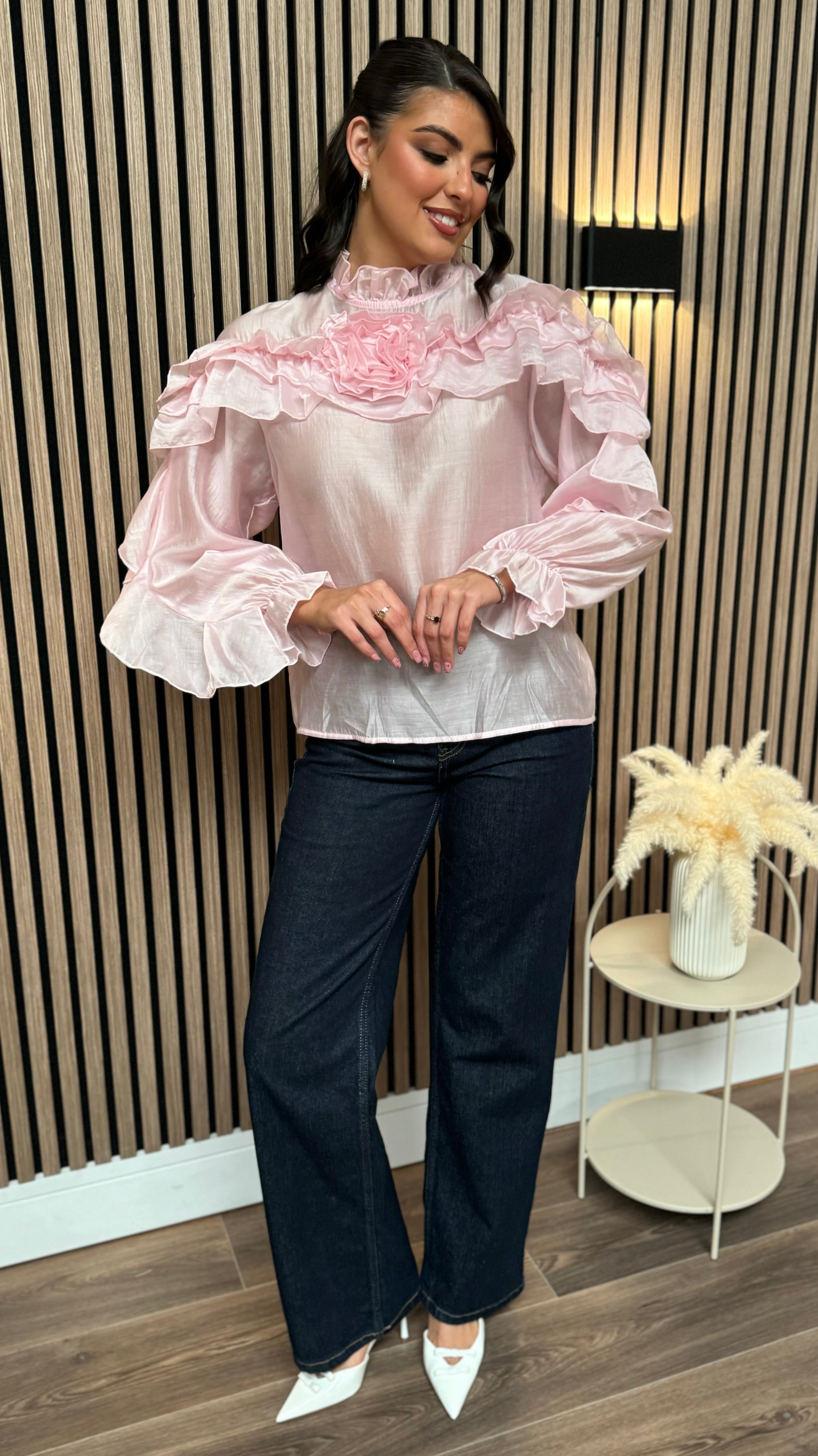 Get ready to turn heads with the Maxine Pink Frill Detail High Neck Top! 🌸 This unique top features delicate flower details and a flattering frill and high neck design. With long sleeves, you'll be stylish and covered all night long. 💕
