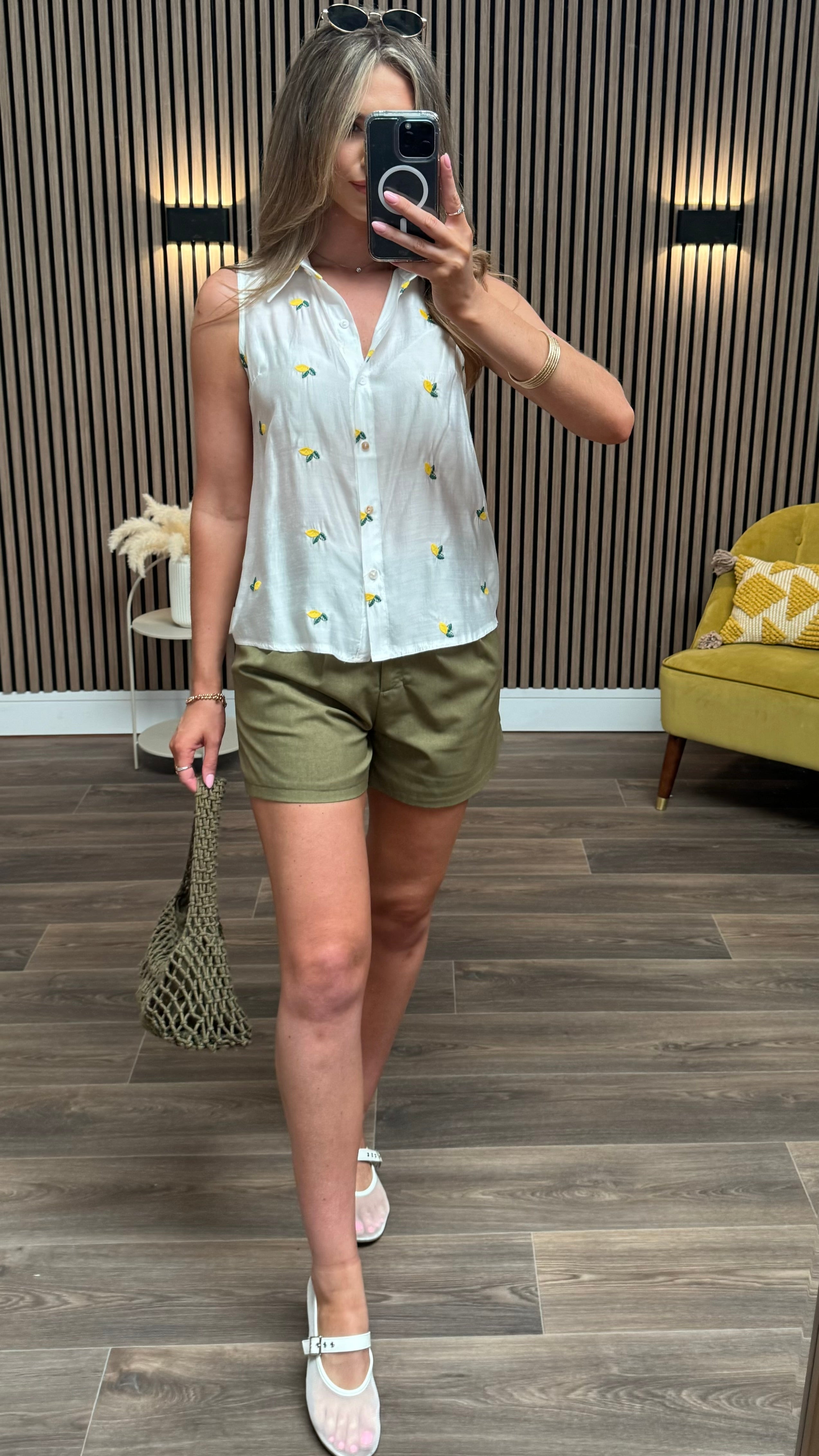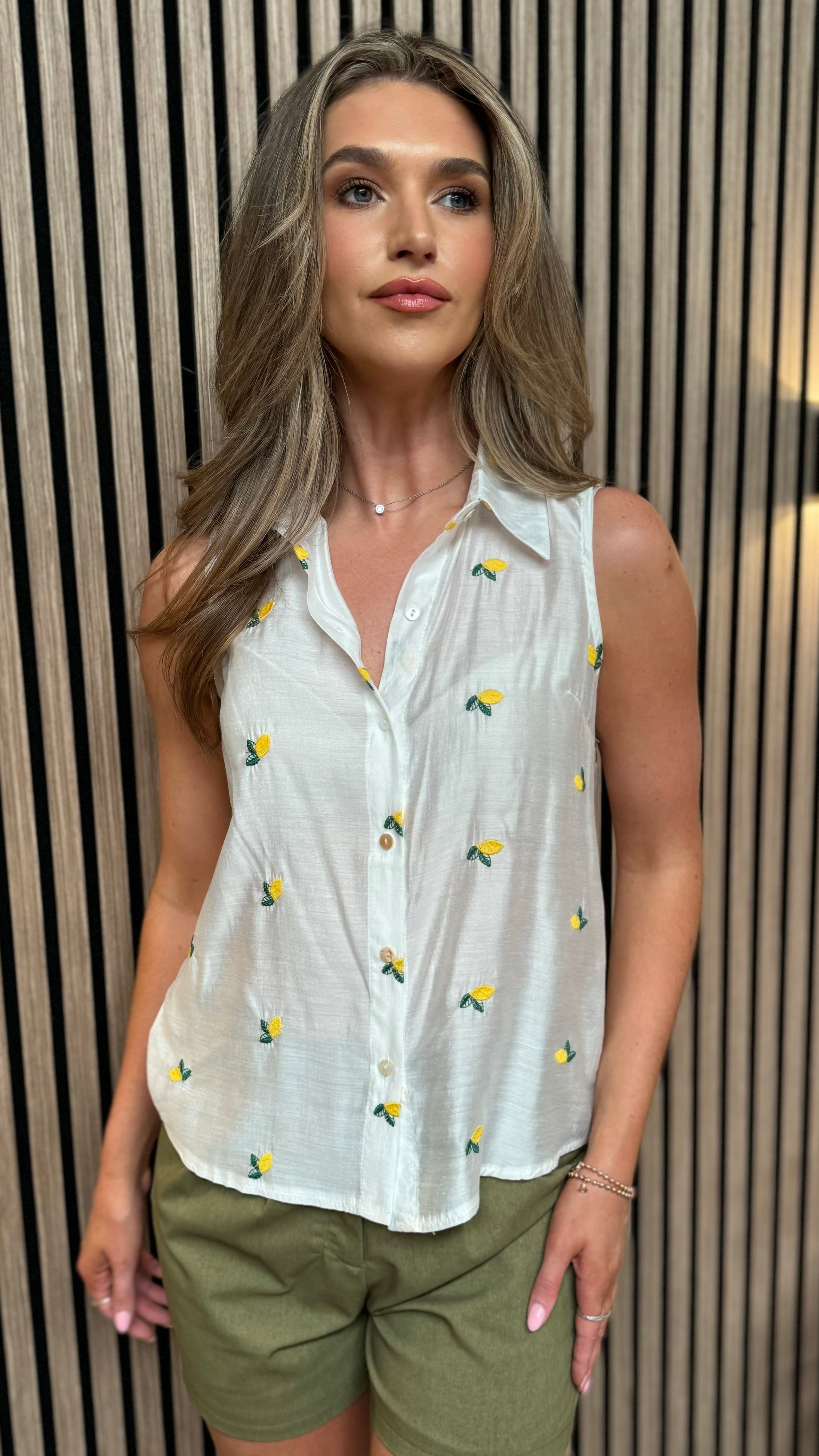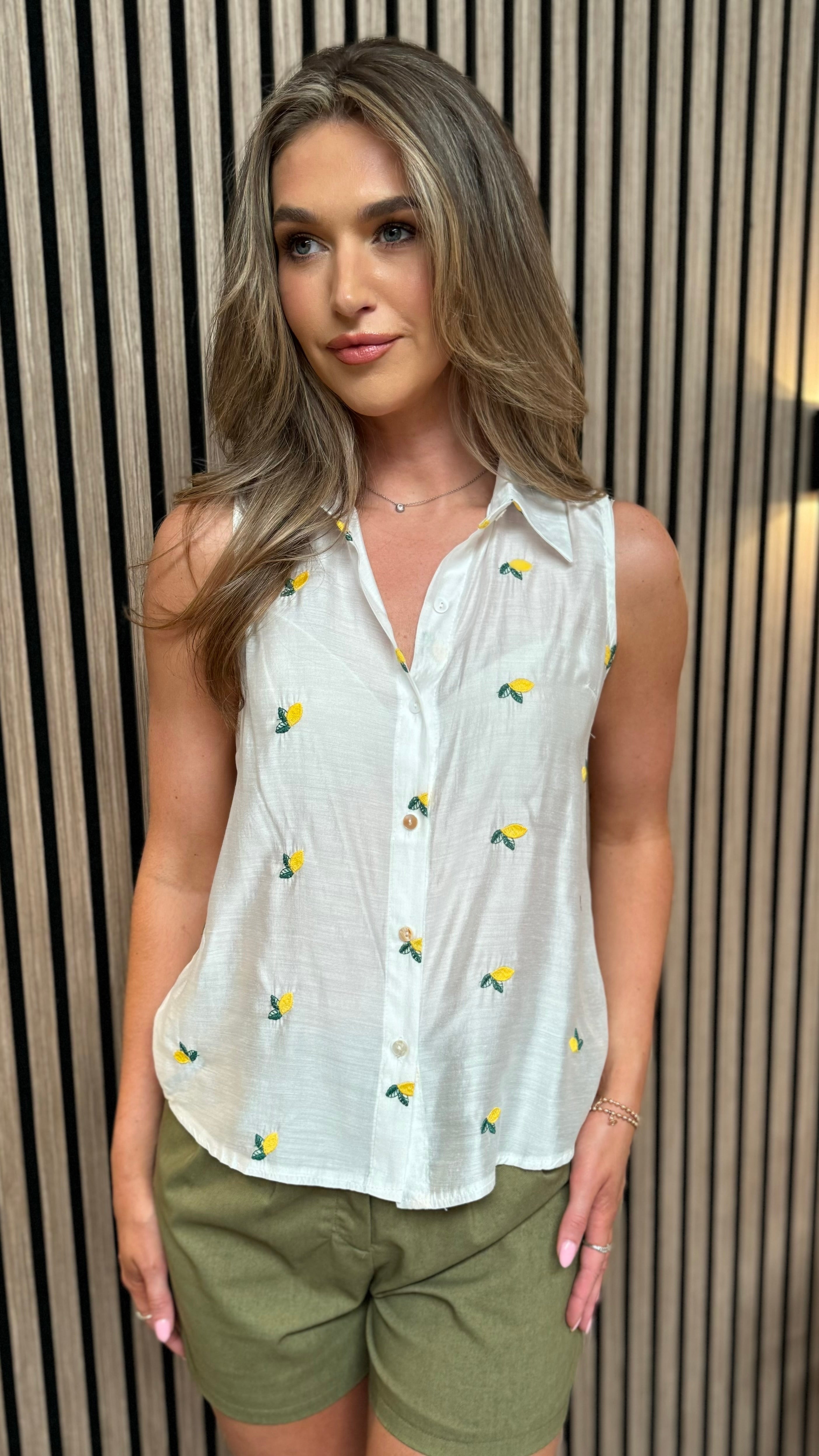 This Sacha White Sleeveless Lemon Print Shirt is more than just a pretty face. Its silky sheen adds a touch of luxury to your wardrobe while the playful lemon print brings a bit of whimsy. Perfect for those who don't take themselves too seriously. (No pun intended.)