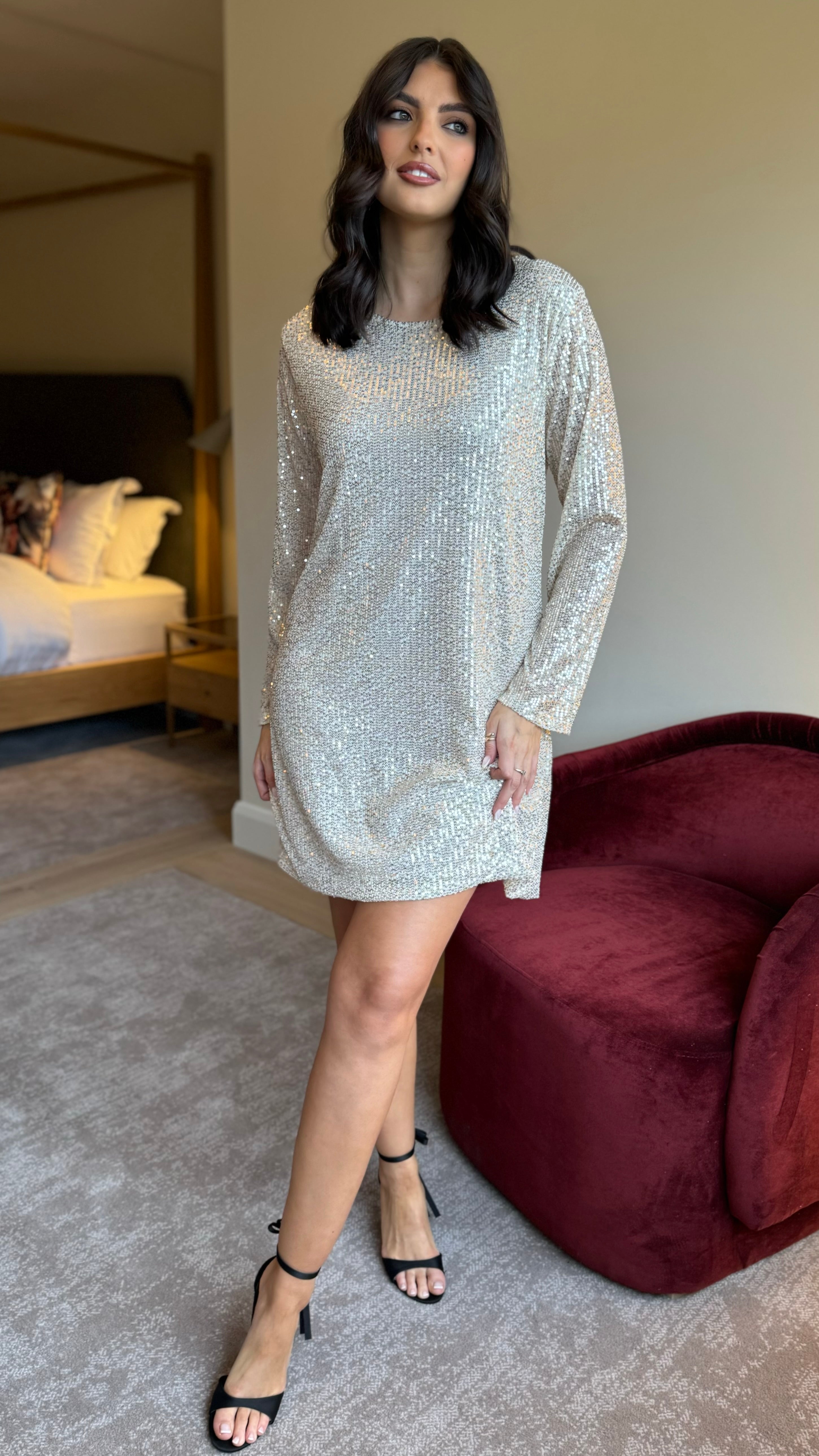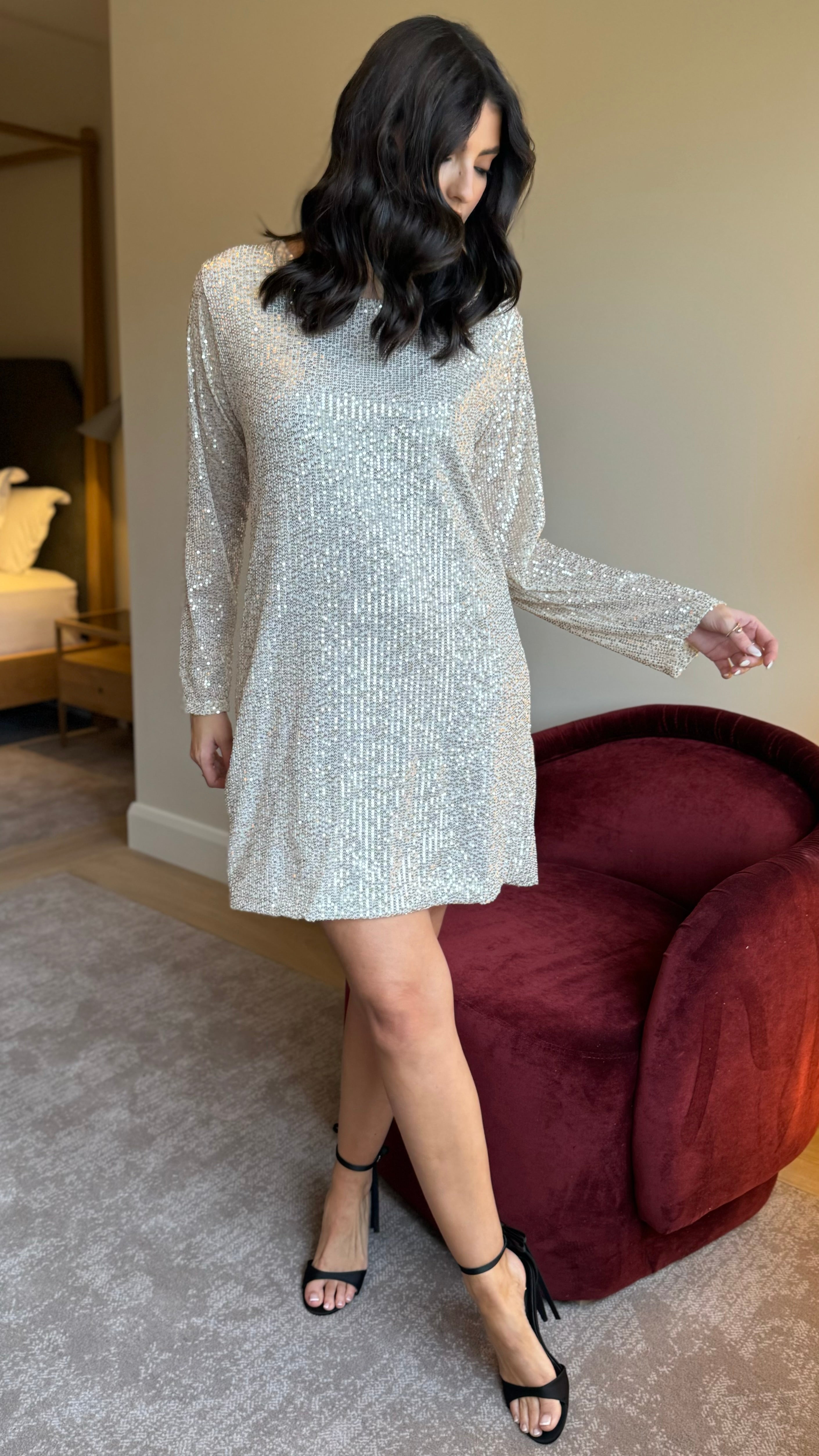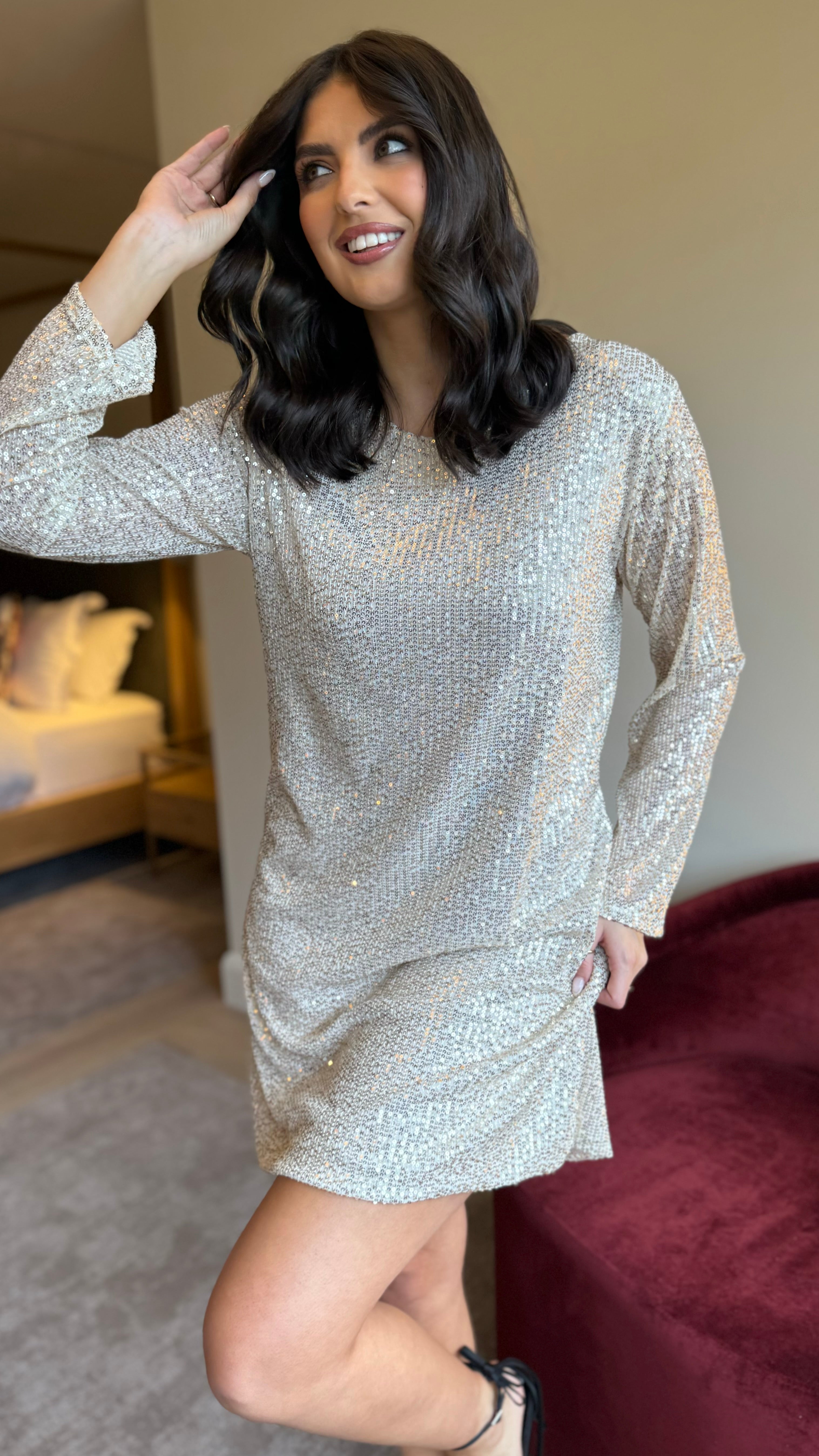 Shine and sparkle in the Brogan Champagne Sequin Mini Dress! This playful dress features a charming bow detail at the back, adding a unique touch to your look. With its slightly wide cuff and round neckline, this dress is perfect for any occasion. Get ready to turn heads and have some fun in this dazzling dress!