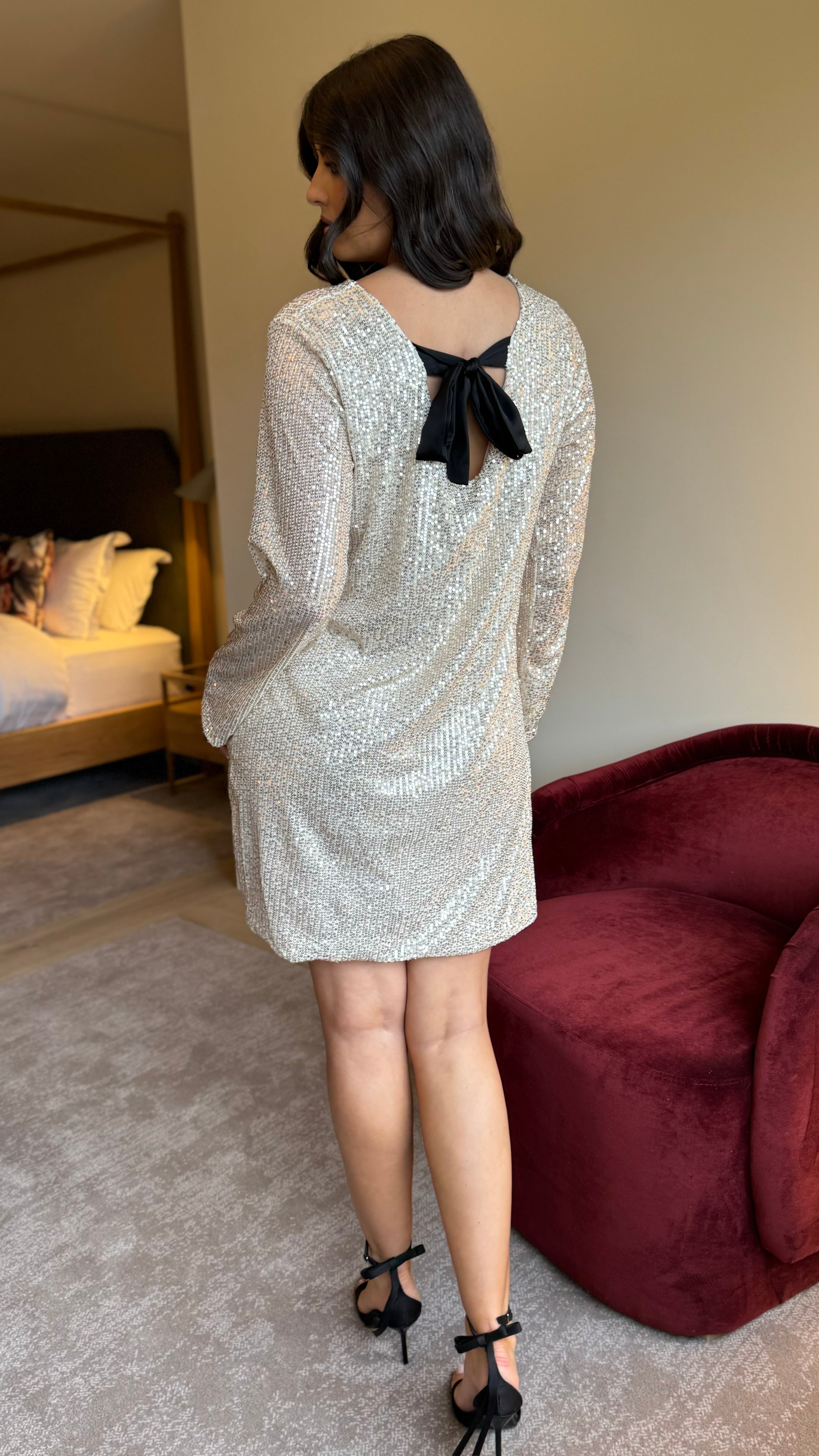 Brogan Champagne Bow Detail Sequin Mini Dress