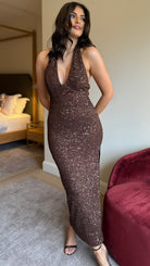 Turn heads in this stunning Hester Brown Sequin Halterneck Maxi Dress. The plunging halterneck and fitted silhouette create an effortlessly glamorous look, while the maxi length keeps things sophisticated. A daring side slit adds movement and flair, and the tie fastening at the back of the neck ensures a secure, adjustable fit. Perfect for making a sparkling statement at your next event.