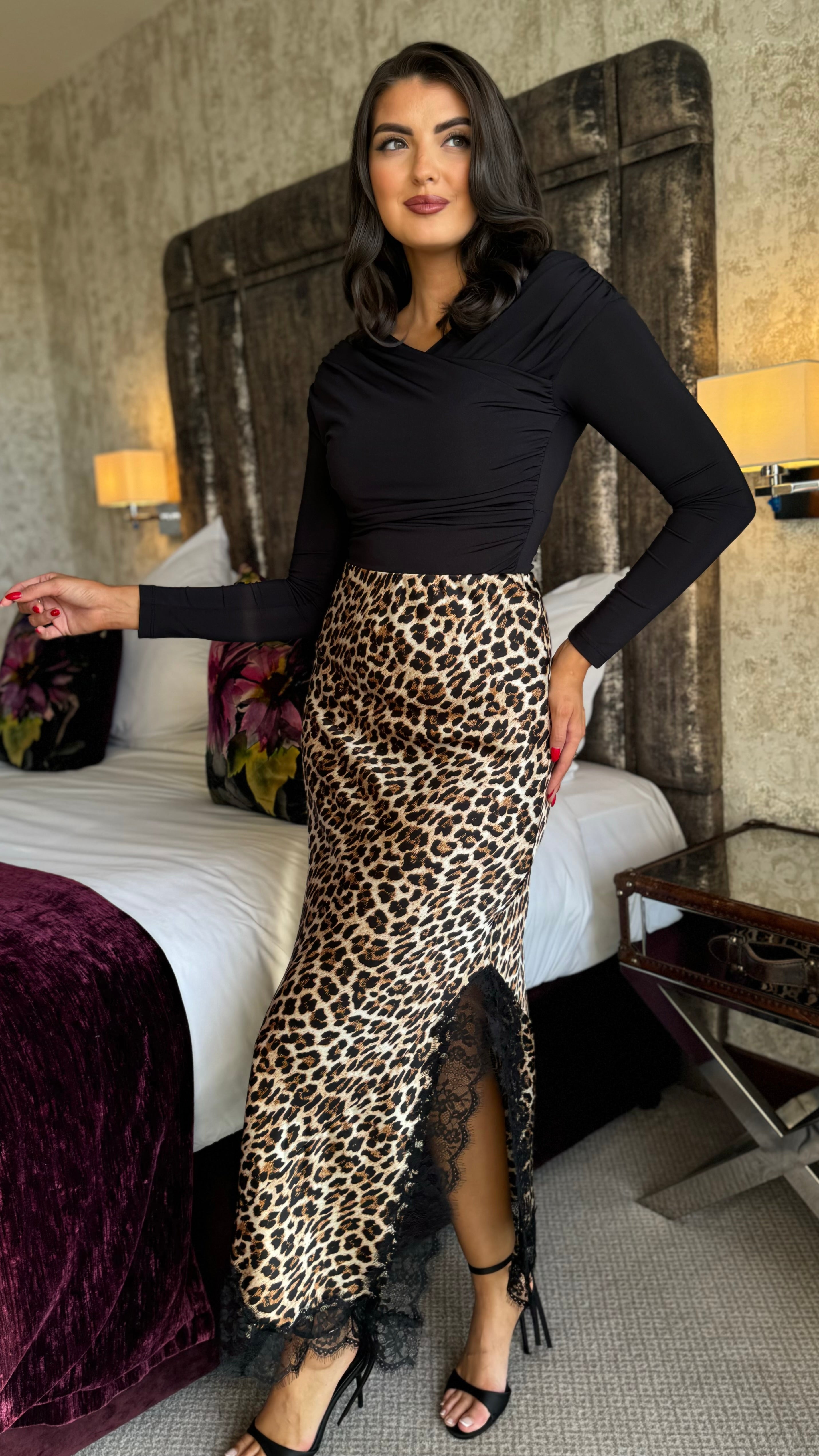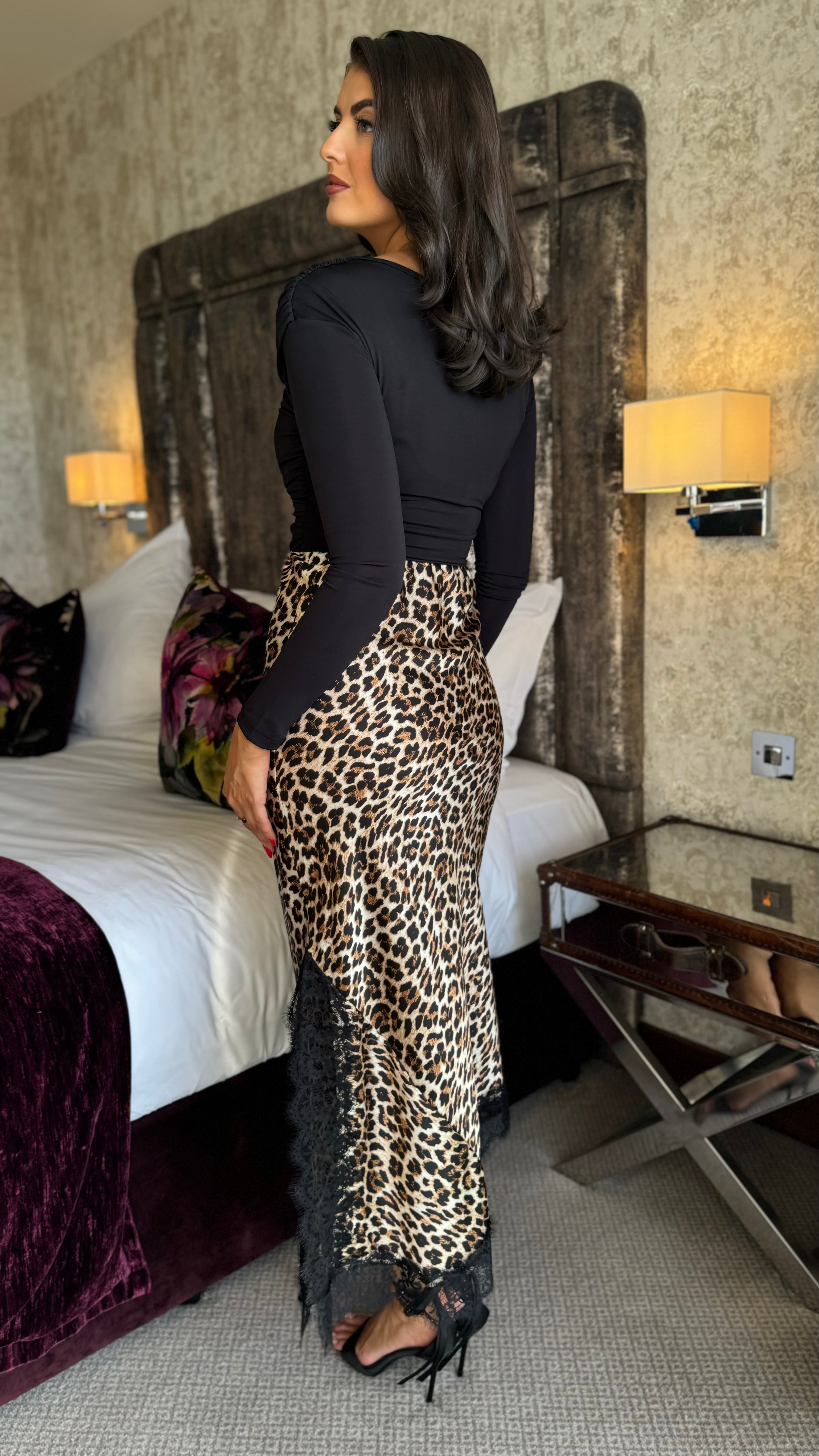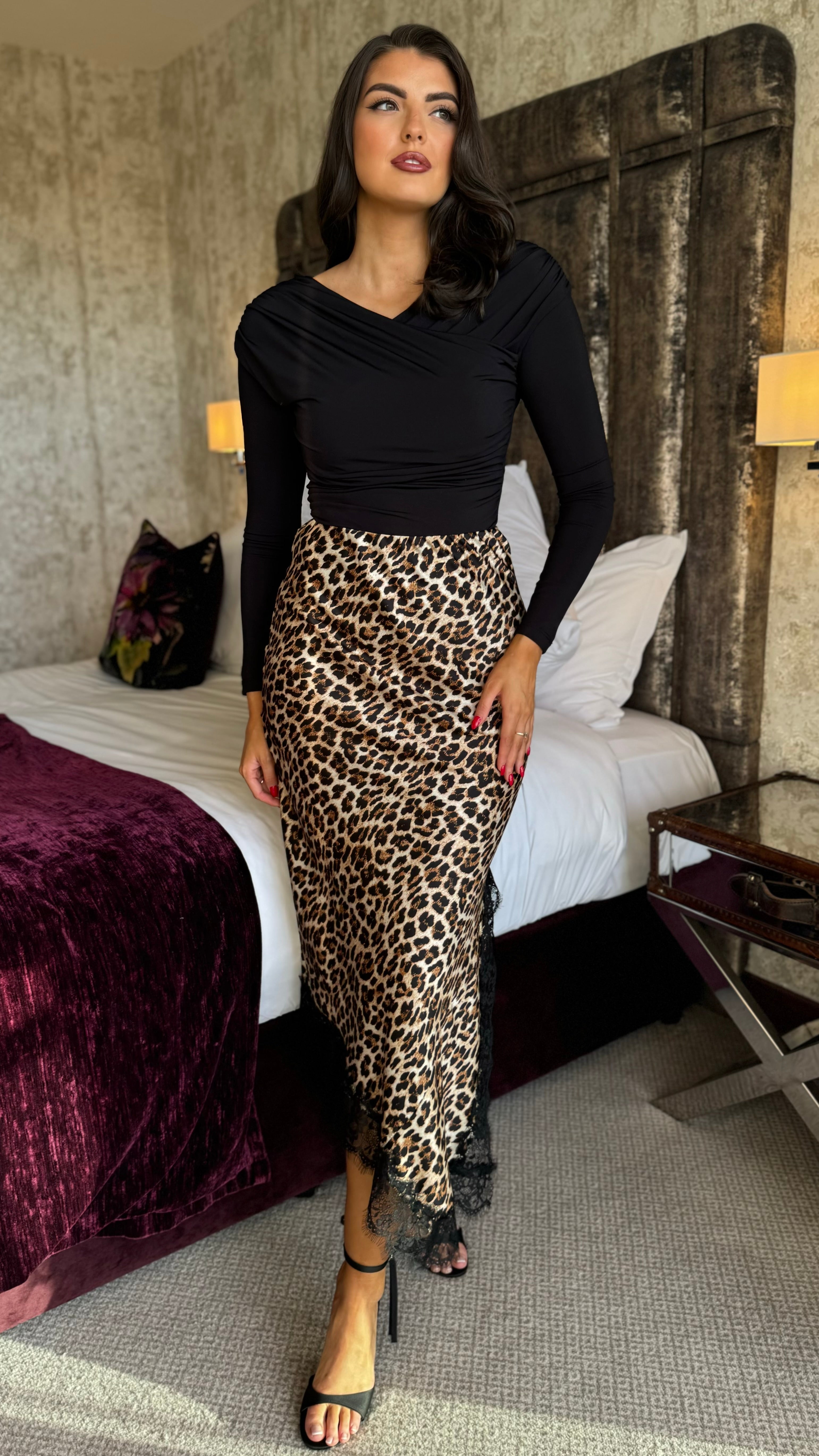 Naya Leopard Print & Black Lace Hem Satin Slip Skirt