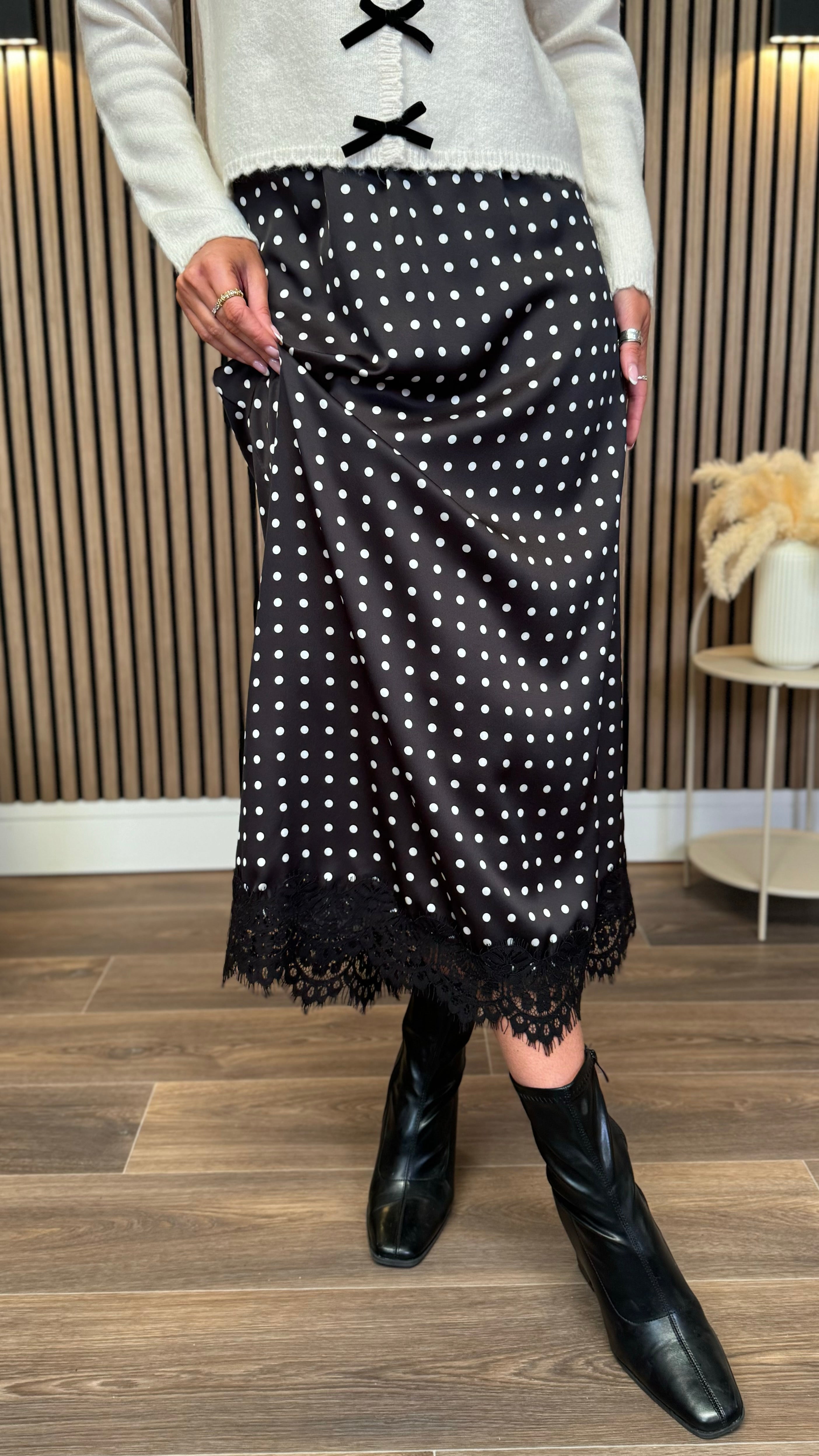 Flirt with fun style in the Salem Black Polka Dot Satin Slip Skirt. Its high-waisted fit with an elasticated waistband ensures comfort that moves with you, while the delicate lace trim adds a cheeky touch of elegance. Perfect for dancing through the day or twirling into the night!