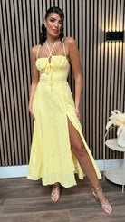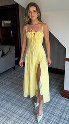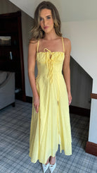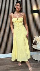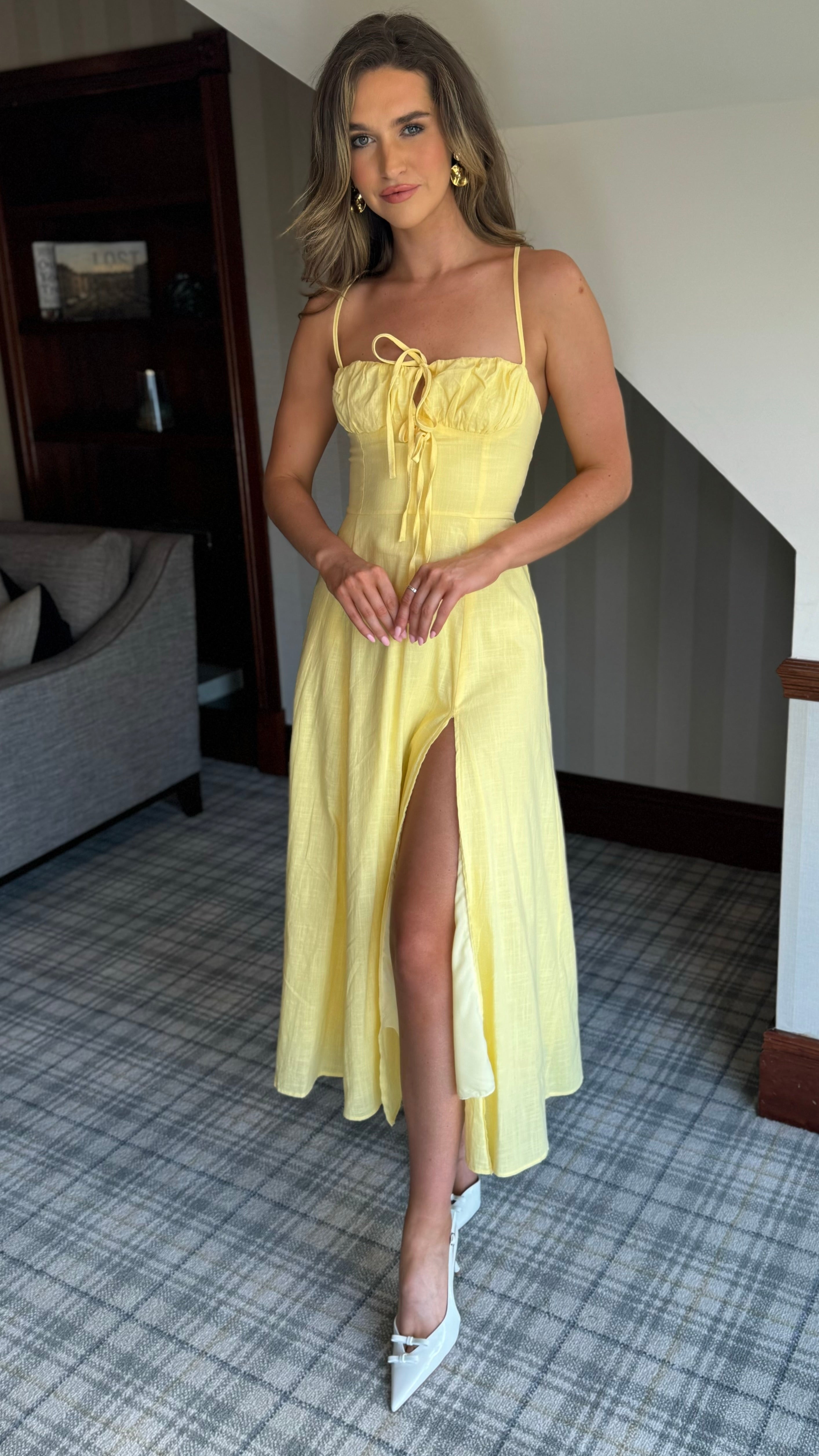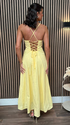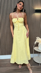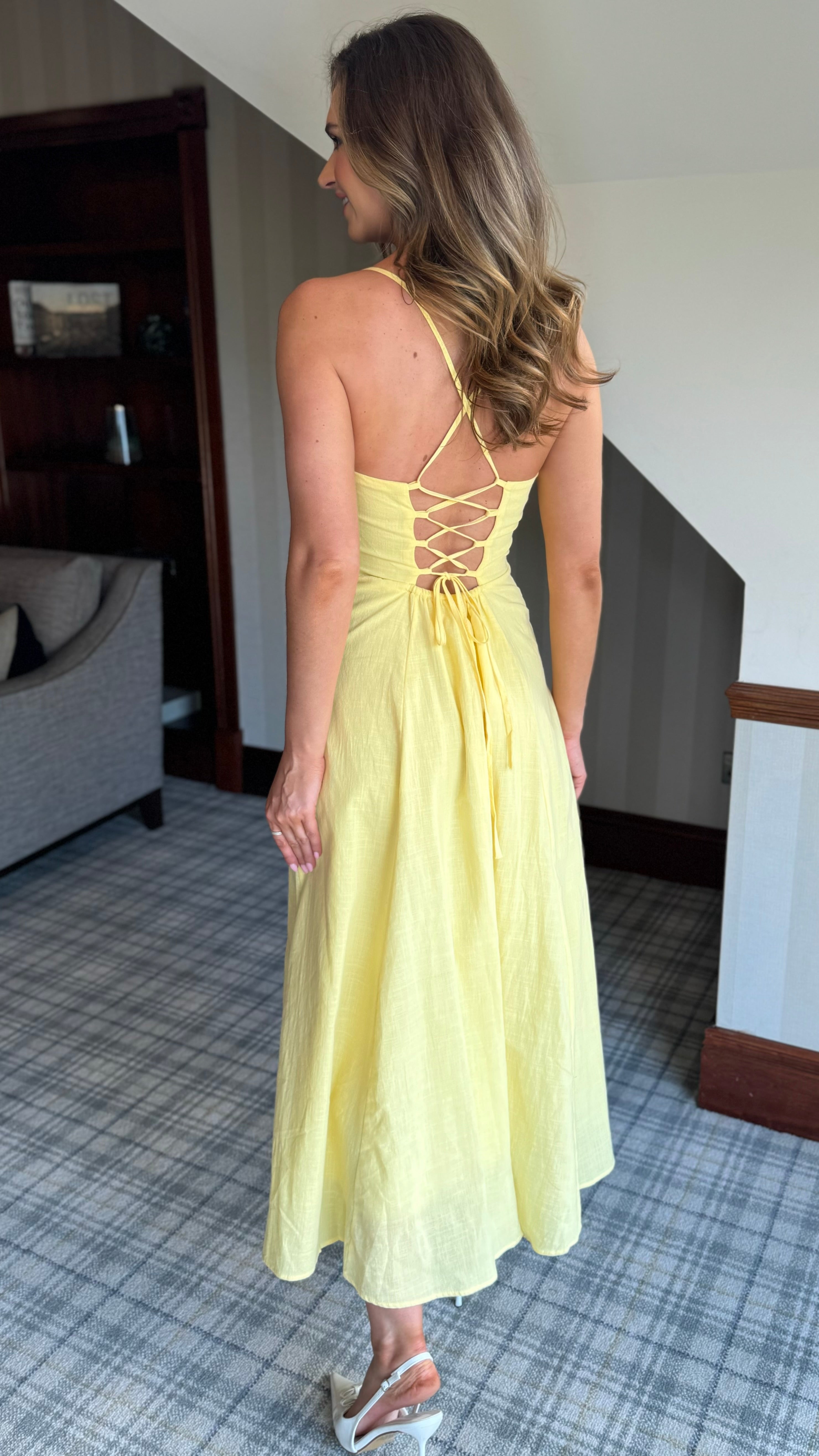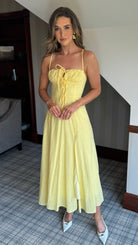 Get some moxie in your wardrobe with our Yellow Milkmaid Midi Dress! Made with soft cotton, this midi dress features tie up straps and a playful tie up back. Perfect for any occasion, this dress adds a fun and flirty touch to any outfit. 🌻😉