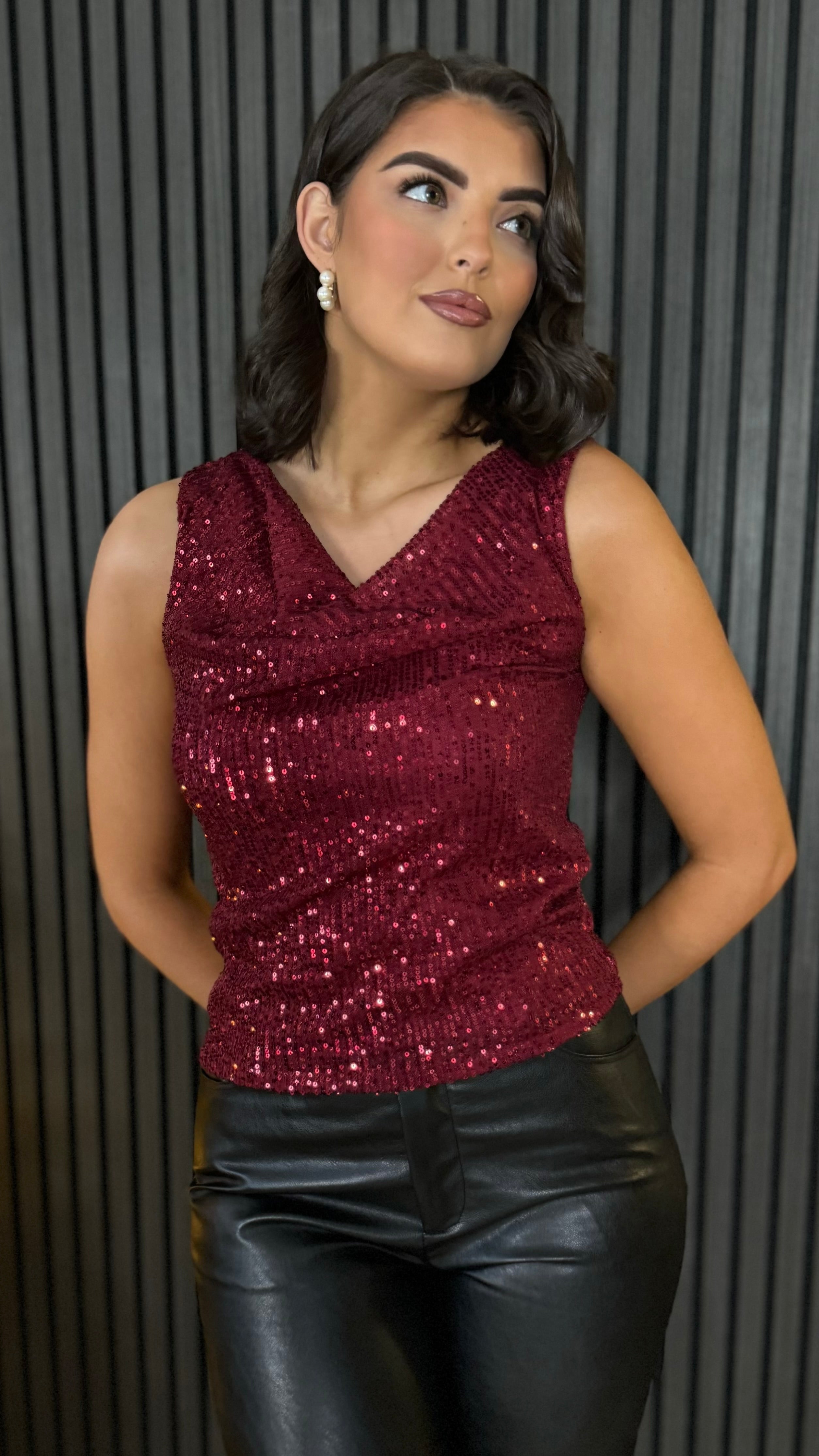Slip into pure sparkle with the Bree Burgundy Cowl Neck Sequin Top. This sleek sleeveless design features a dramatic cowl neckline that drapes beautifully, paired with a flattering V-neck cut underneath. Covered in shimmering sequins, it's your go-to piece for nights when you want to catch the light and turn heads. Dress it up for parties or layer it for unexpected edge—this top transforms any outfit into something unforgettable.