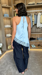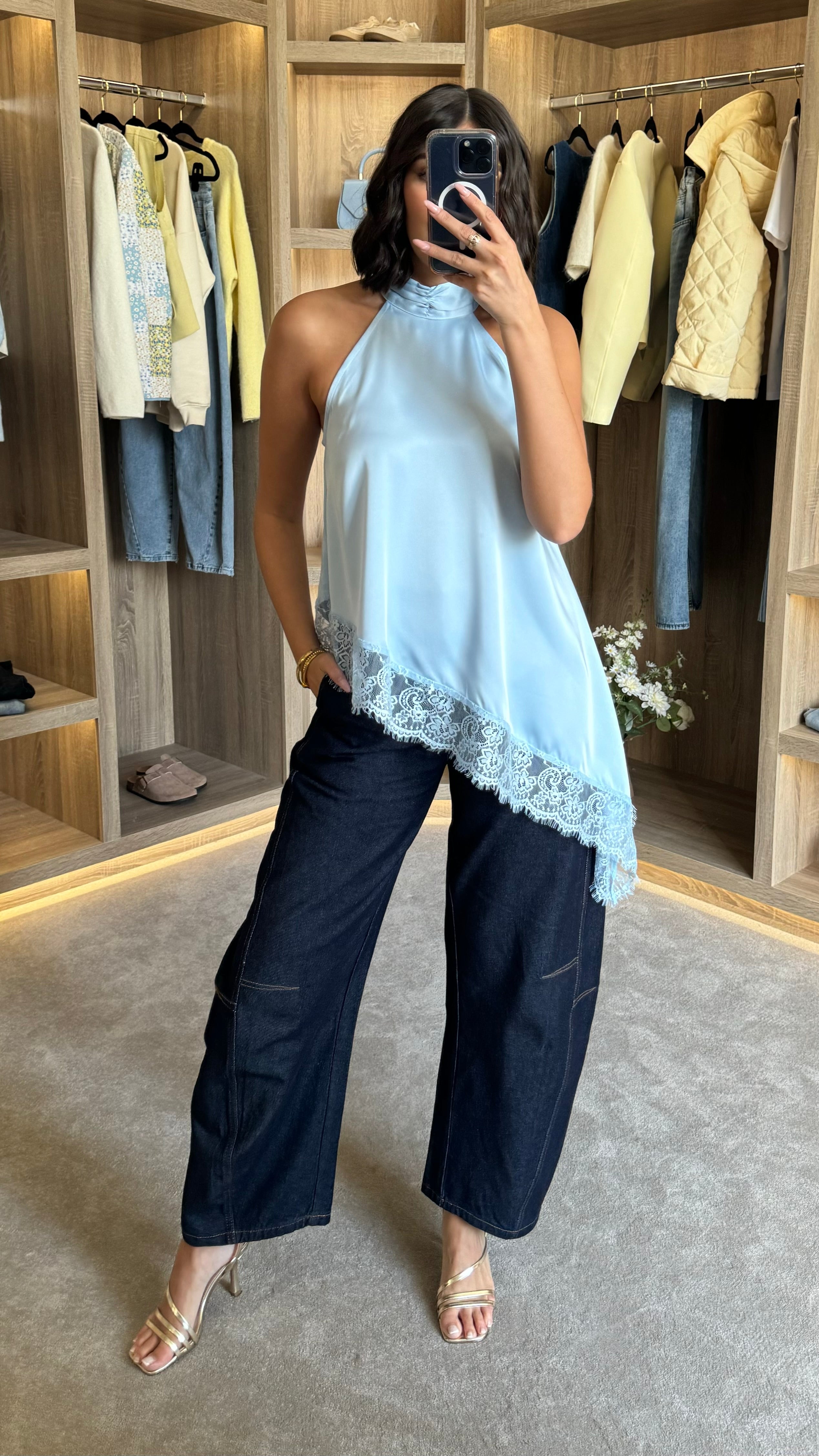 Elevate your everyday edit with this contemporary top, defined by a striking choker neckline and functional button closure at the back. The asymmetric lace hemline adds movement and visual interest, while the smooth satin fabric drapes with understated luxury. A versatile piece that transitions effortlessly from day to evening, perfect for layering or wearing solo.