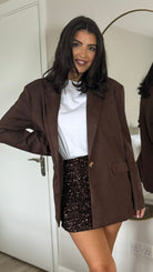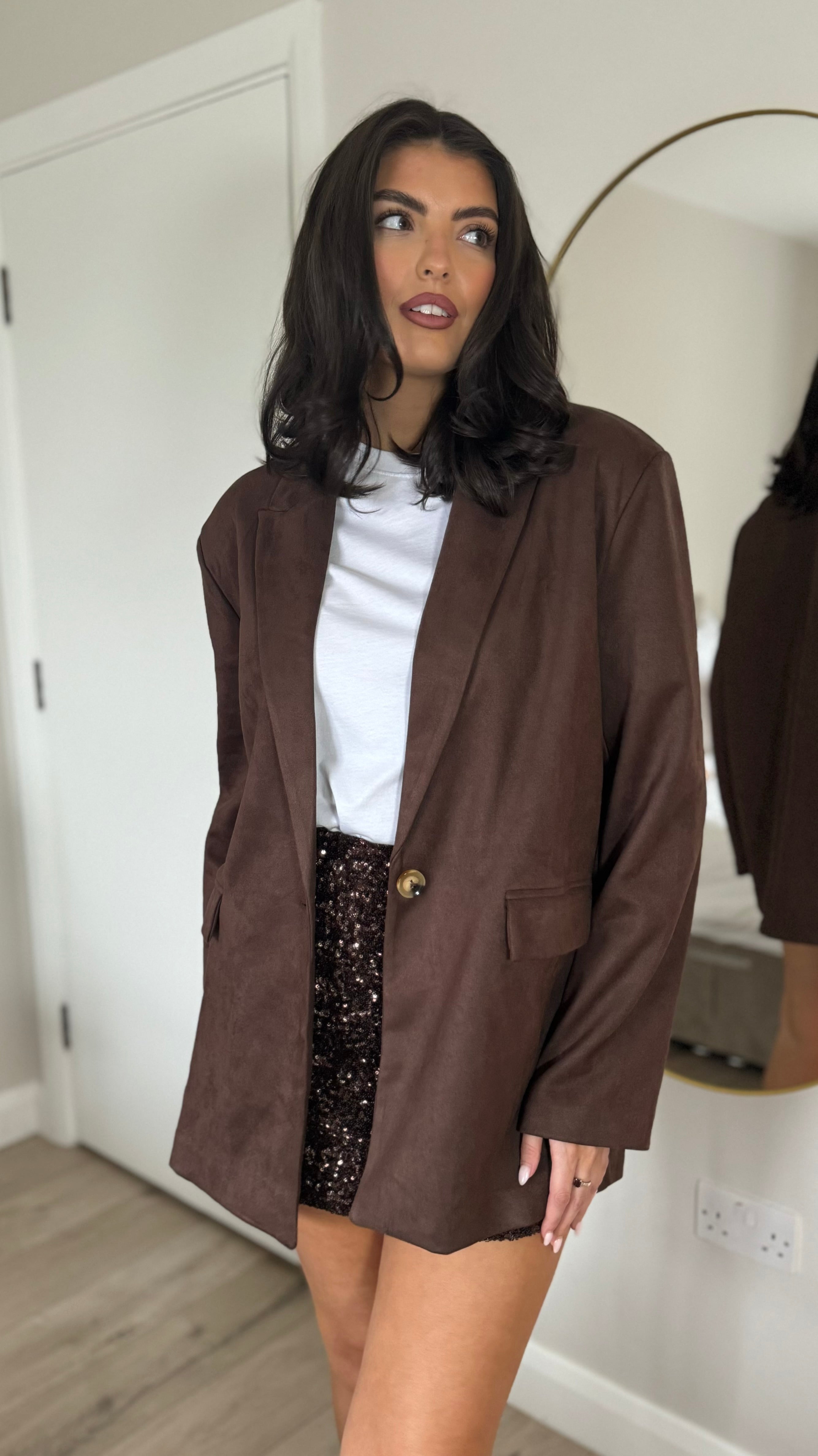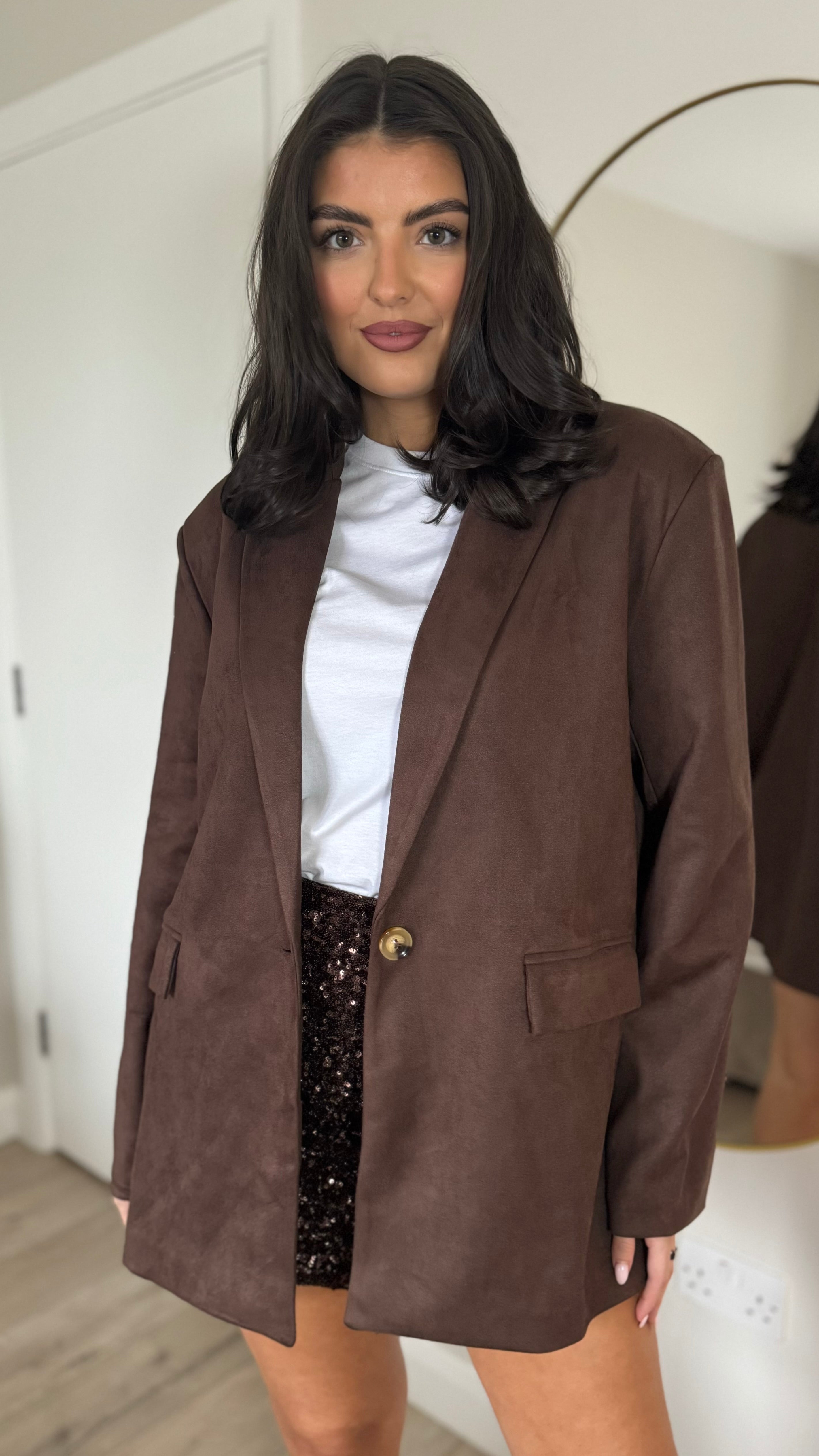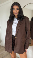 Throw on this Amanda Brown Faux Suede Oversized Blazer and instantly level up your vibe. The relaxed, oversized silhouette pairs perfectly with everything from fitted tees to flowing dresses, while the single button closure keeps things effortlessly chic. Notched lapels give it that polished edge, and the two functional flap patch pockets mean you've actually got somewhere to stash your essentials. Smooth inner lining keeps you comfy all day long. Your new go-to layer for looking put-together without trying too hard.