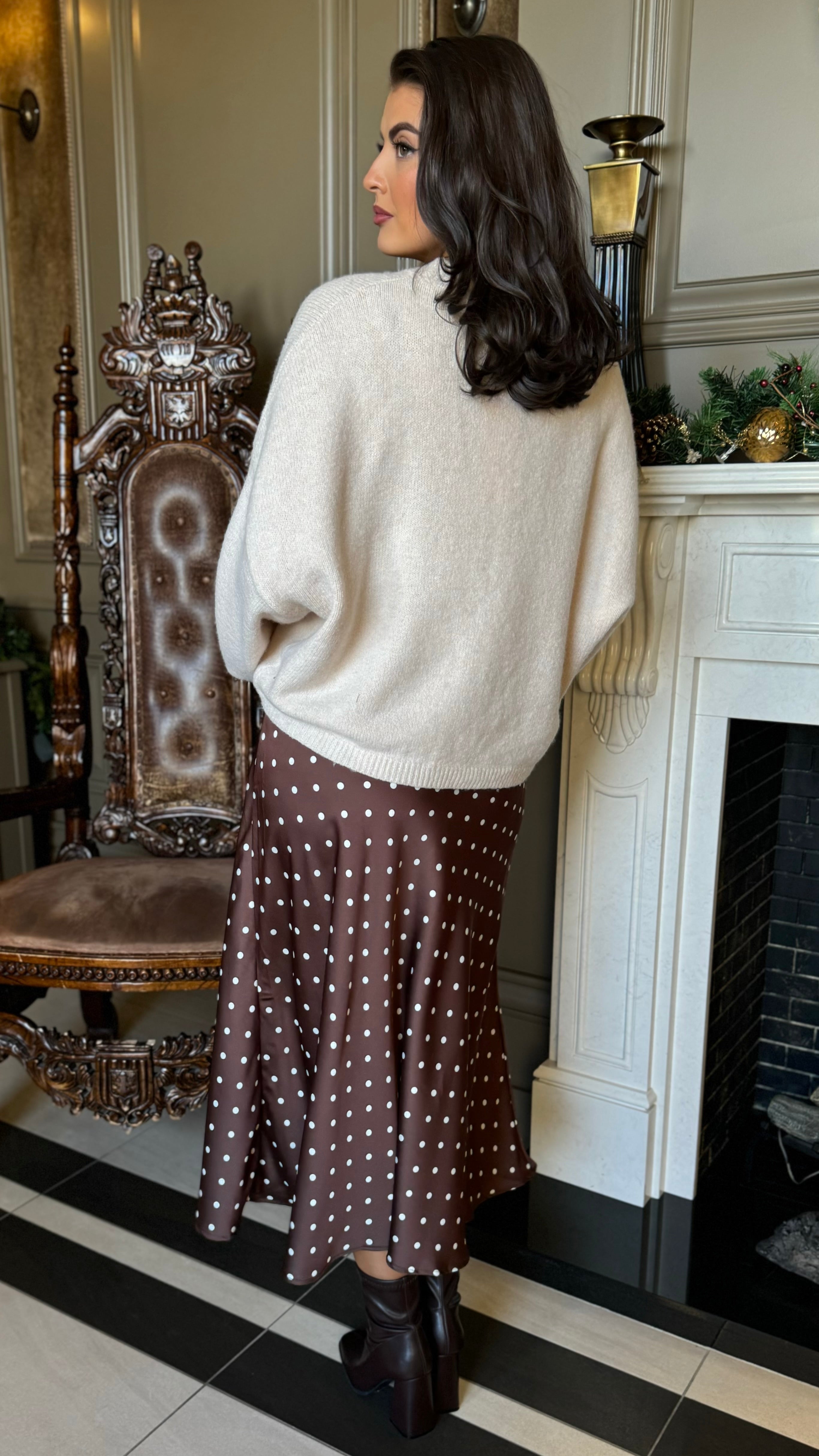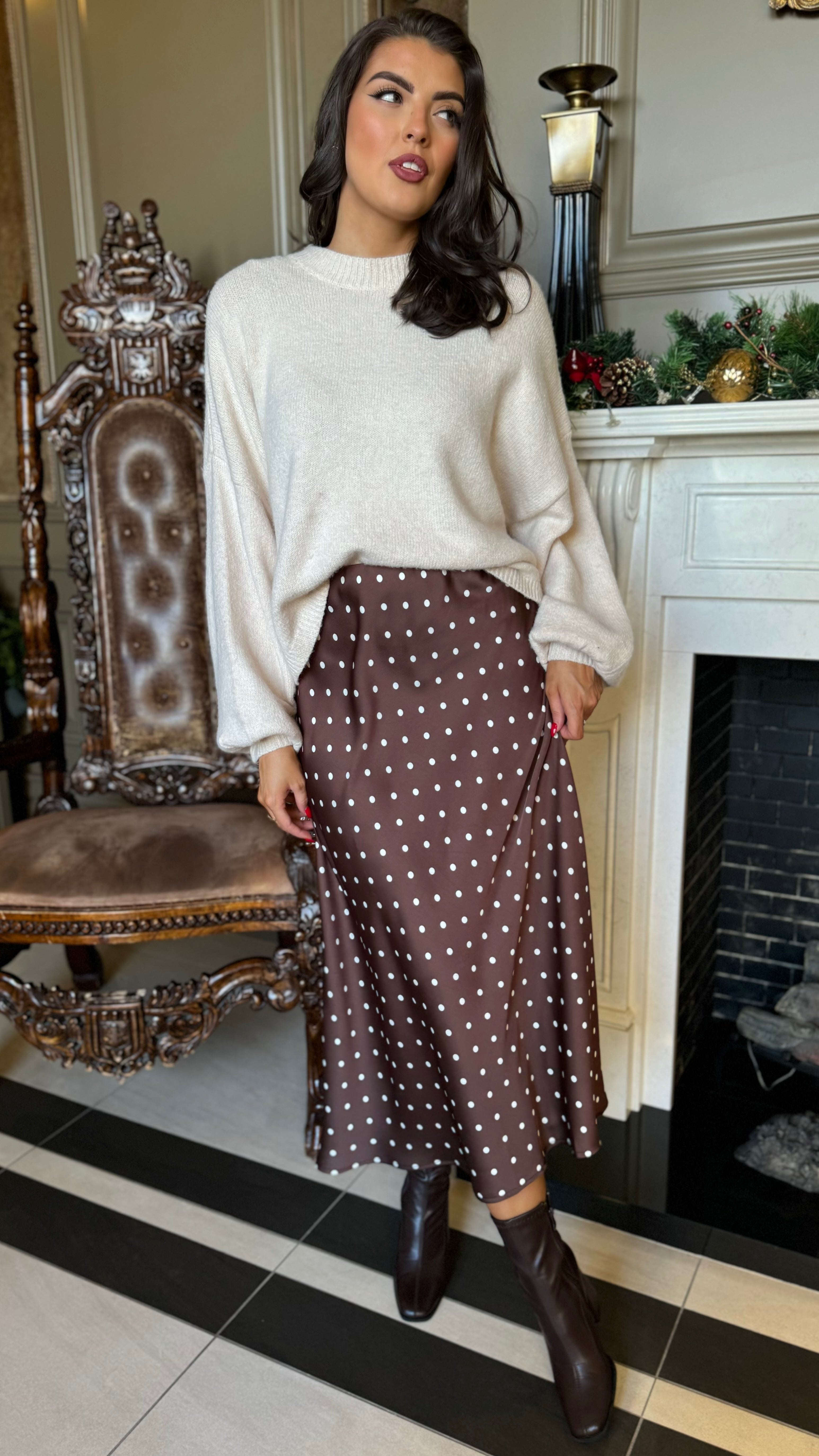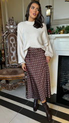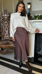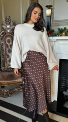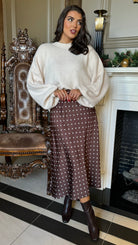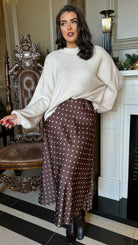 Slip into effortless style with the Charlene Brown Satin Polka Dot Slip Skirt. This on-trend piece features a flattering high-waisted silhouette that elongates your frame, paired with a luxe satin finish and charming polka dot pattern. Perfect for layering over basics or styling solo, this slip skirt delivers that coveted vintage-inspired look that's everywhere right now.