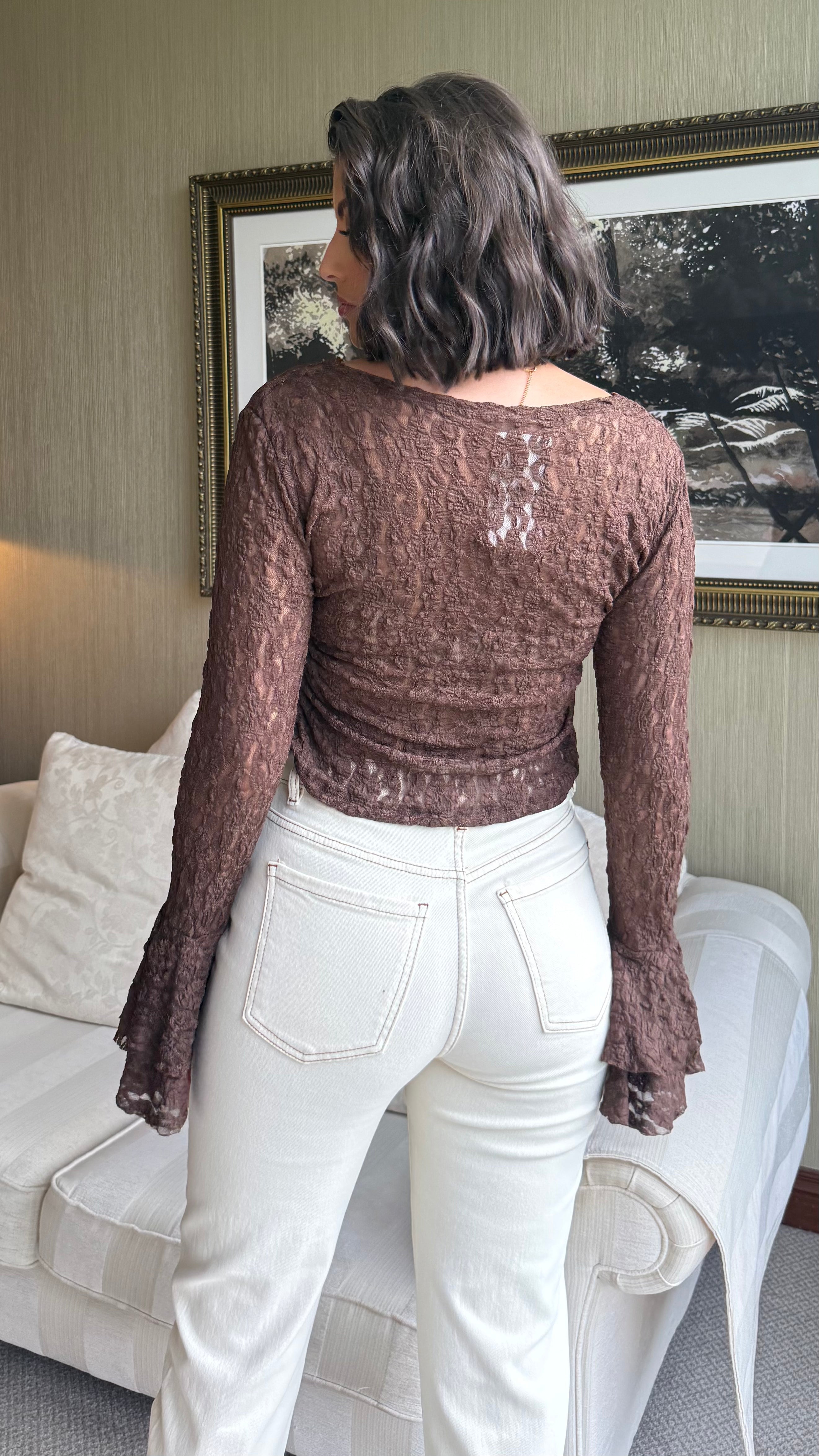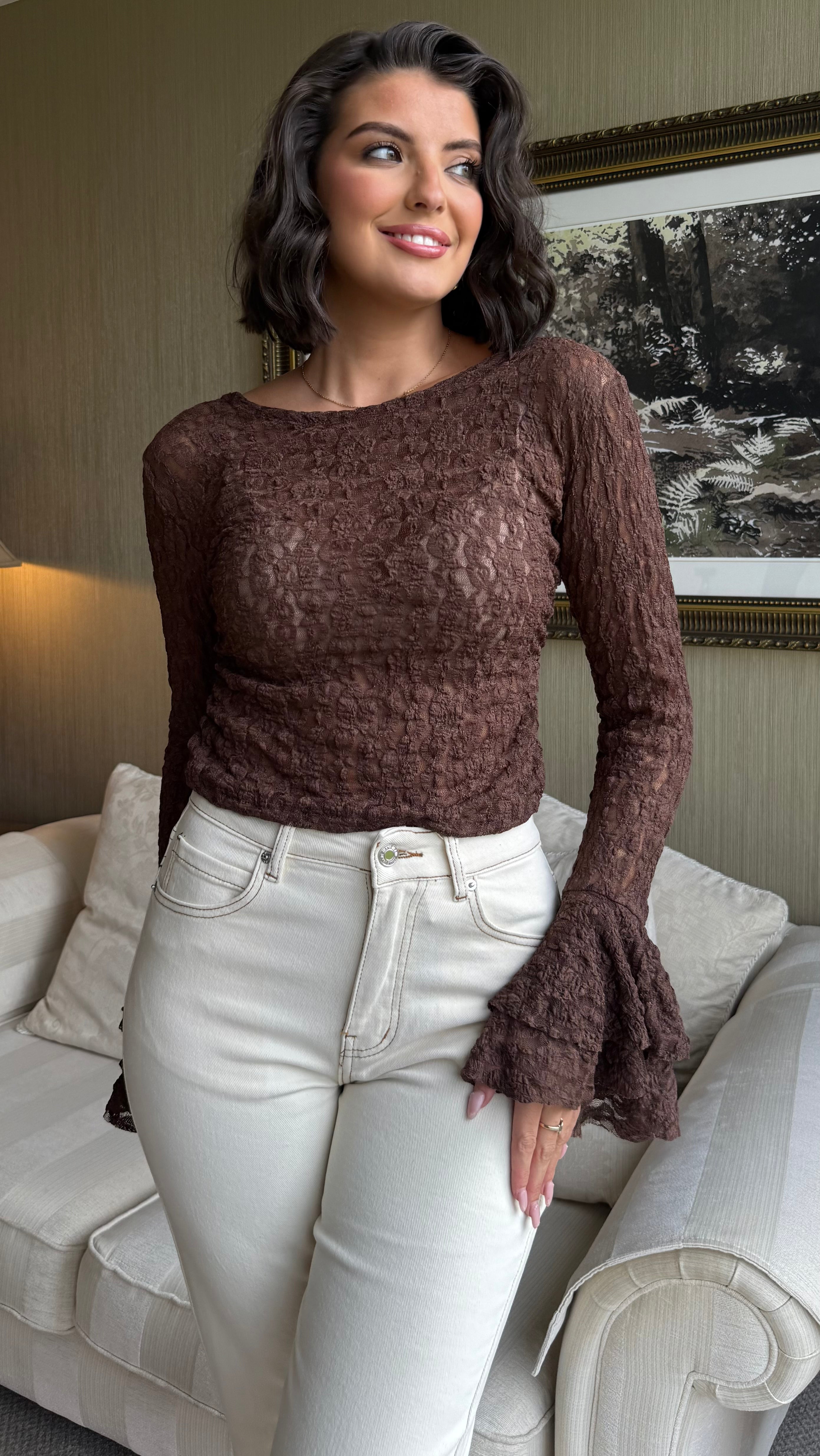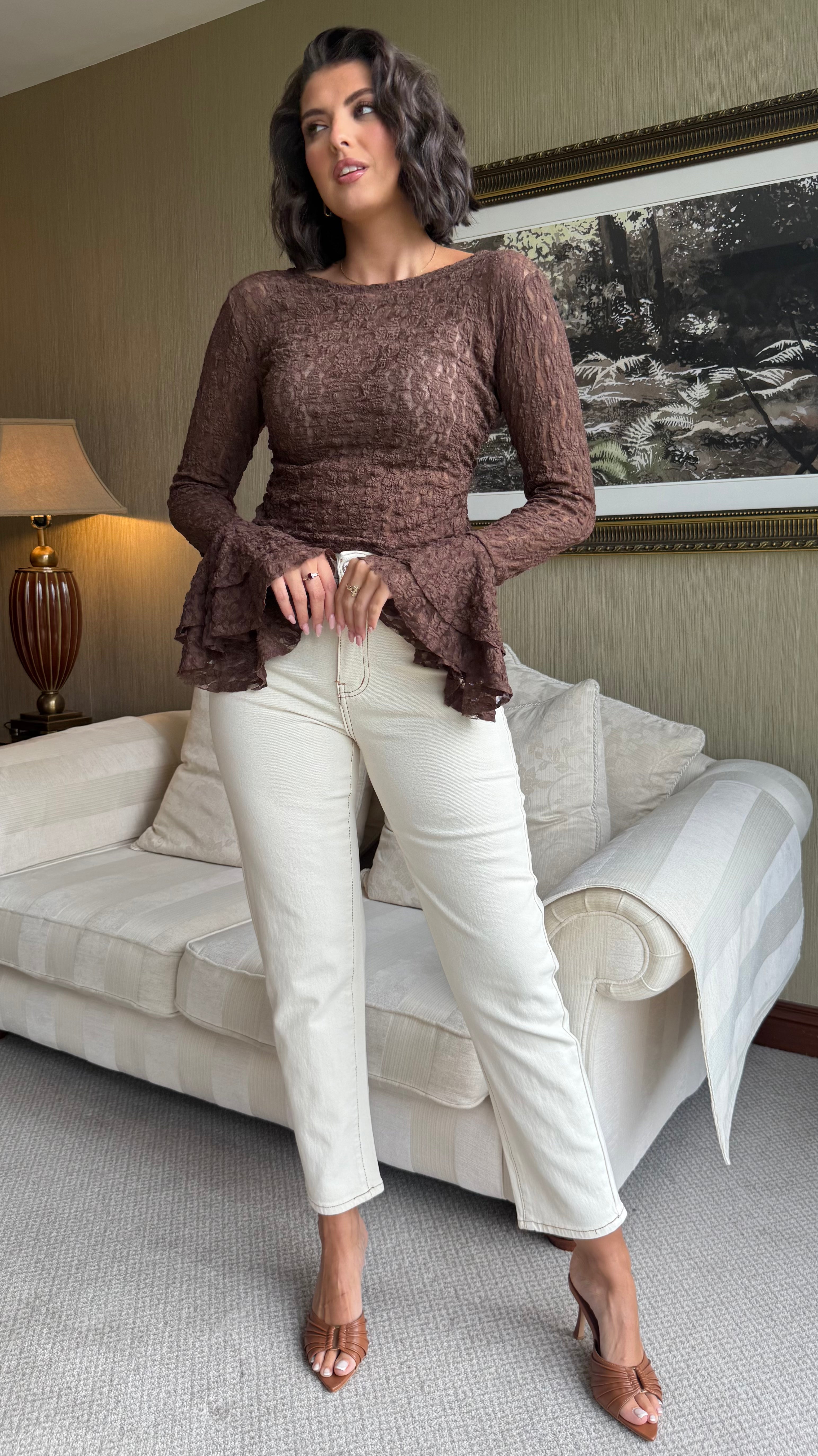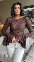 Georgina Brown Lace Frill Sleeve Top Elevate your everyday wardrobe with this beautifully crafted top, designed to flatter and inspire confidence. The round neckline offers a classic, versatile silhouette, while strategic ruching at the sides creates a refined, sculpted shape. Long sleeves with charming frill cuffs add a touch of feminine detail, and the lined construction ensures comfort and opacity all day long. Perfect for layering or wearing solo, this piece transitions effortlessly from office to weekend styling.