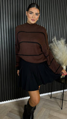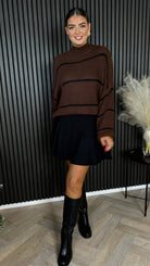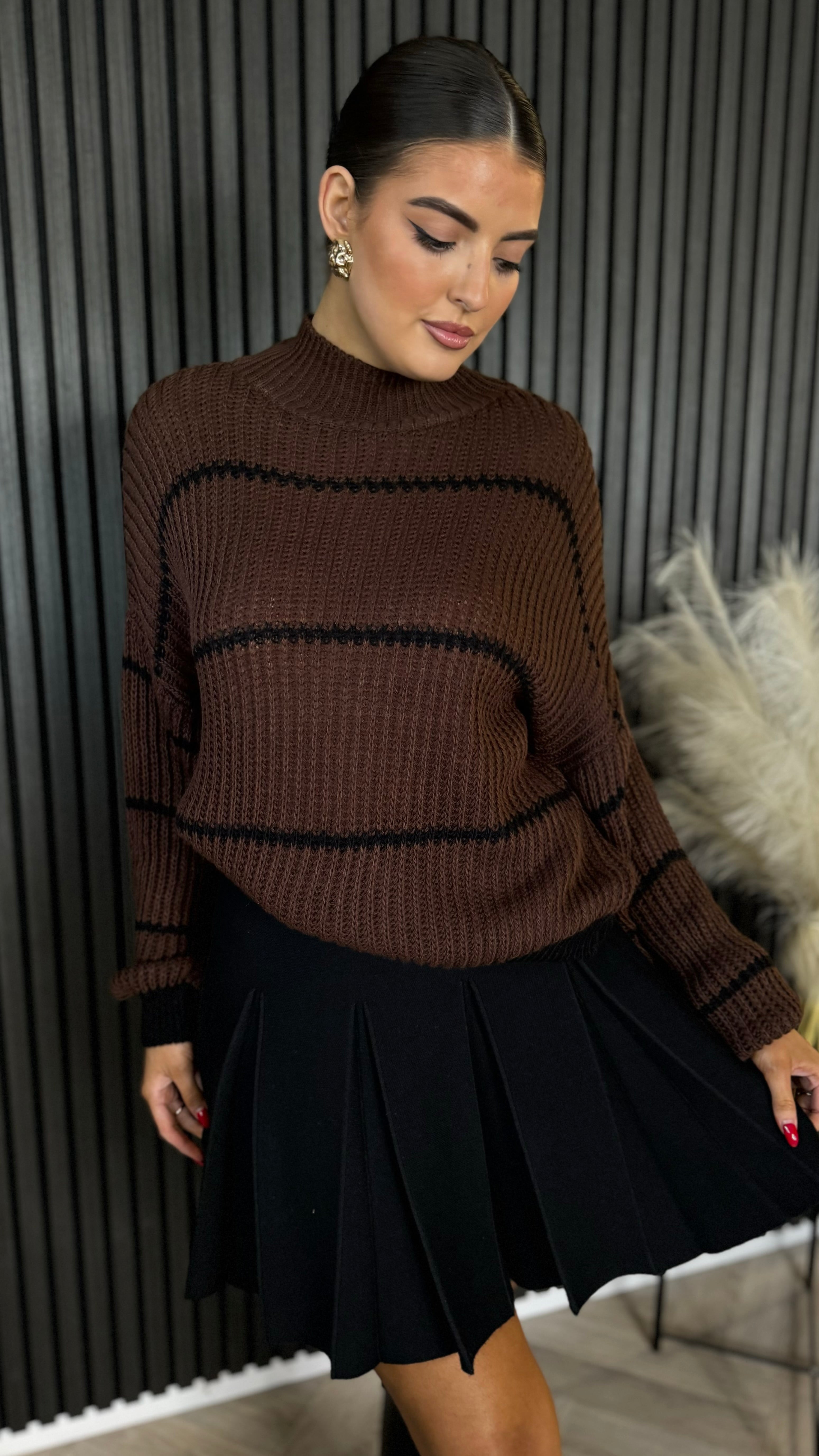 Wrap yourself in cosy comfort with the Grayson High Neck Jumper, featuring bold brown and black contrasting stripes that make a statement. The snug high neckline keeps you warm and stylish, while fitted cuffs ensure a polished finish. Crafted from soft, luxurious fabric, this jumper is your go-to piece for effortless autumn and winter vibes. Layer it, love it, live in it.