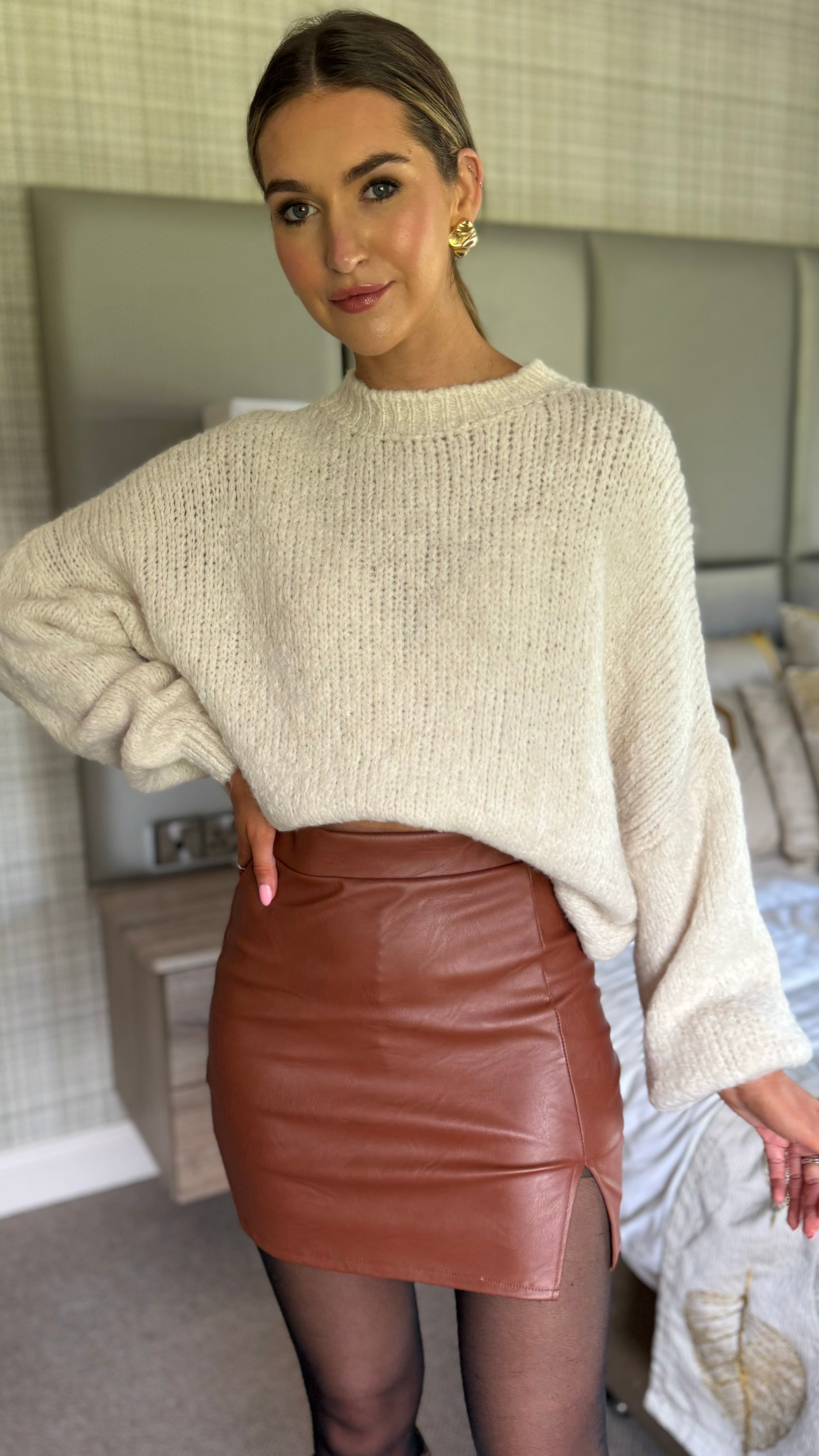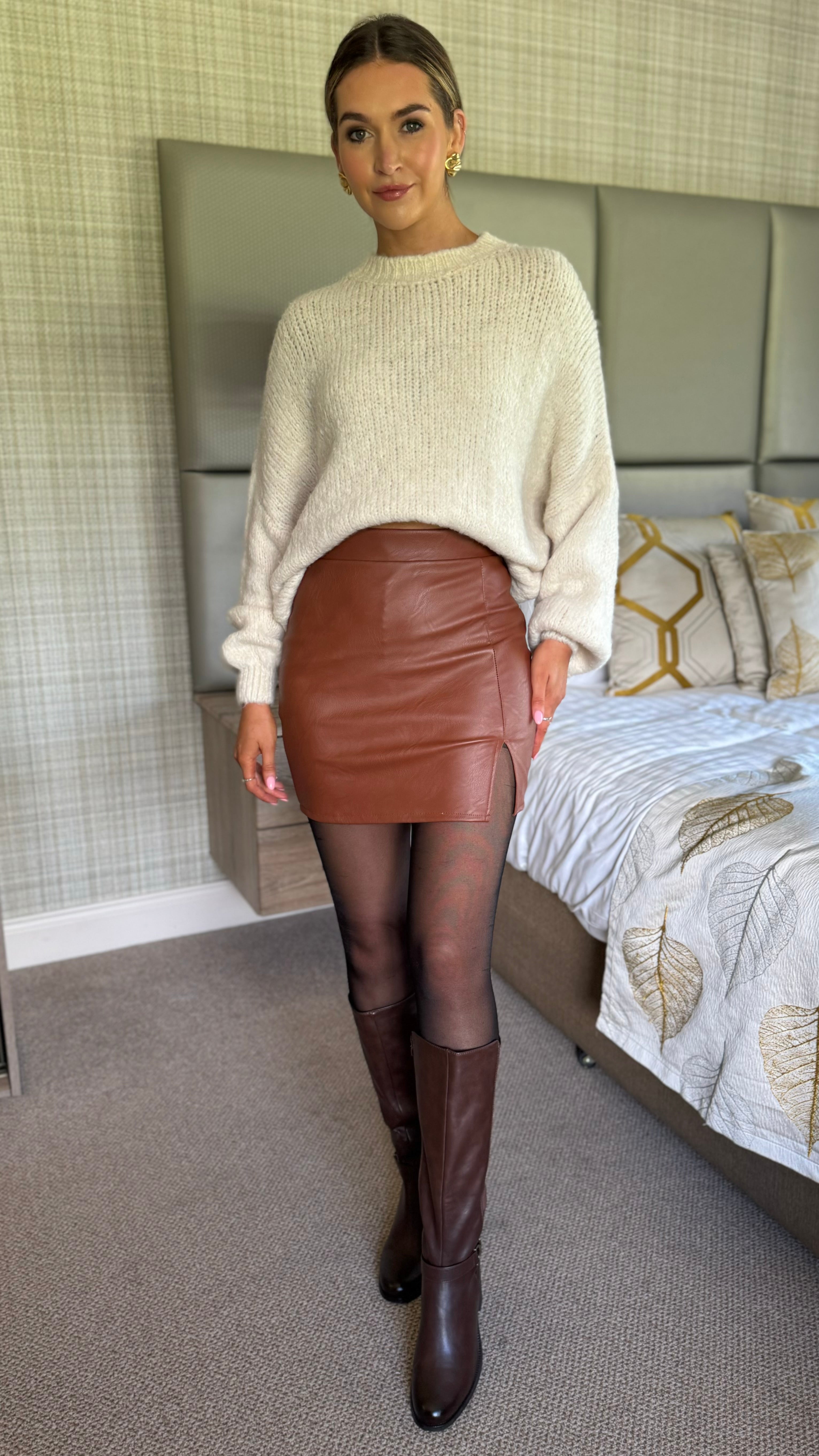 Strut your stuff in this sexy Marilyn Light Brown Leather Look Mini Skirt! Perfect for a night out on the town, this skirt comes with a sultry side split and a look that'll make everyone do a double take. Slip it on and let your inner style star shine! 🌟