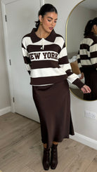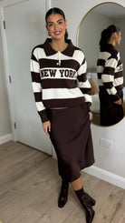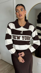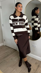 Cozy up in the Maverick Brown Stripe 'New York' Jumper, where bold brown and cream stripes meet a fun oversized fit. Featuring a charming collar detail and stylish button accents, this jumper adds a playful twist to your casual wardrobe while keeping you comfy all day. Perfect for layering or solo style adventures!