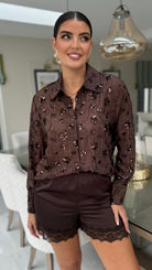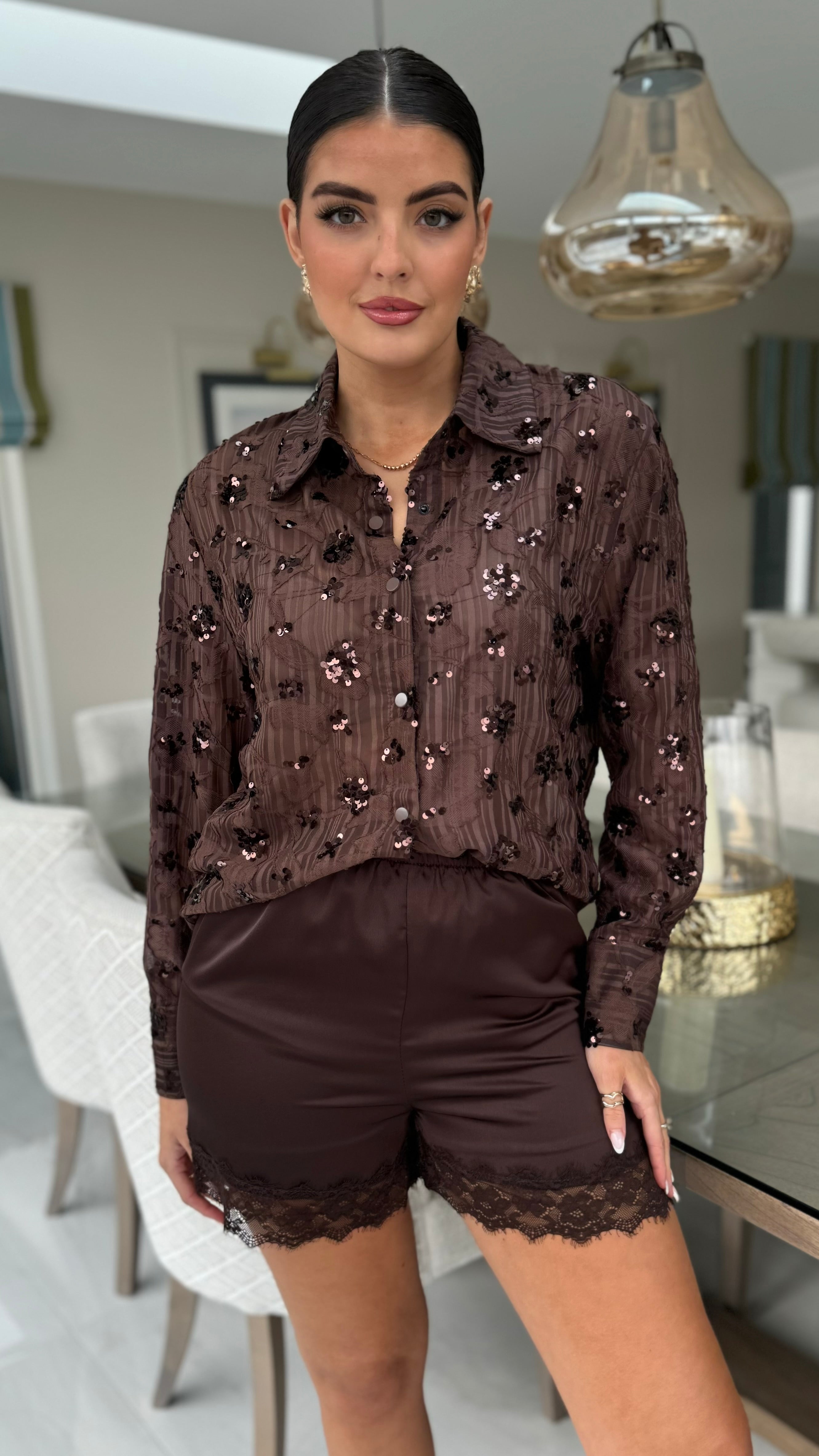 Elevate your everyday style with this Sedona Brown Textured Sequin Detail Shirt—where sophistication meets fun! Featuring a crisp collar detail and a full button-down front for effortless styling, this piece brings texture and shimmer to your wardrobe. The button cuffs add a polished touch, while the luxurious textured chiffon material drapes beautifully and catches the light just right. Perfect for dressing up a casual look or adding sparkle to your office ensemble.
