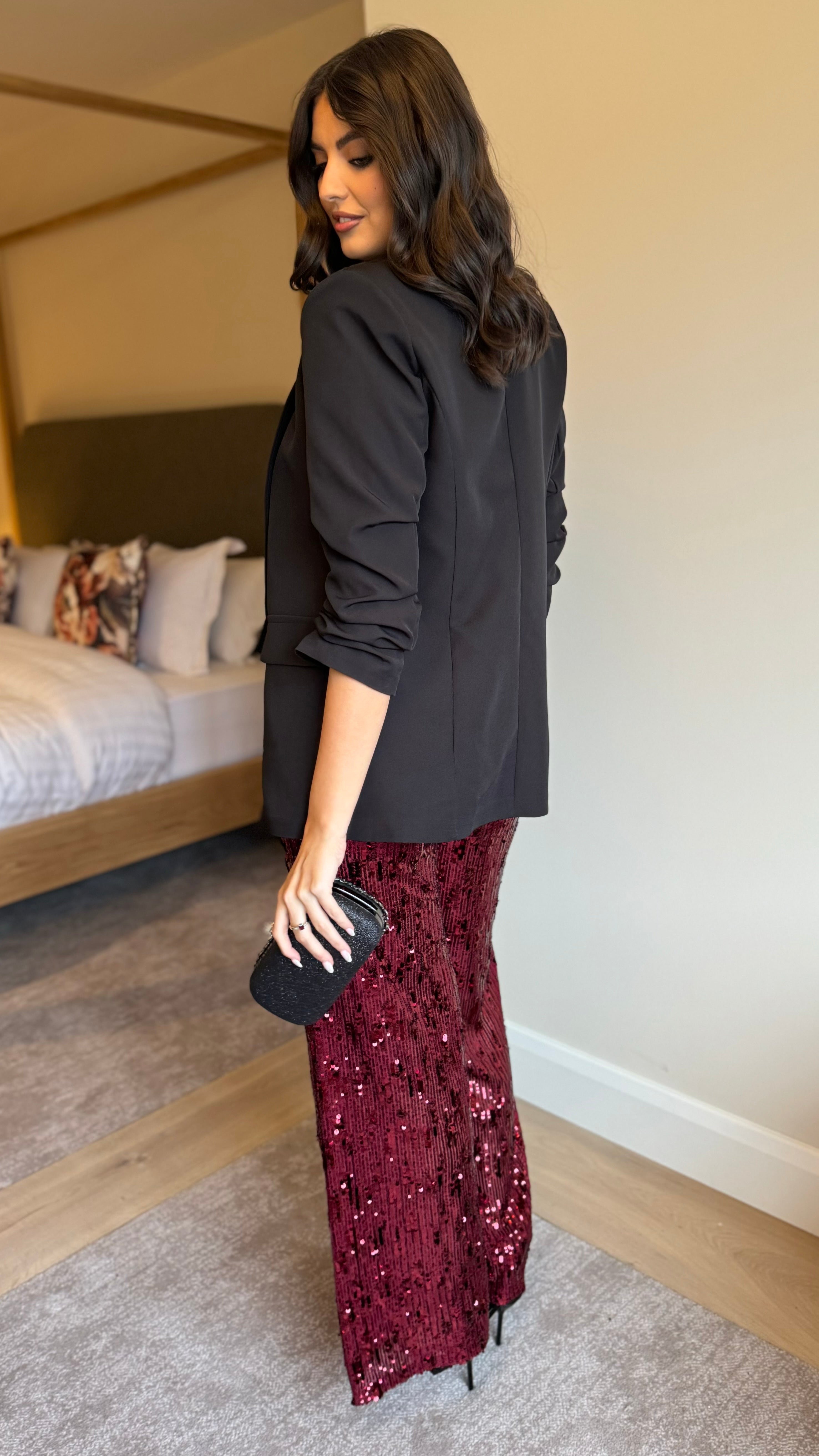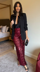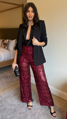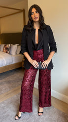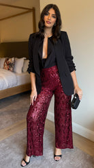 Shimmer and shine in these show-stopping wine sequin straight leg trousers! Covered head-to-toe in dazzling sequins, these trousers deliver serious sparkle for nights out or festival season. The classic straight leg cut keeps things chic and wearable, while the playful sequin detailing ensures all eyes are on you. Perfect for anyone ready to turn heads and embrace their inner disco ball.