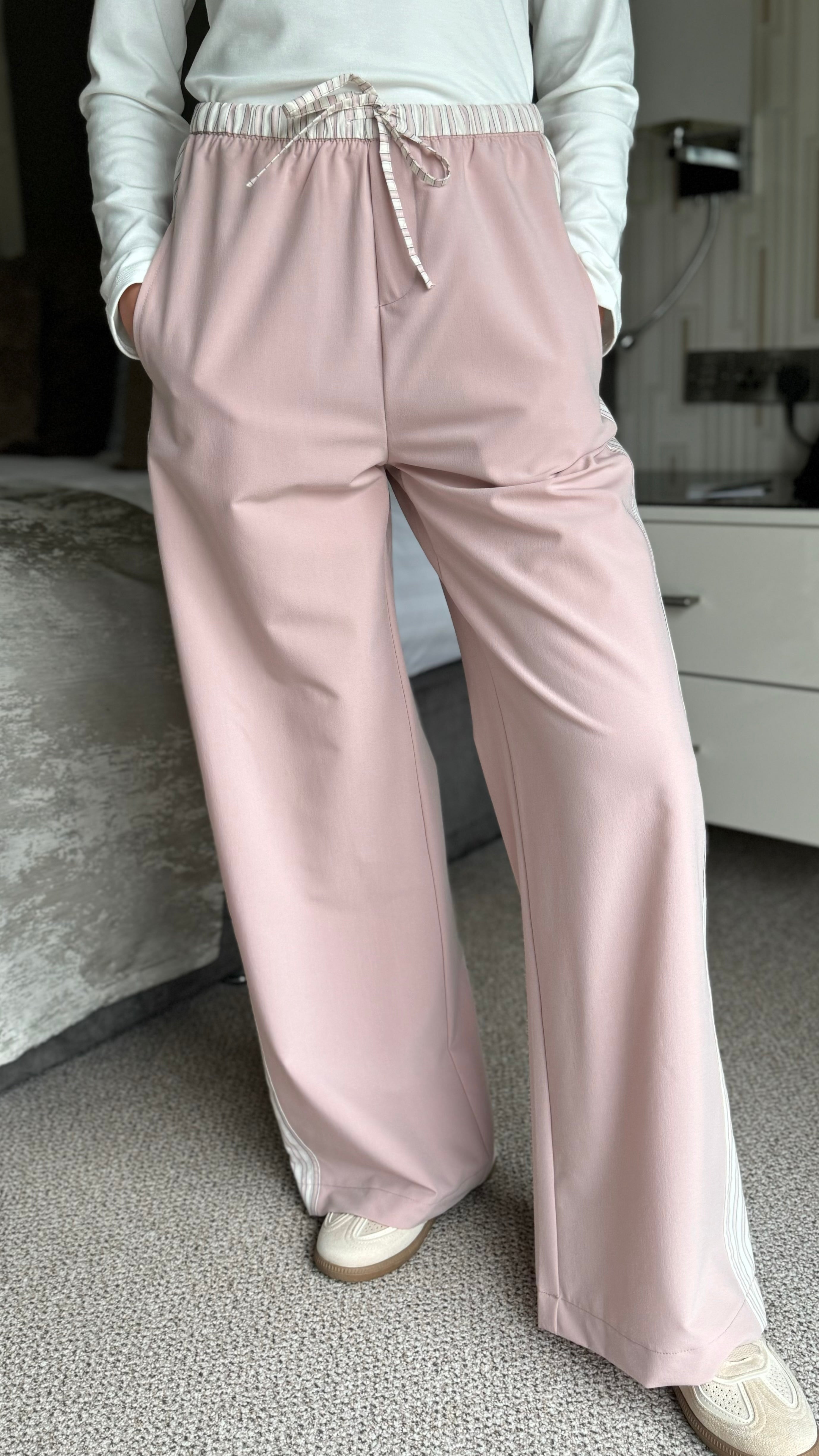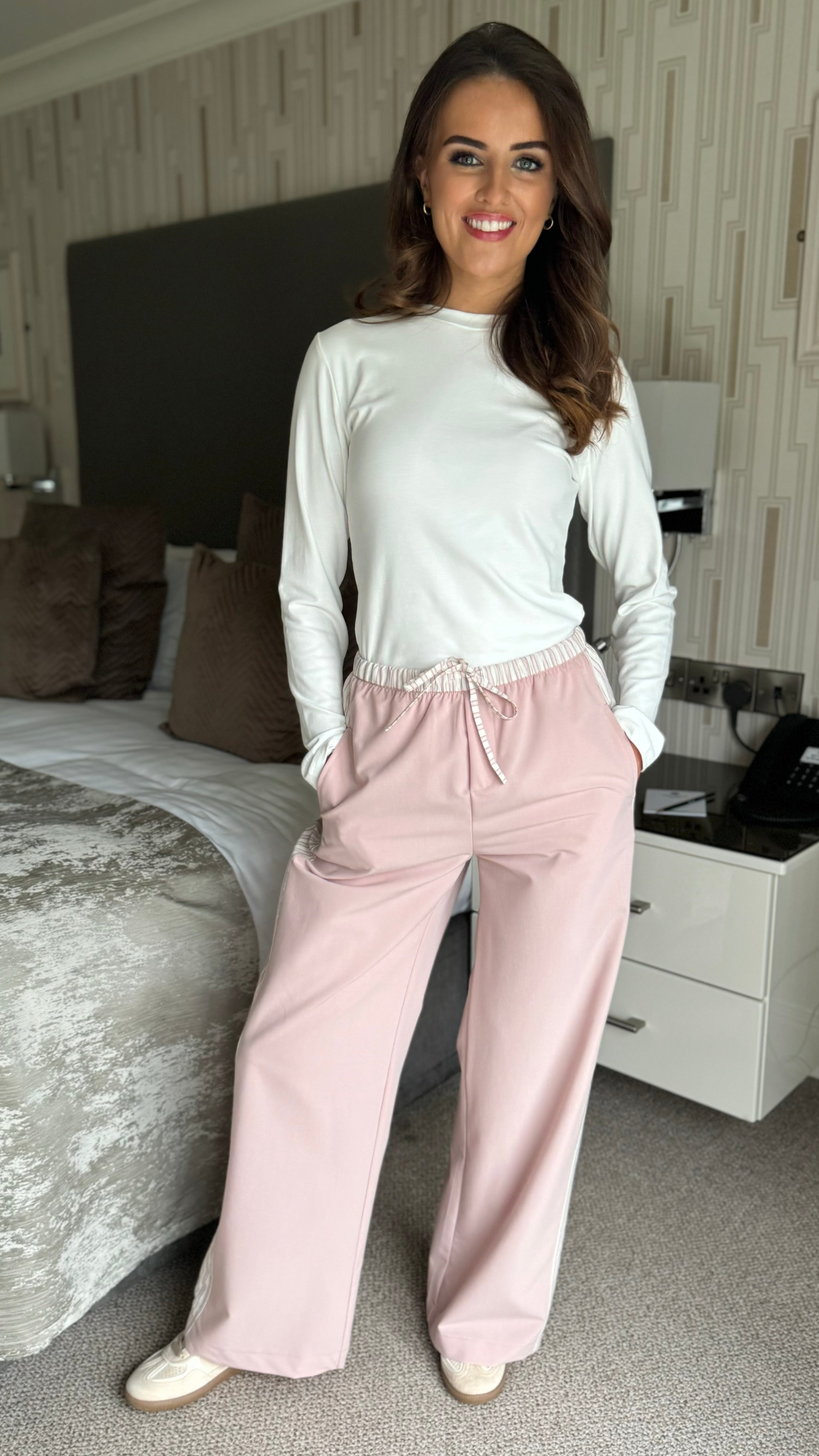 Effortless comfort meets contemporary style with these Louise Pink Stripe Leg Trousers. The elasticated waistband ensures a relaxed fit that moves with you, while bold side stripes and a matching drawstring add a fun, fashion-forward edge. Cut with a generous wide-leg silhouette, they're perfect for creating laid-back yet polished looks that feel as good as they look.