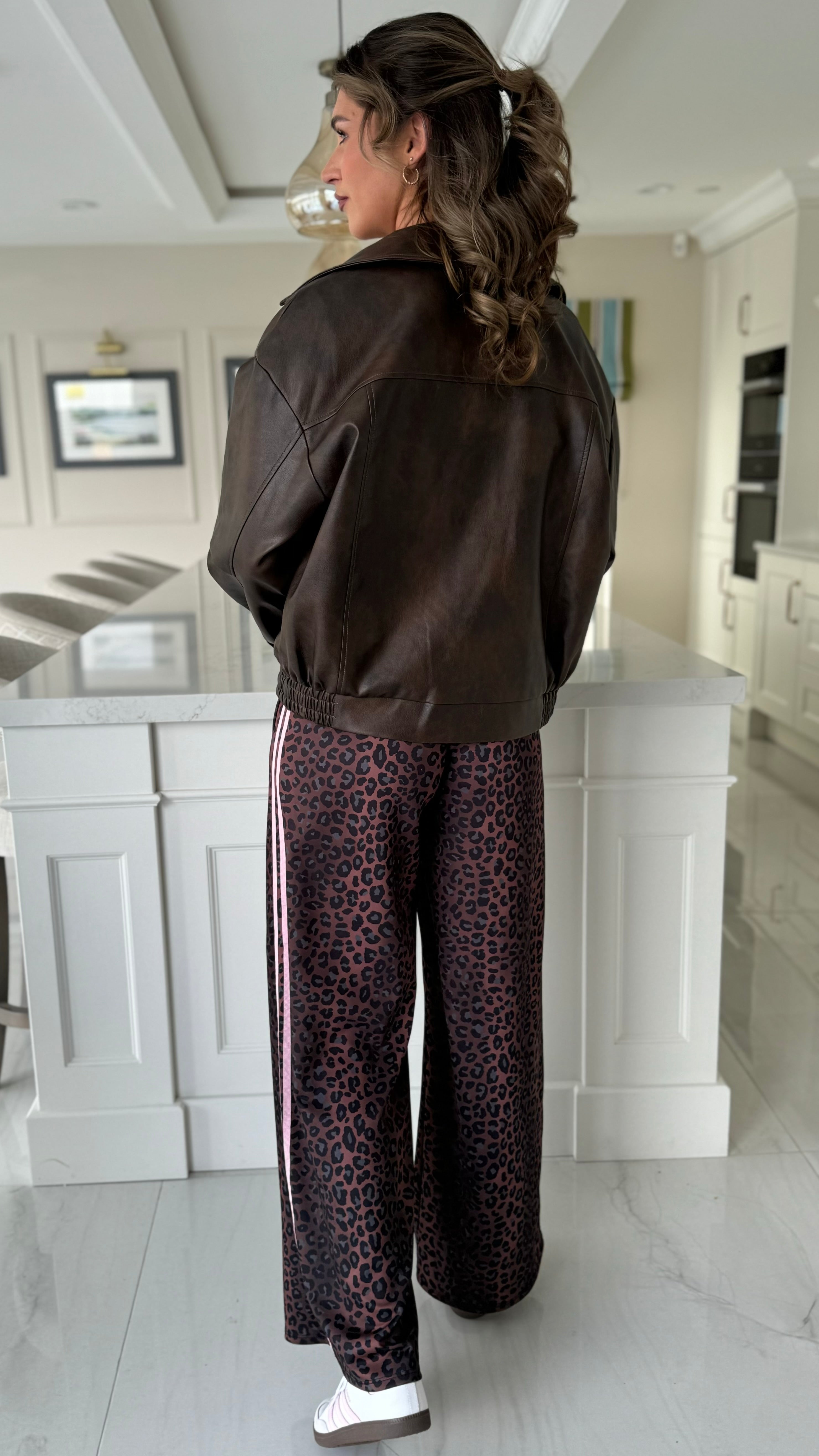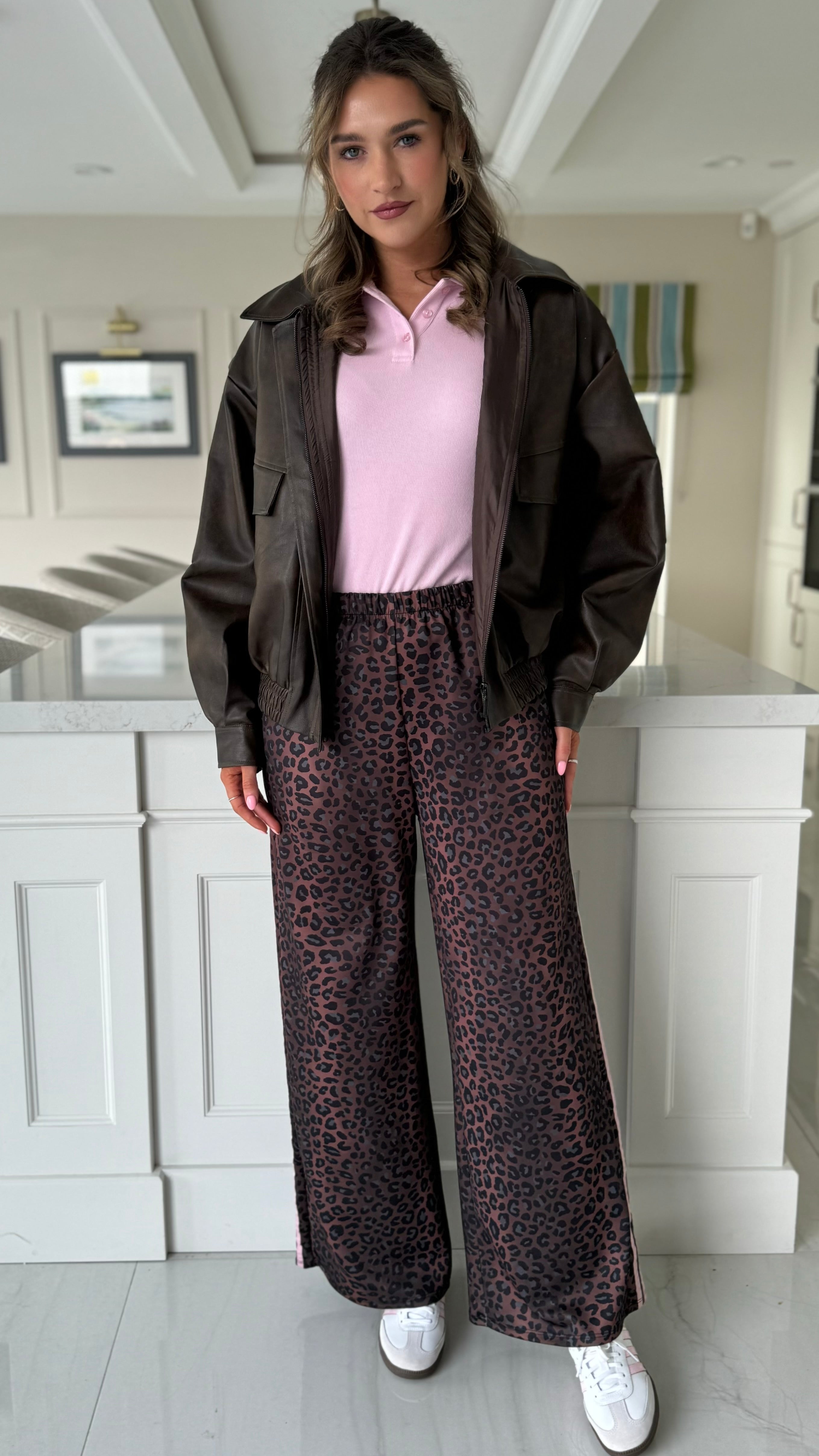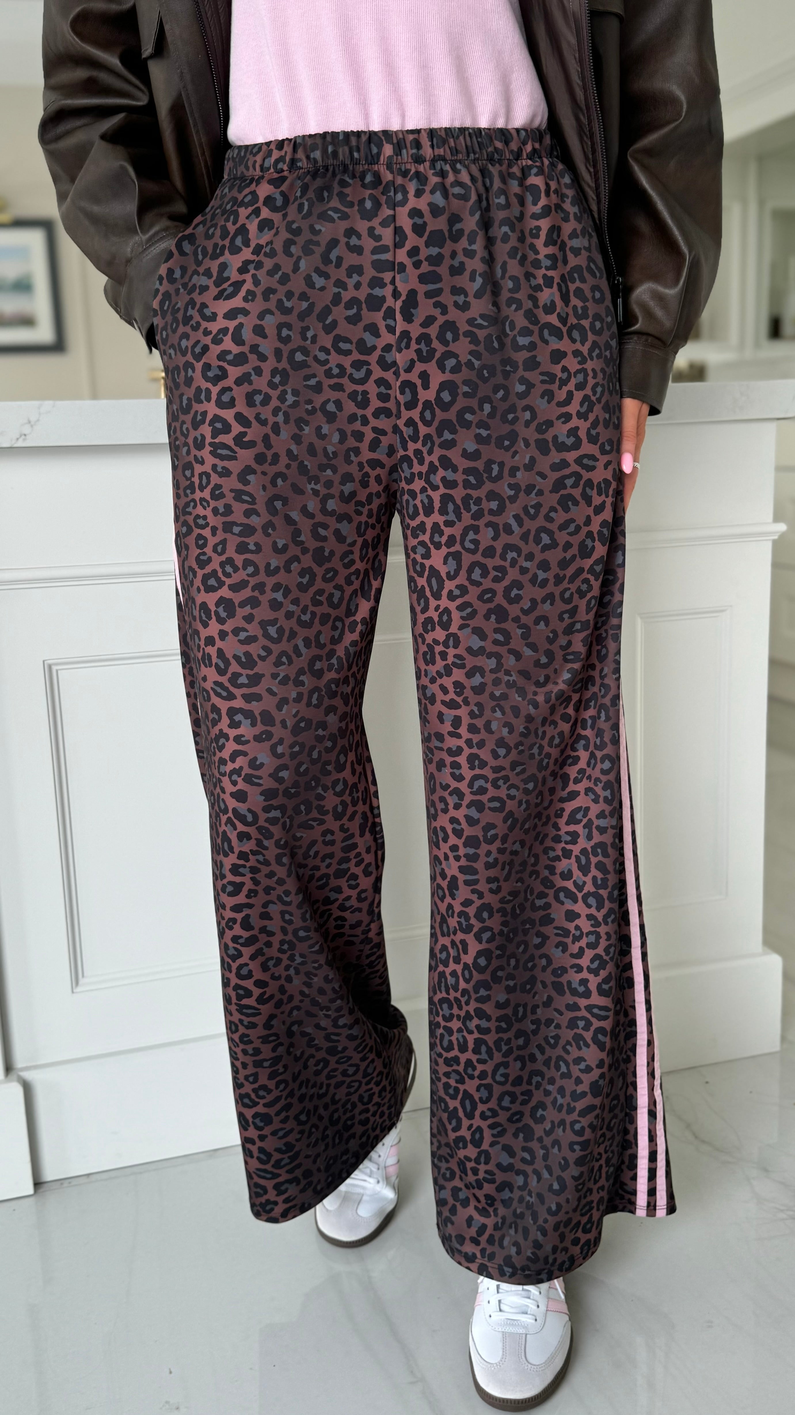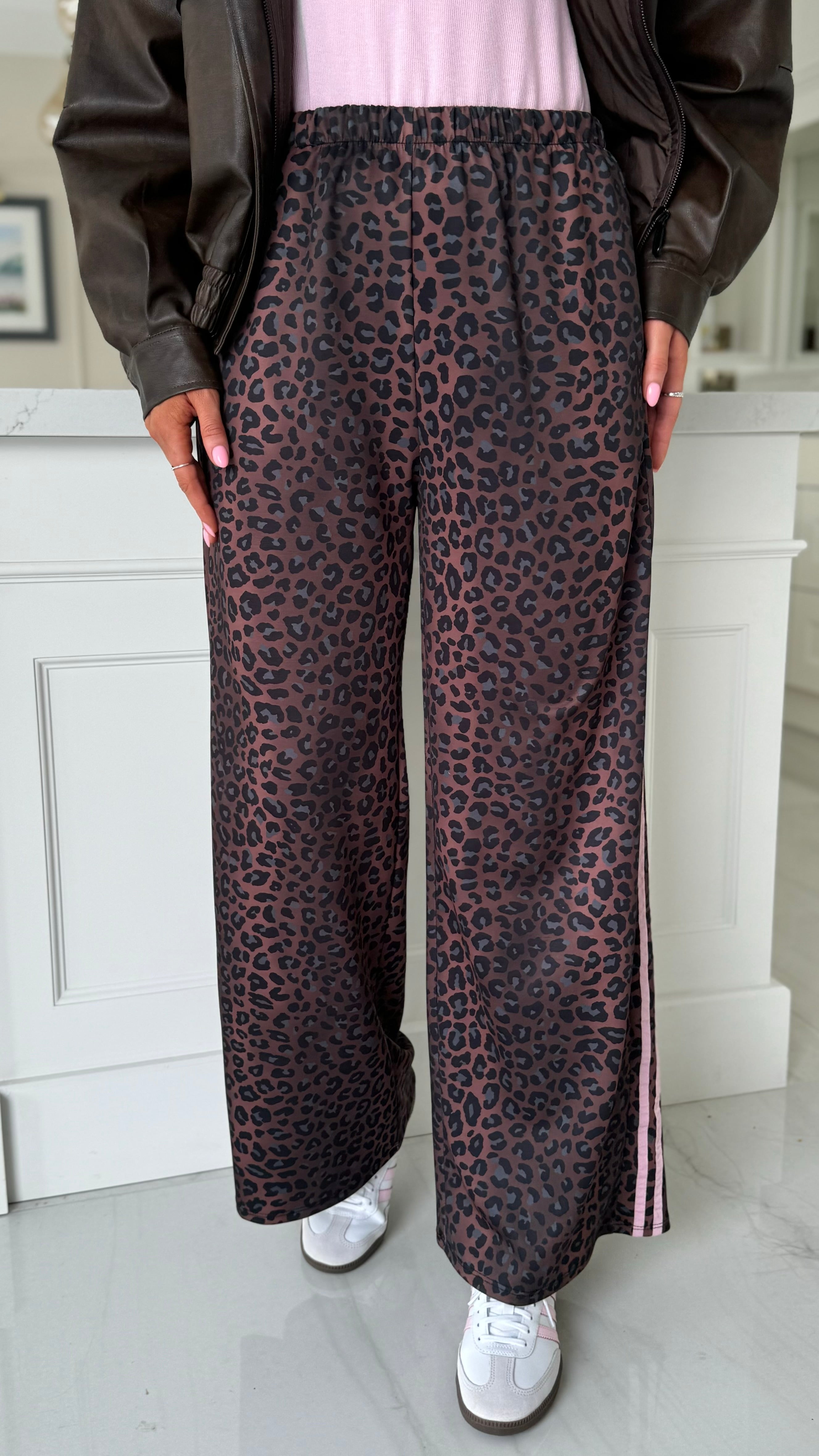 Elevate your everyday wardrobe with these striking leopard print trousers, designed for both comfort and style. The wide-leg silhouette offers a flattering, contemporary fit, while the practical drawstring waistband ensures an adjustable, secure wear. Functional pockets keep your essentials close, and the eye-catching pink stripe detail along the side adds a modern edge to this versatile piece. Perfect for creating effortless, on-trend looks that transition seamlessly from day to night.
