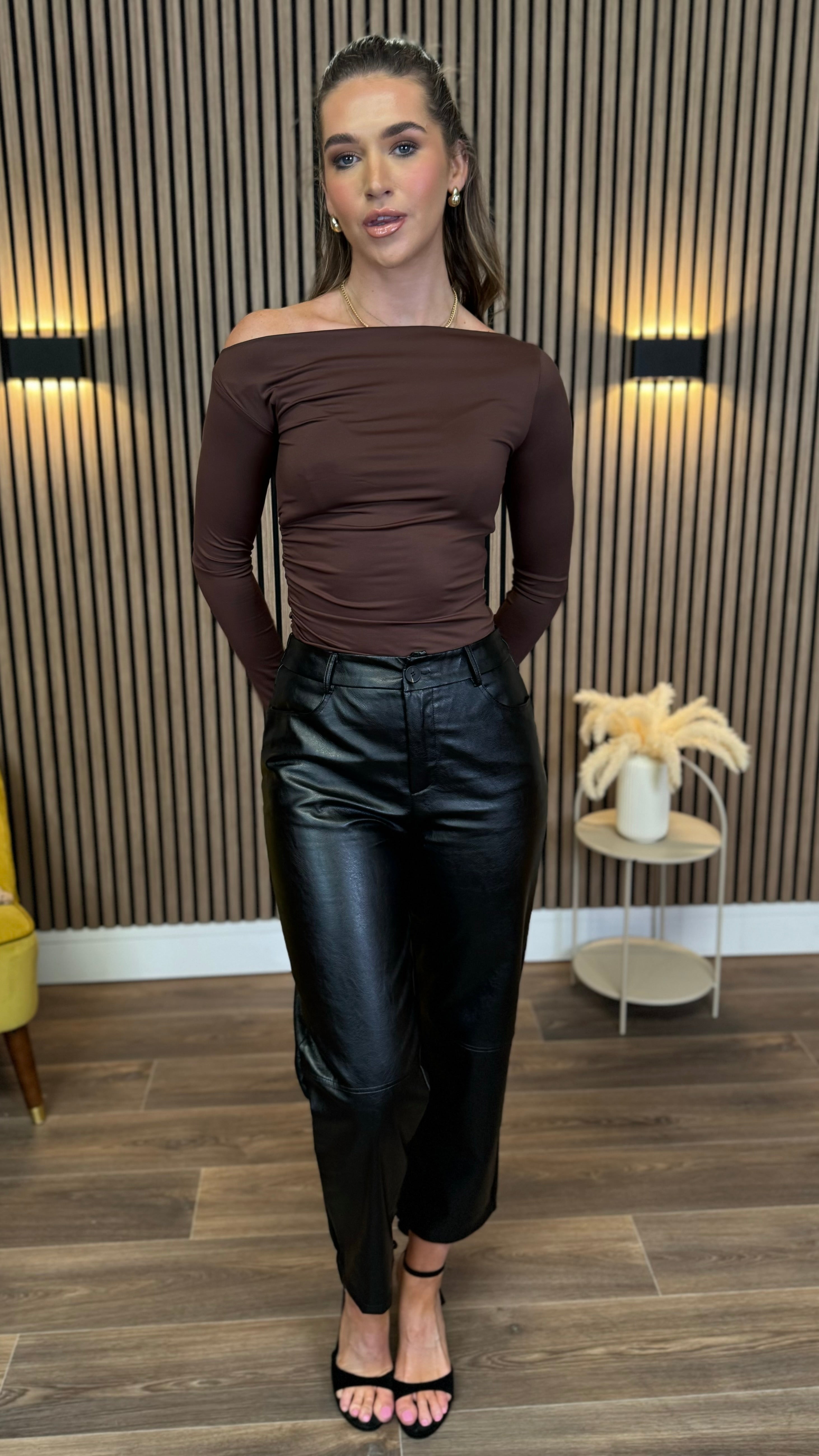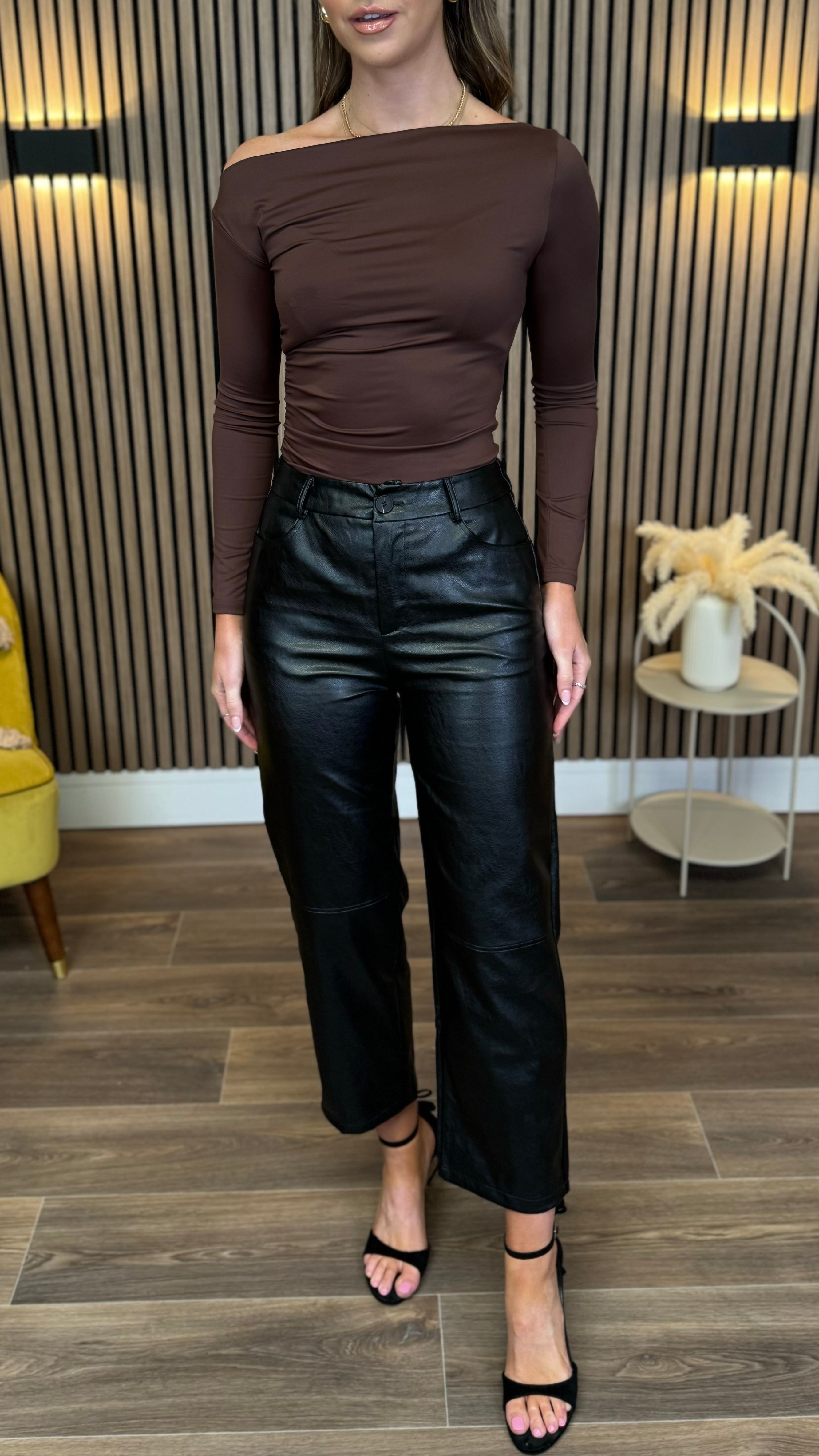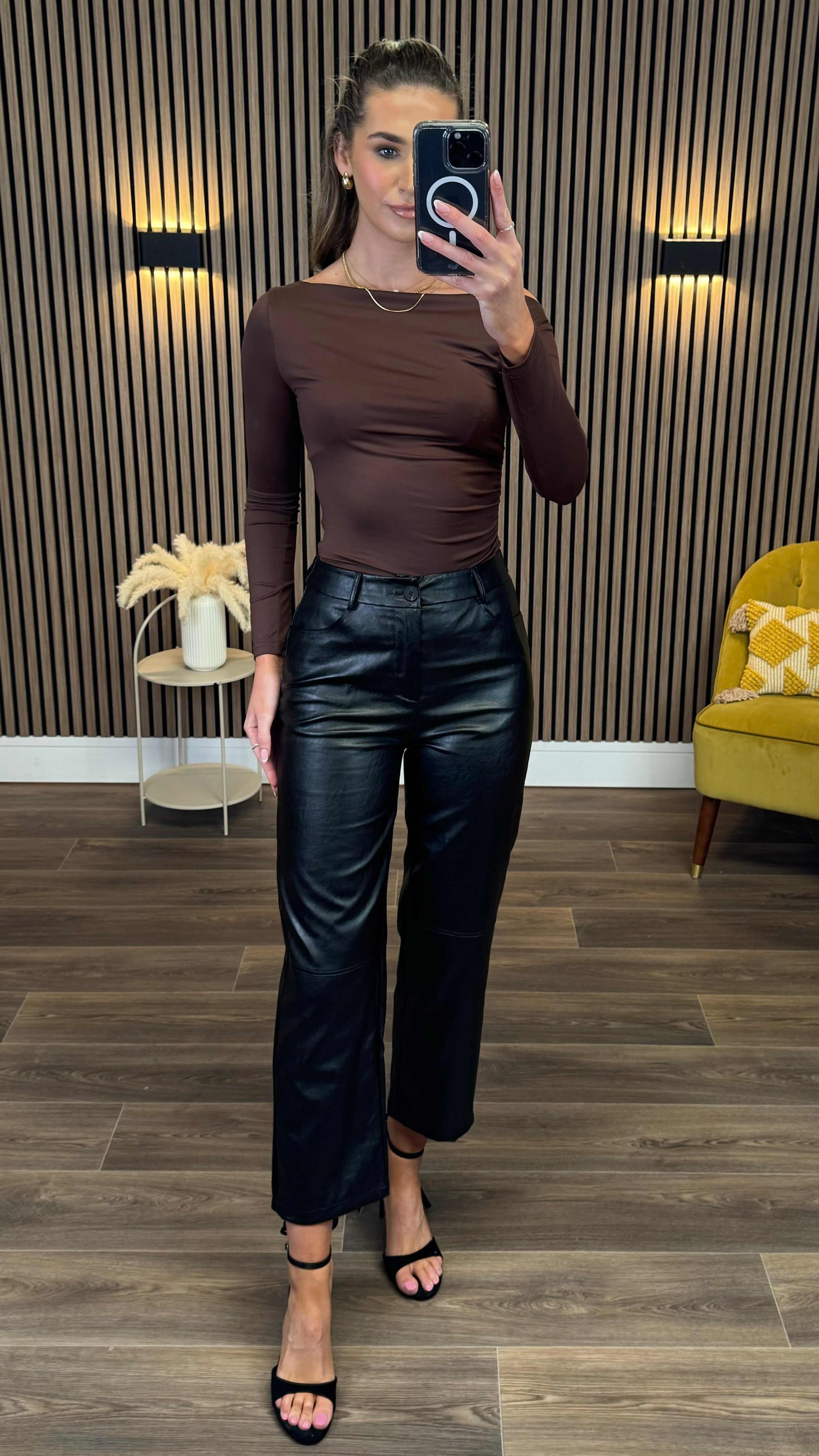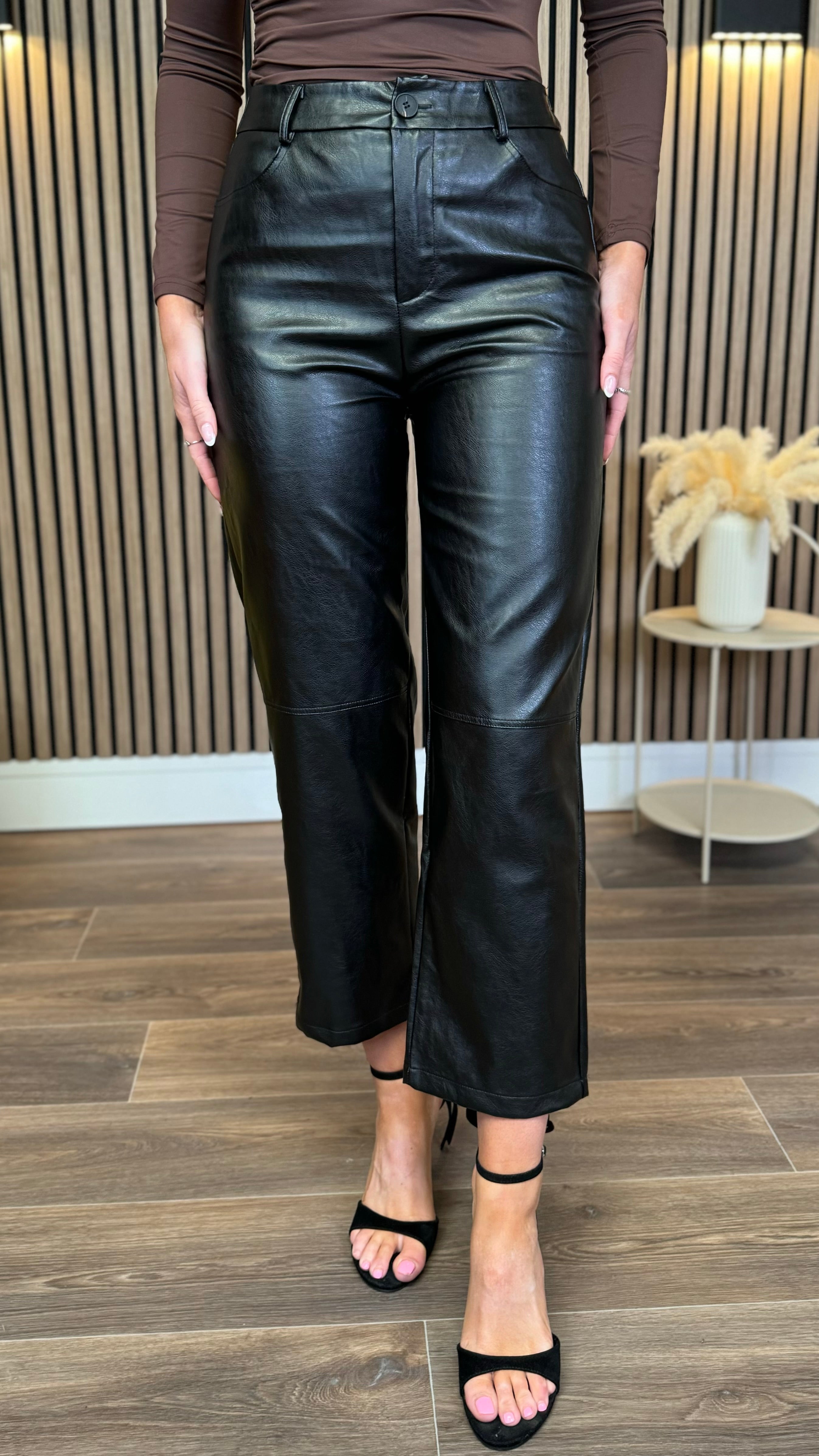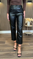 Step into style and comfort with the Oaklee Black Faux Leather Trousers. Designed with a high-waisted fit and elasticated waistband, these trousers hug your waist just right while offering flexible wear. Belt loops add flair and function, perfect for accessorizing. Featuring a button and fly fastening alongside handy pockets, they combine practicality with chic vibes. The ankle-length cut shows off your favorite shoes, making these trousers a fun and versatile addition to any wardrobe.