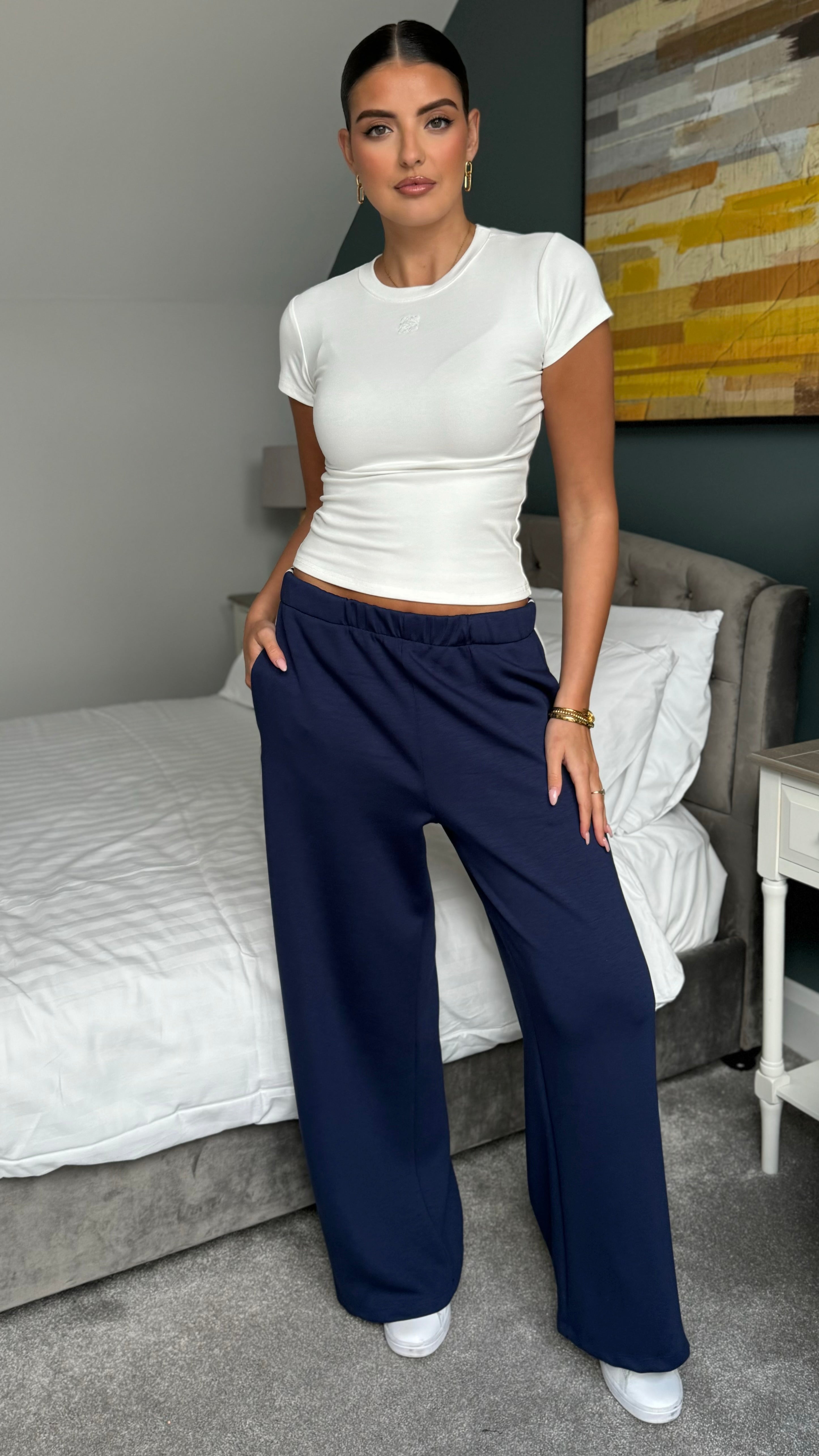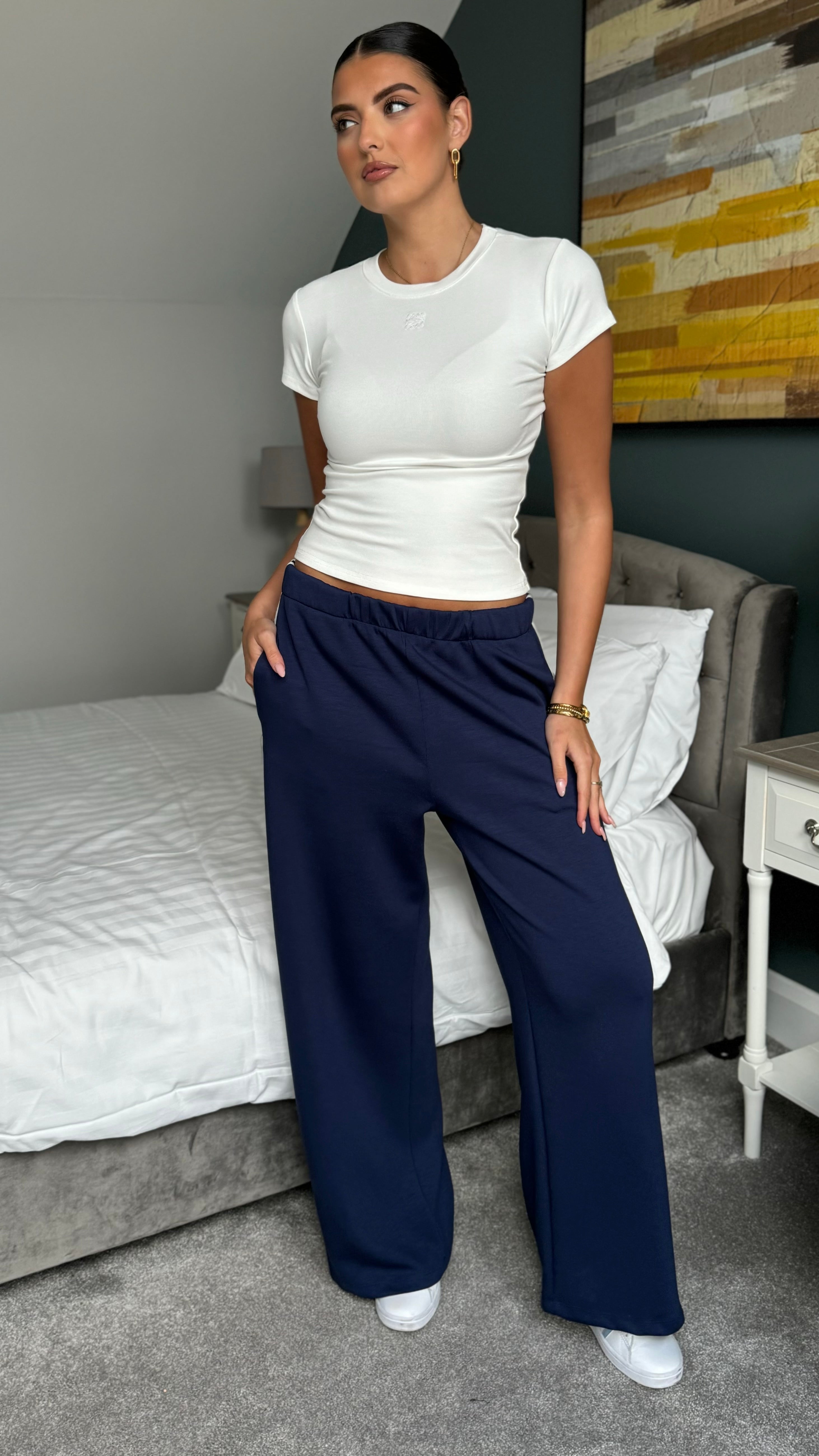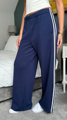Tilly Navy Stripe Detail Joggers feature a comfortable drawstring waist and elasticated waistband for an adjustable, secure fit. The wide-leg silhouette offers relaxed movement and a contemporary cut, perfect for effortless everyday wear. Crafted with attention to detail, these joggers combine practicality with modern style for versatile layering and casual comfort.