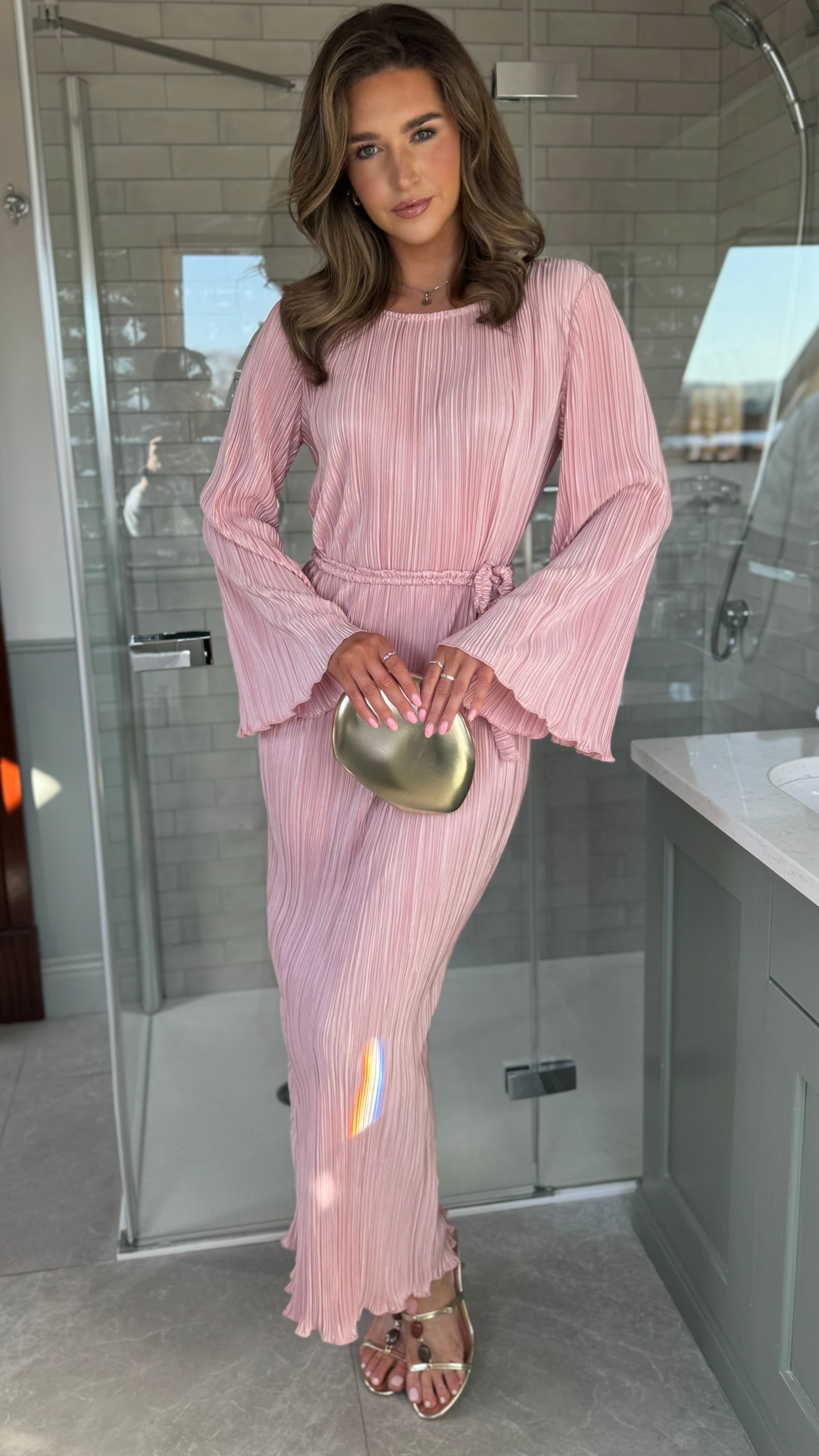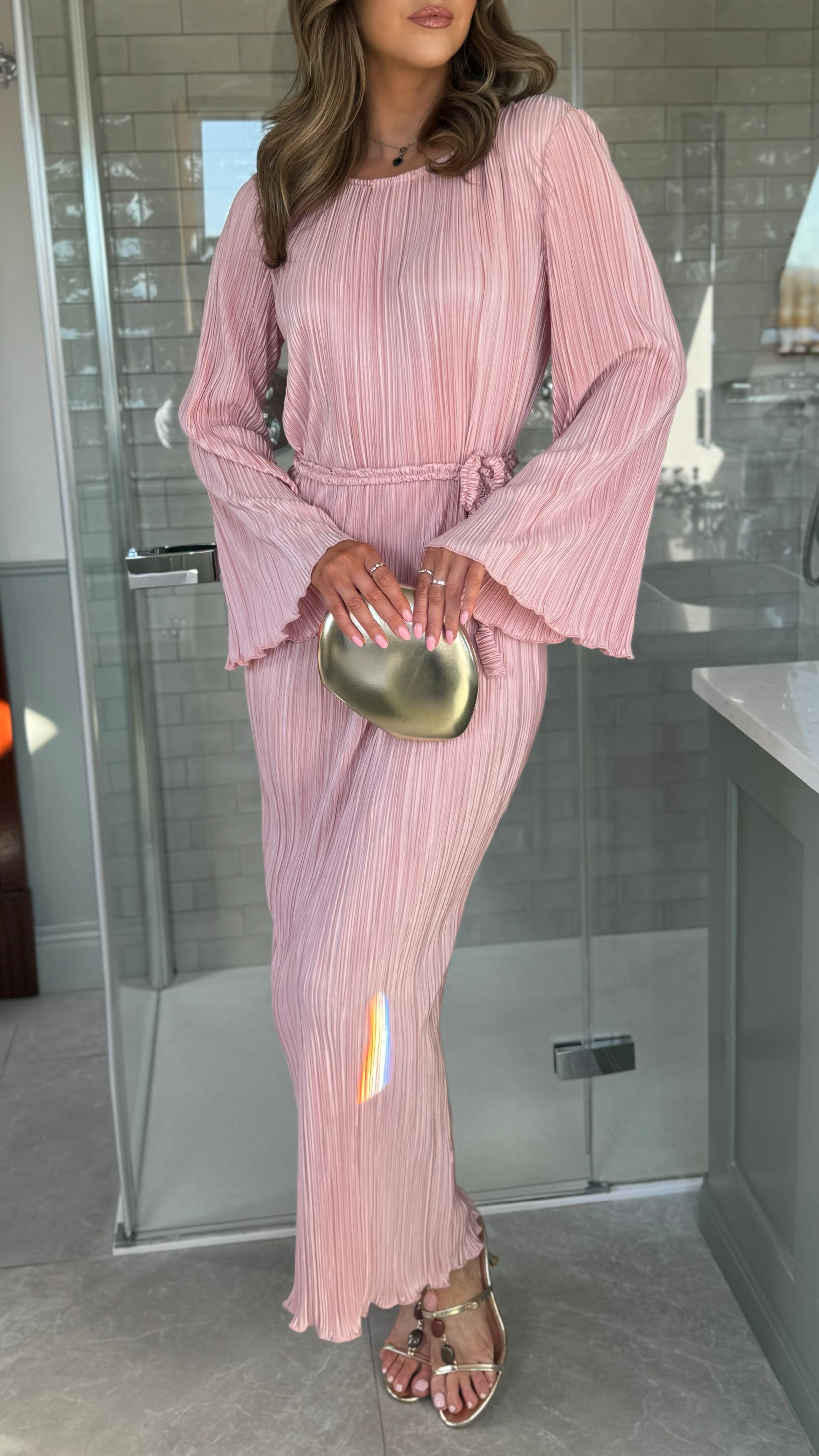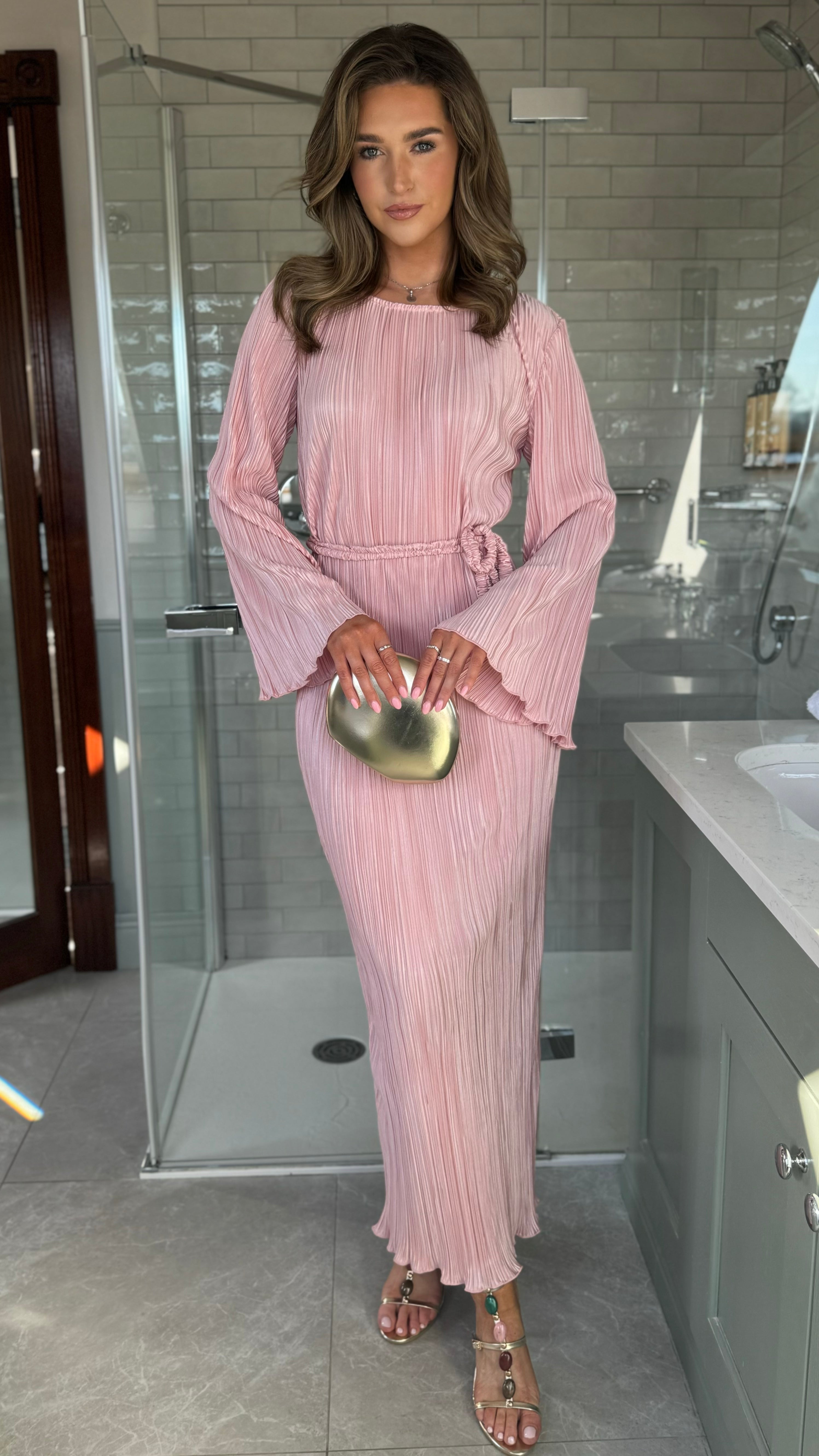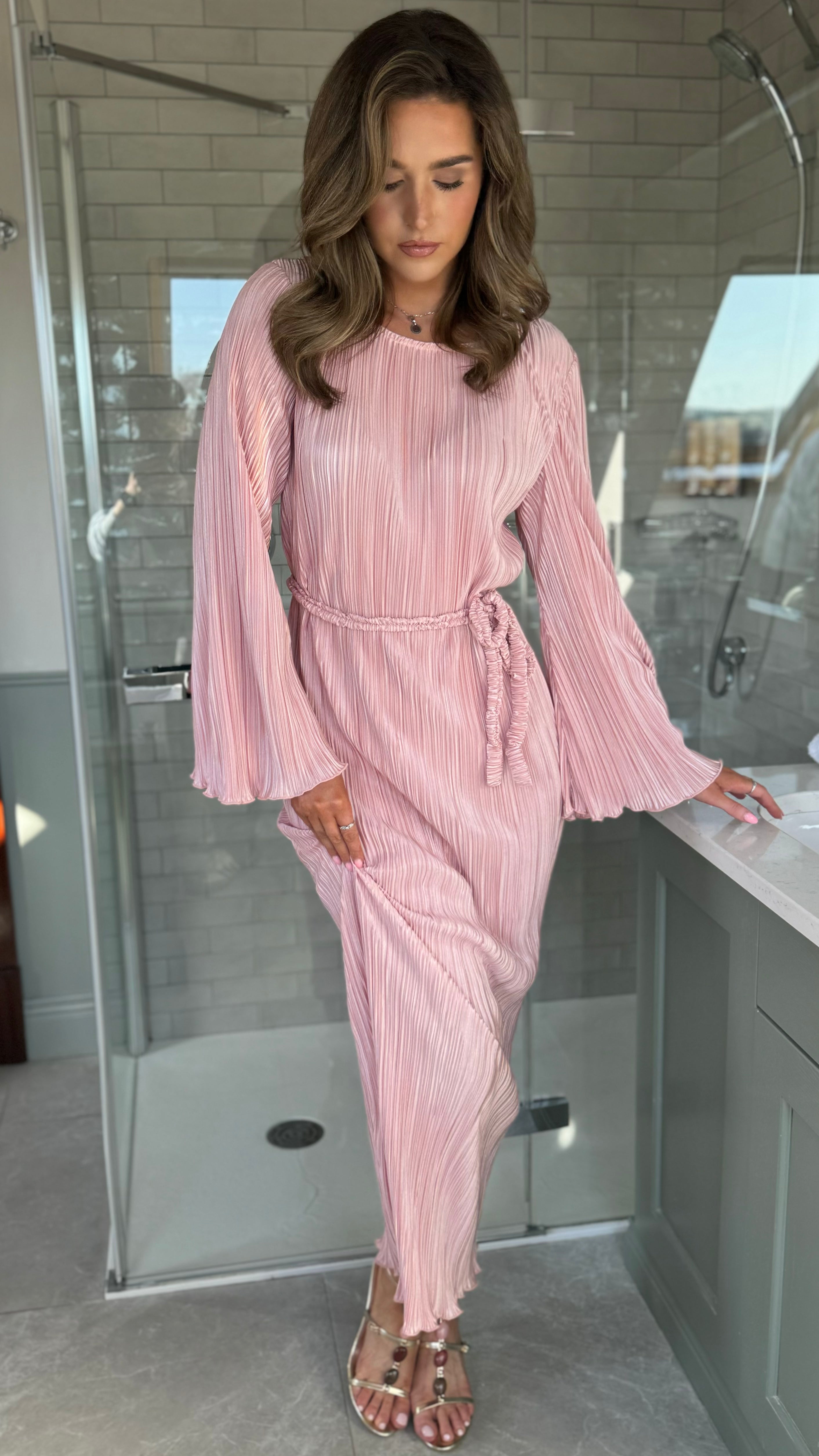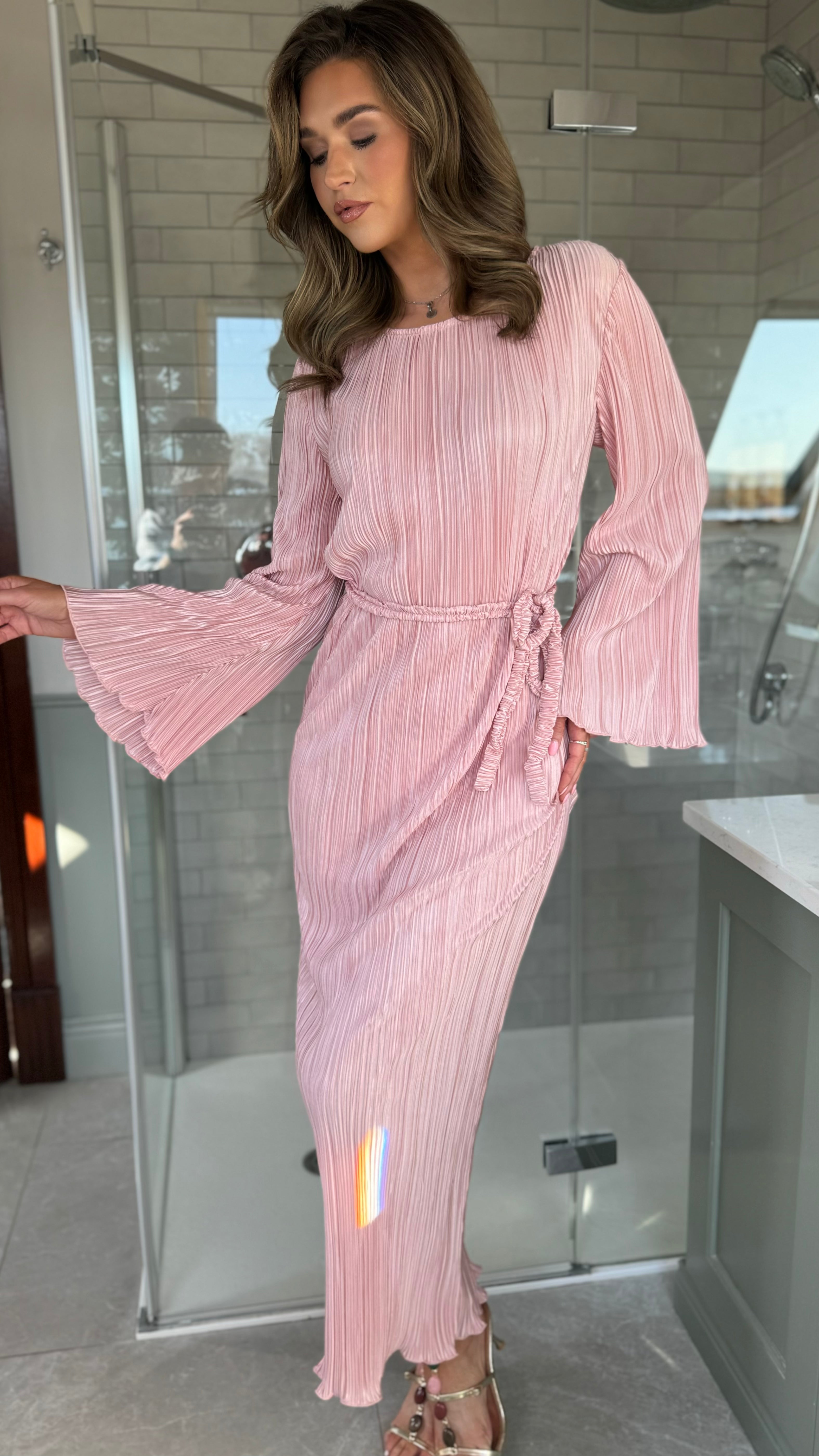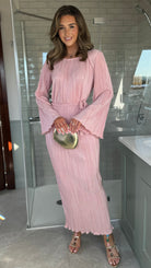 Tyler Pink Plisse Long Sleeve Midi Dress