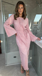 Elevate your everyday wardrobe with this Tyler Pink Plisse Long Sleeve Midi Dress. Crafted from luxurious plisse fabric, this piece features a flattering round neckline, delicate tie detail at the waist for a defined silhouette, and graceful flare sleeves that add movement and dimension. The midi length offers versatile styling for both casual and occasion wear. Perfect for creating an effortlessly polished look.