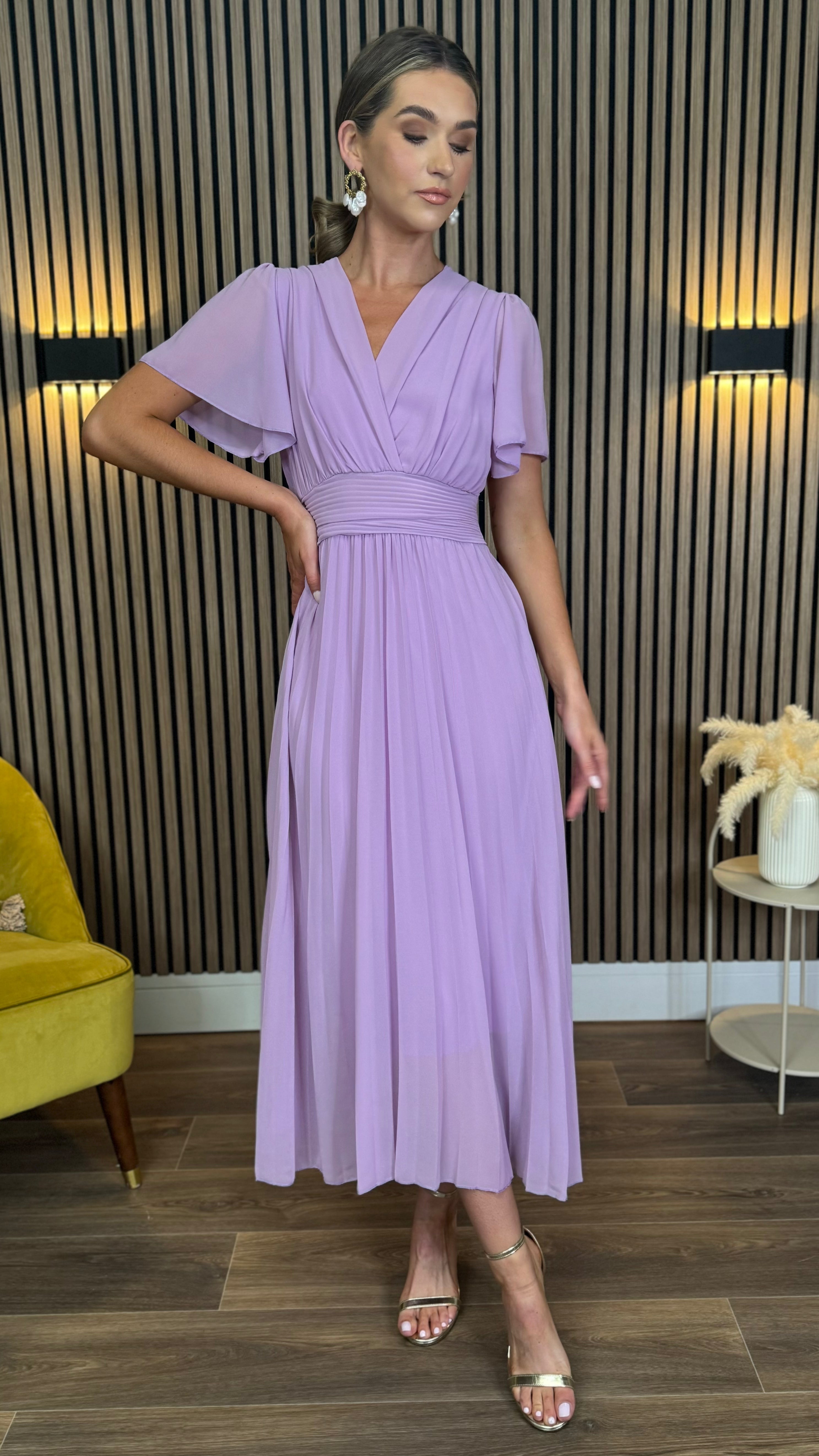 Get ready to make a statement in our Wavery Lilac Pleated V Neck Midi Dress. Featuring a unique pleated design and a playful v neck, this dress will add a touch of quirkiness to your wardrobe. Perfect for any occasion, this dress will have you feeling confident and stylish!