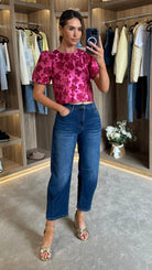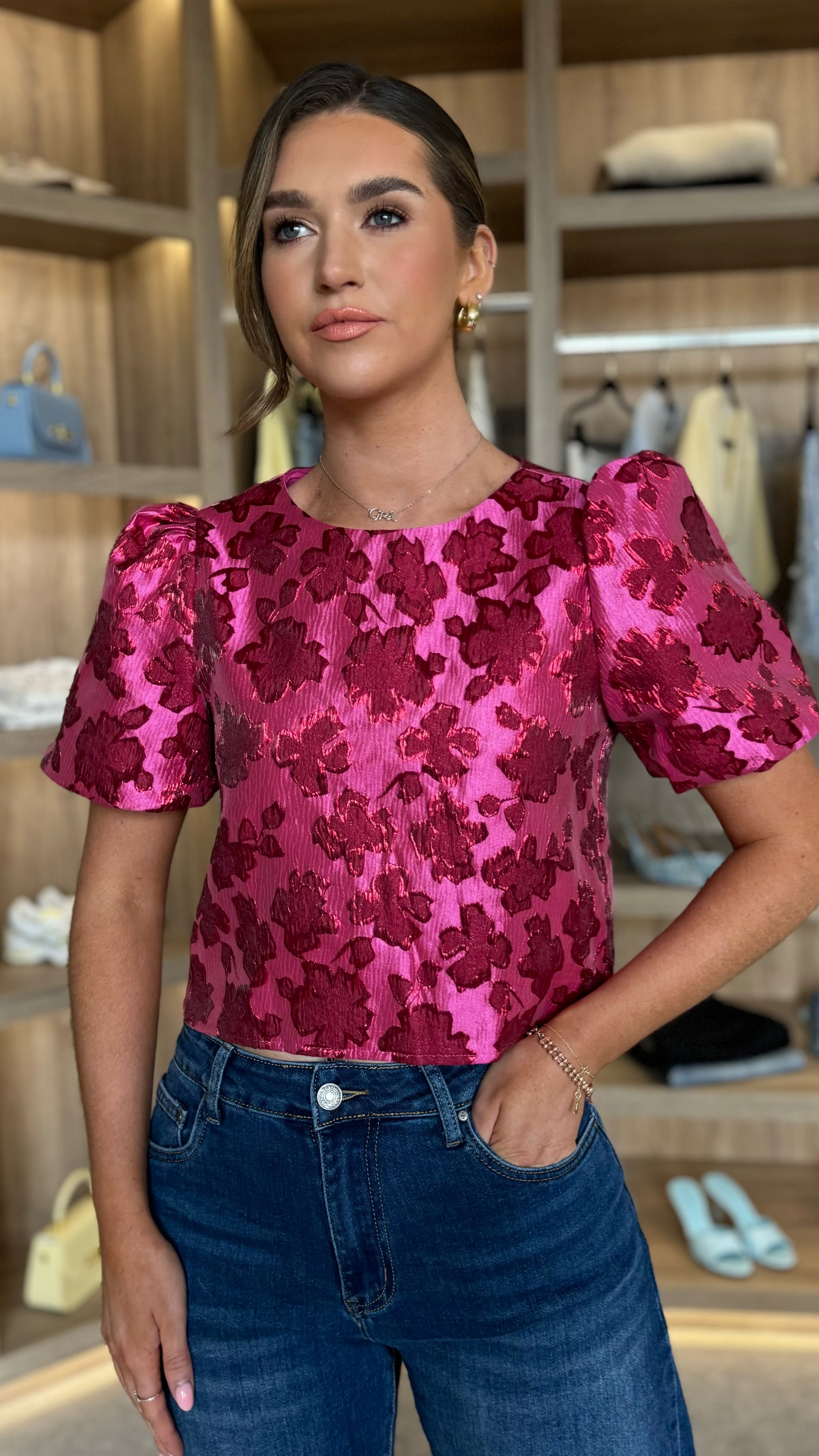 Adeline Pink Floral Brocade Puff Sleeve Top
