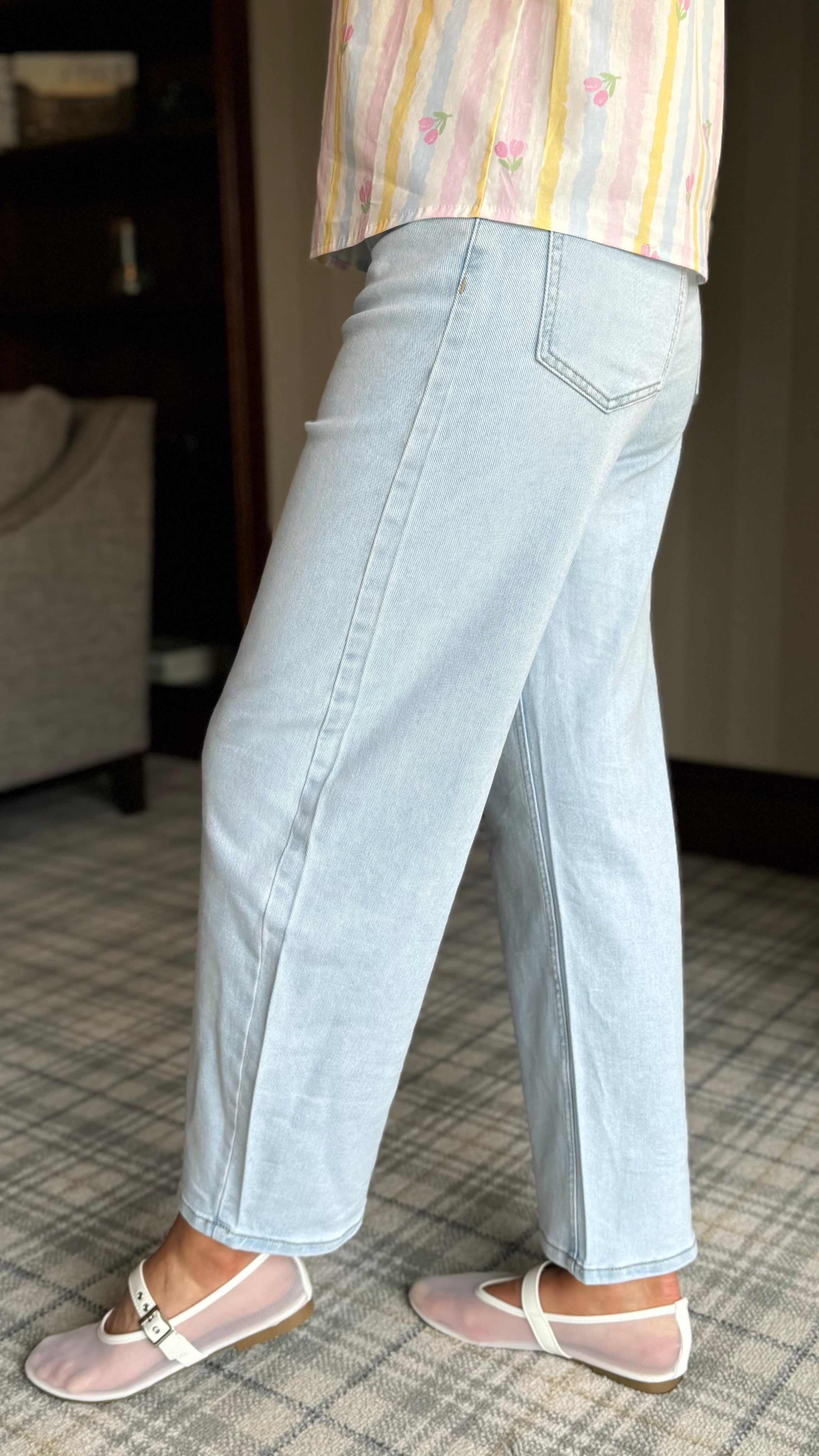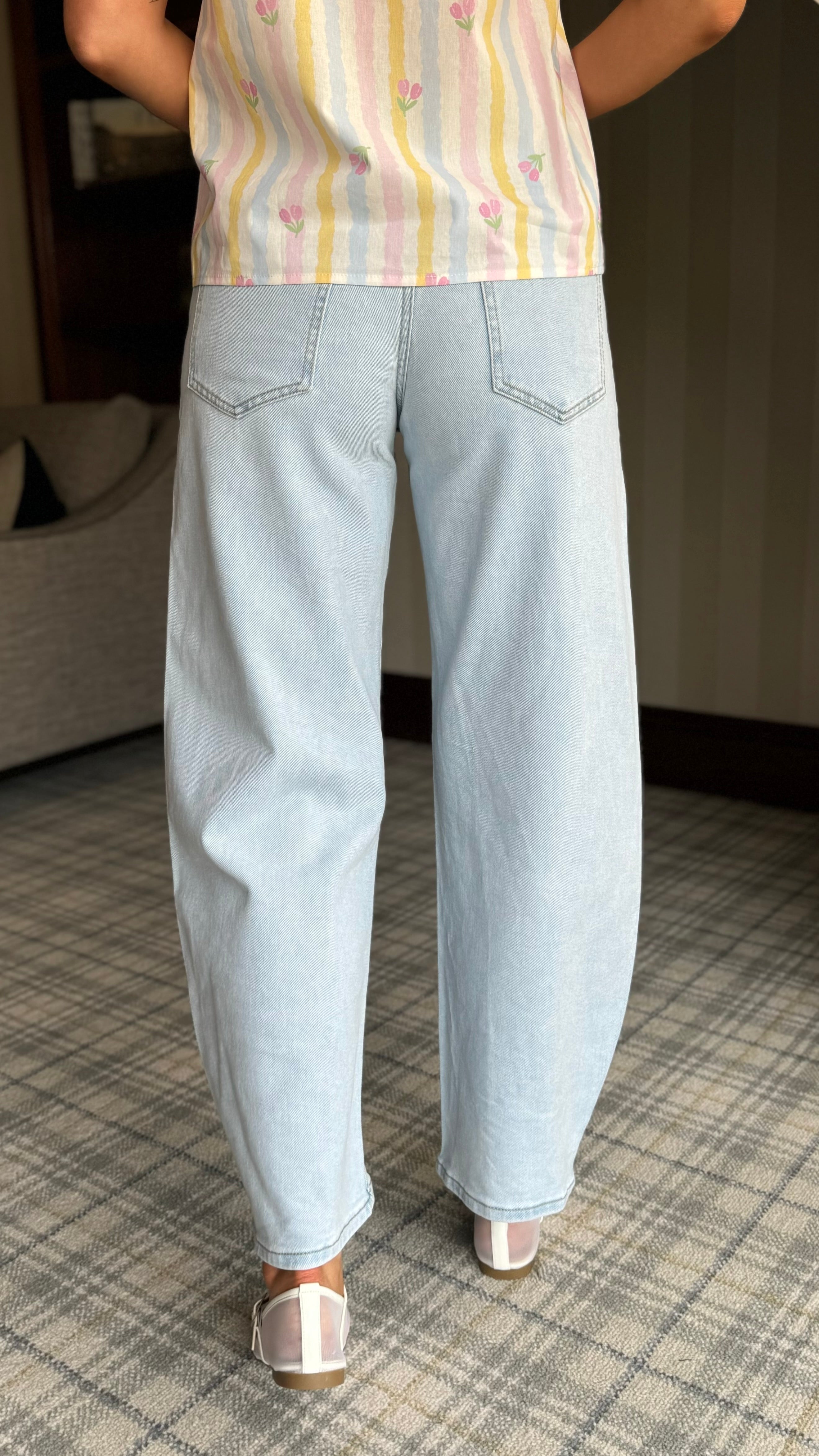 Add a pop of playful style to your wardrobe with our Afric Light Blue Barrel Leg Jeans. These unique jeans feature a flattering barrel leg cut and a bold light blue color that will make a statement. Perfect for anyone looking to add some fun to their denim collection.