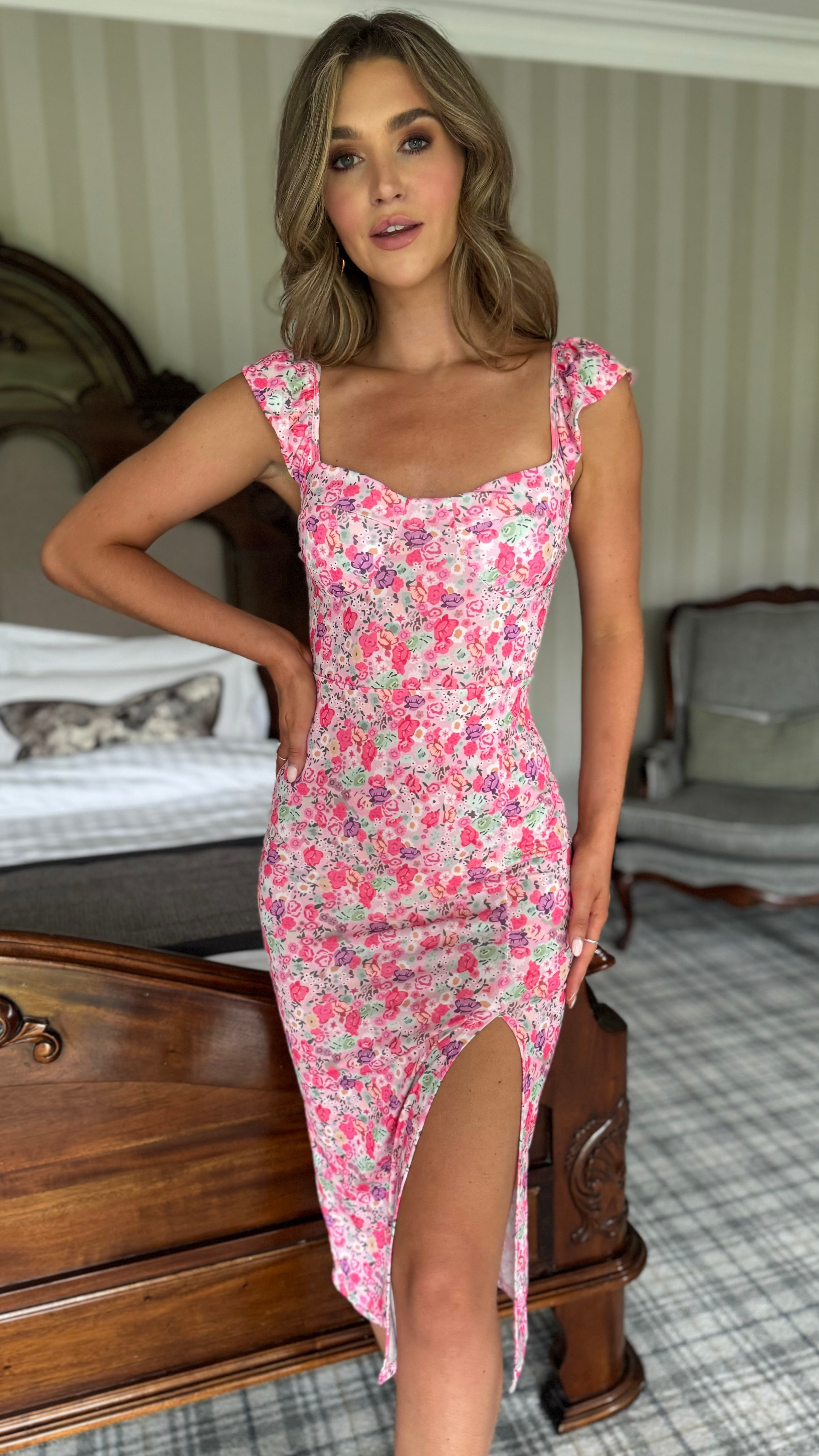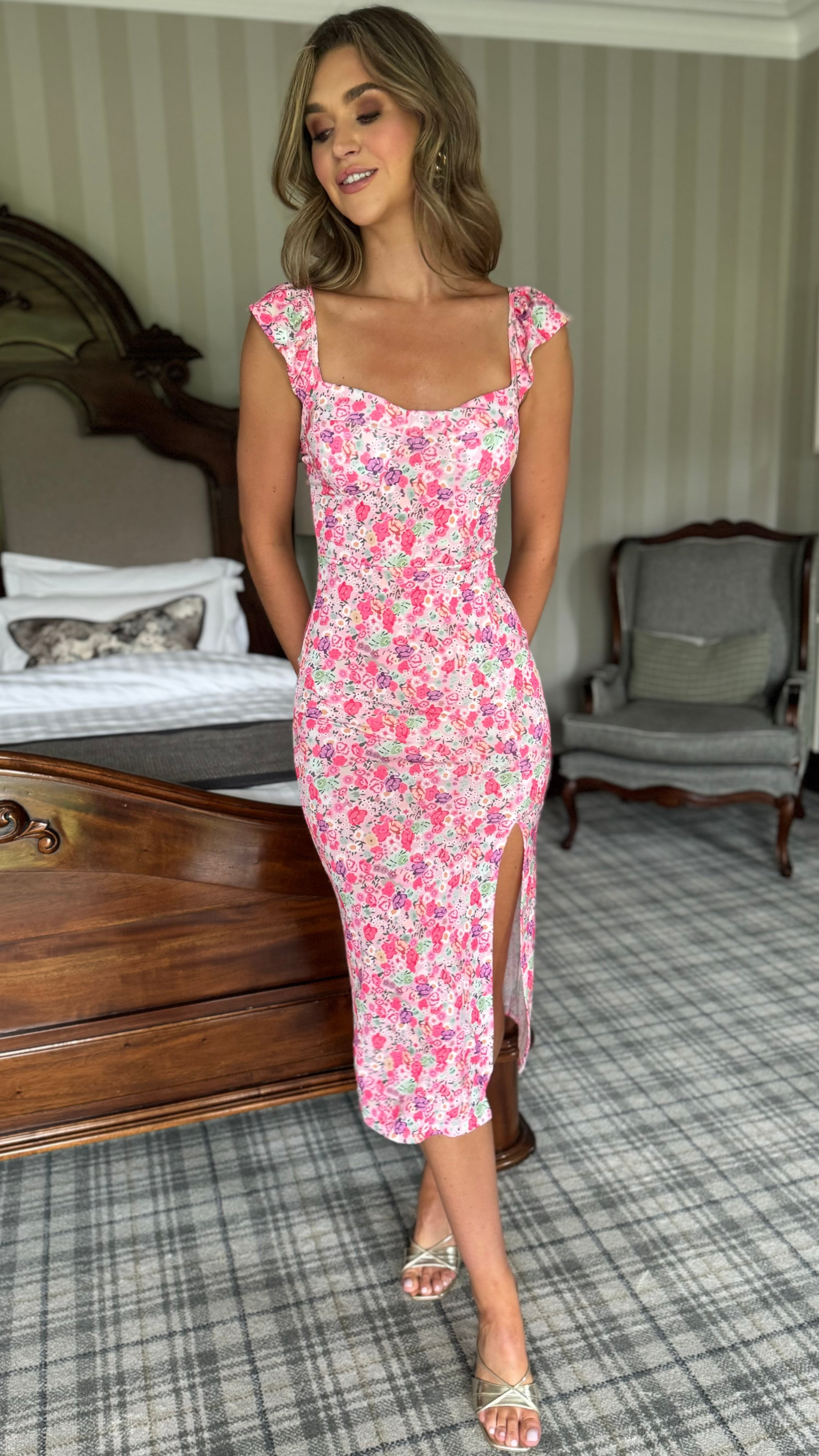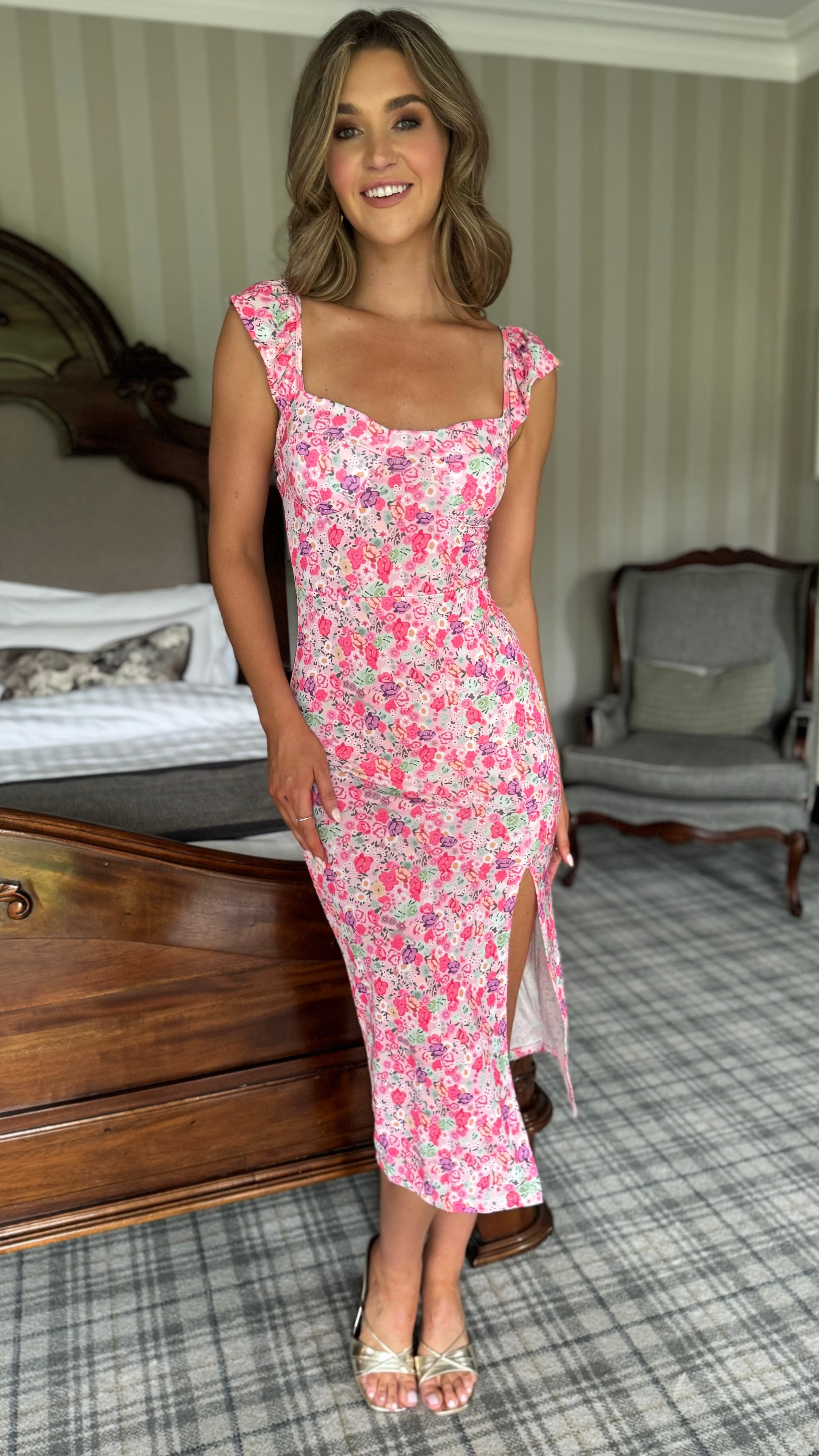 Alina Baby Pink Rose Detail Frill Sleeve Cupped Slit Midi Dress