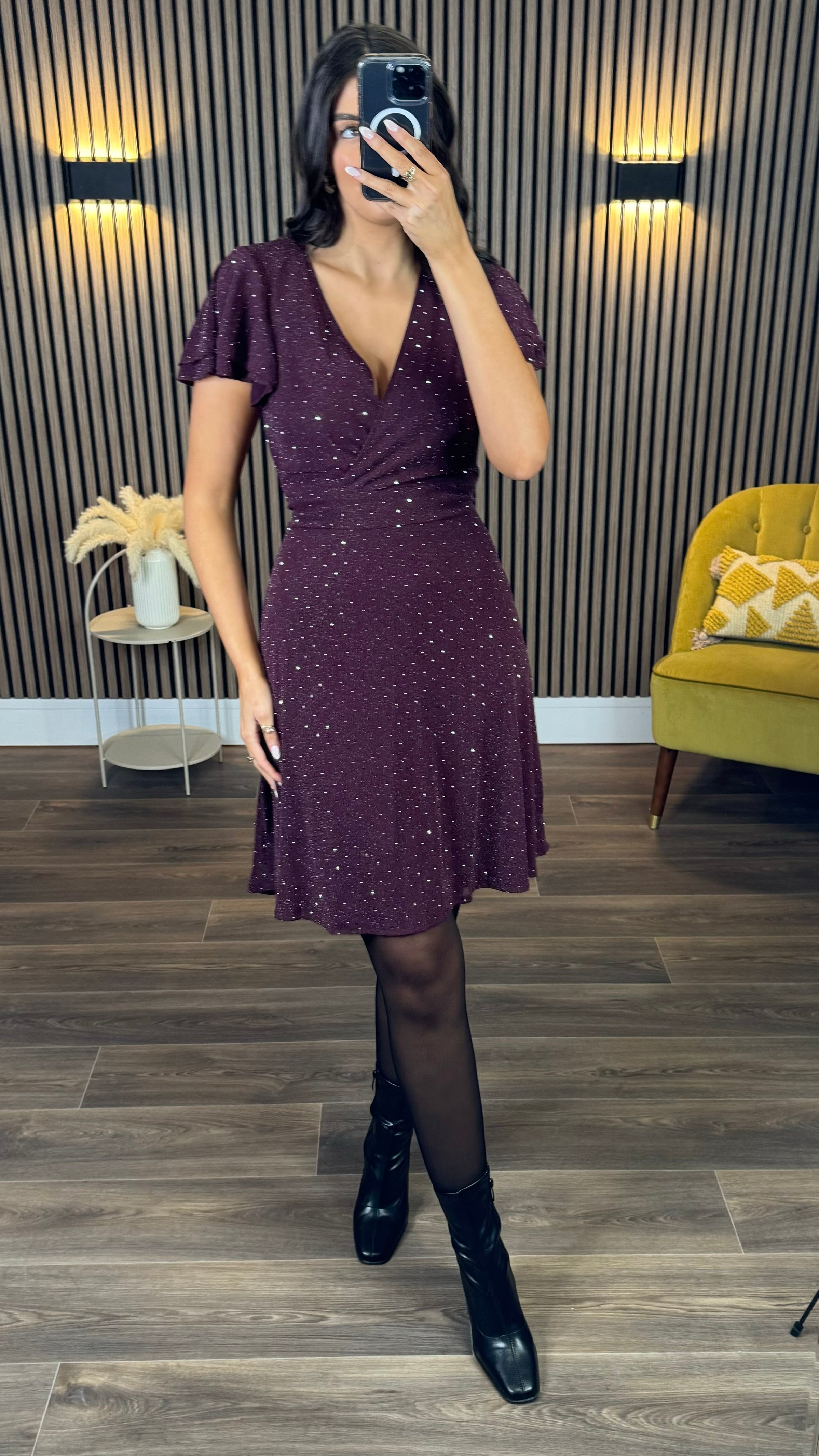 Angie Burgundy Flutter Sleeve Diamante Faux Wrap Mini Dress