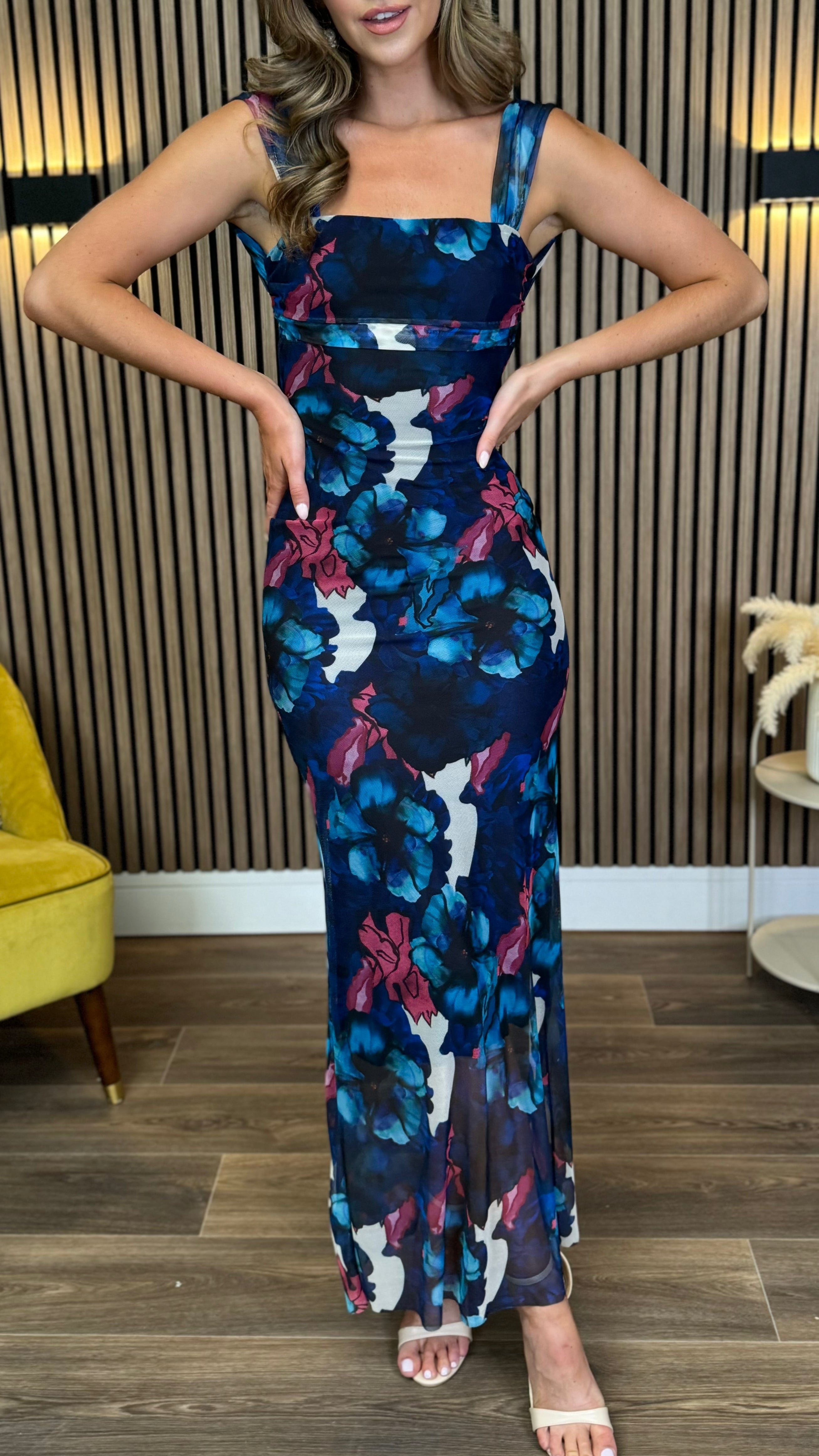 Bianca Blue Floral Backless Tie Detail Midi Dress